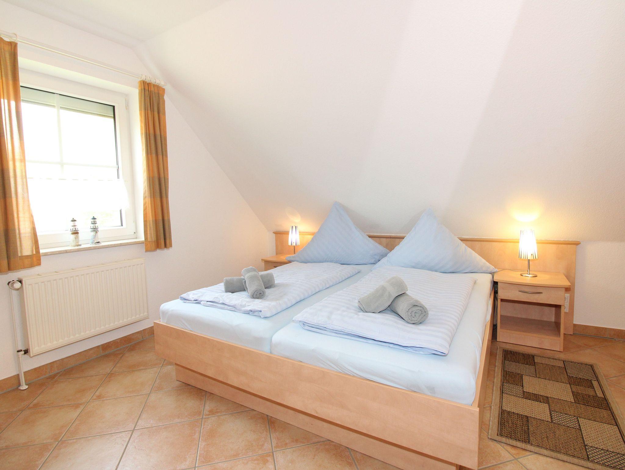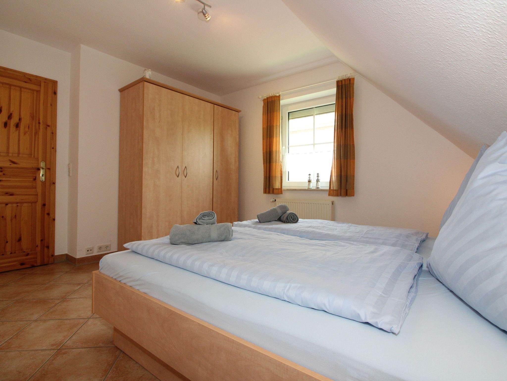 ein Schlafzimmer mit Doppelbett und Schrank im 1. Obergeschoss