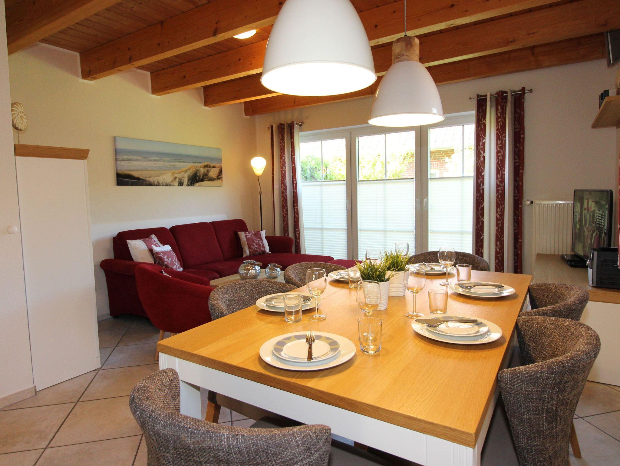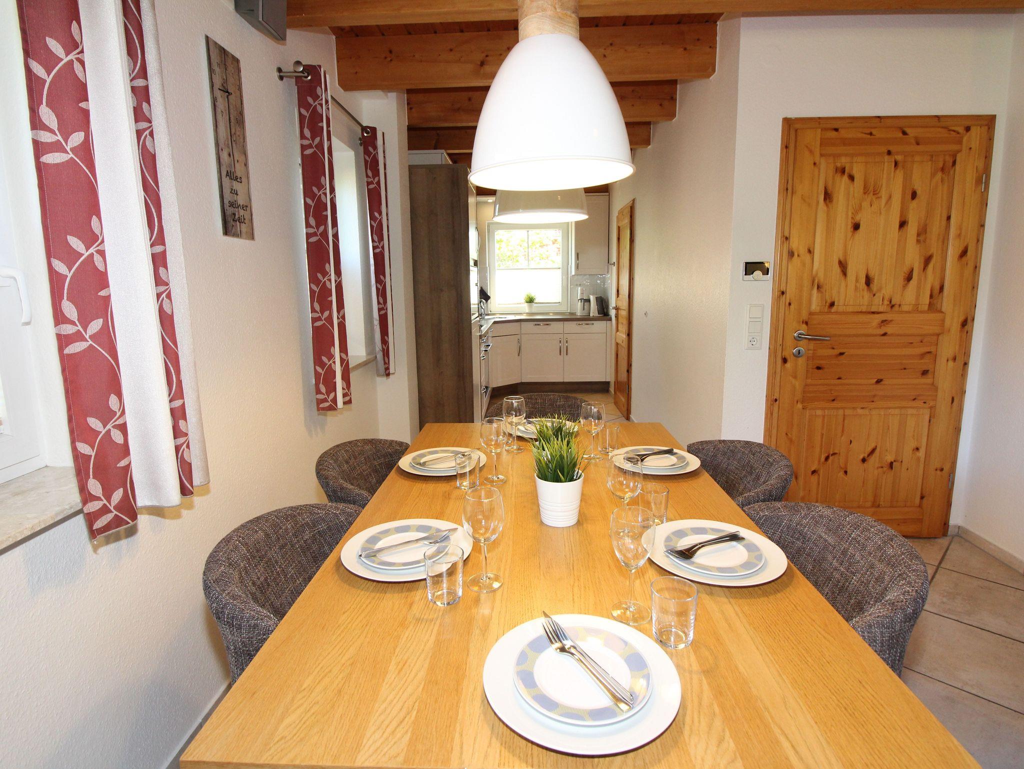 Im EG befindet sich die gut ausgestattete Einbauküche mit sich anschließendem Wohn-/Esszimmer mit Esstisch für bis zu 6 Personen. Die Küche bietet: Spülmaschine, Mikrowelle, Backofen, Ceranfeld, Kühlschrank mit Gefrierfach, Kaffeemaschine + Senseo Maschine, Backutensilien u.v.m.