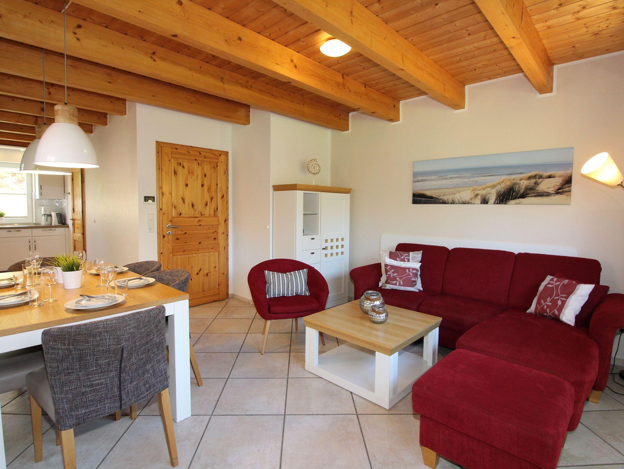 Die Terrasse liegt Richtung Südwesten. Dort sind Gartenmöbel mit Auflagen, ein Strandkorb sowie ein Grill vorhanden. Sie können bis in die Abendstunden die Sonne genießen.