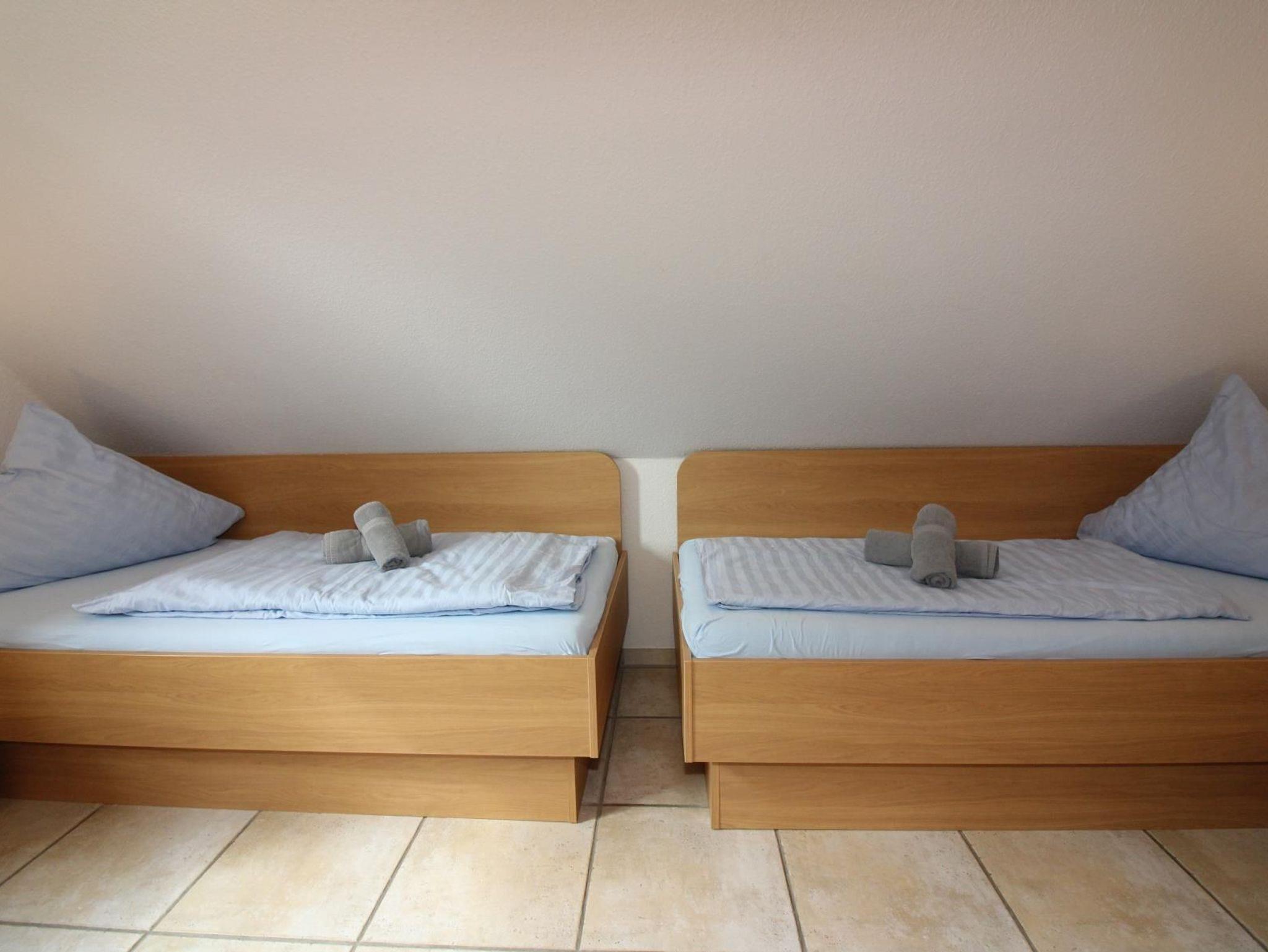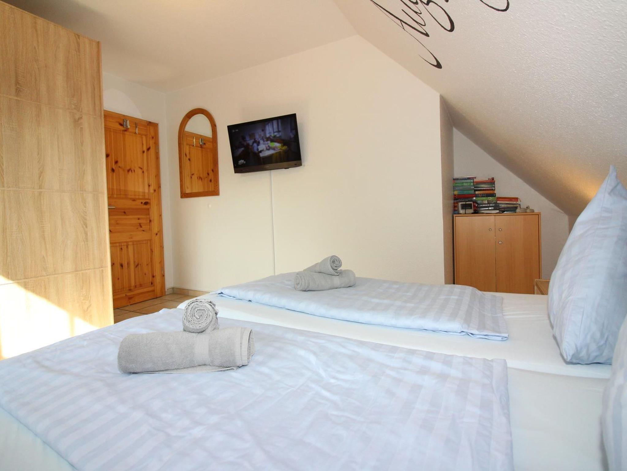 Im Kinderzimmer sind zwei Einzelbetten mit Nachtkonsolen, Schrank sowie einem Sideboard mit Flachbild-TV.