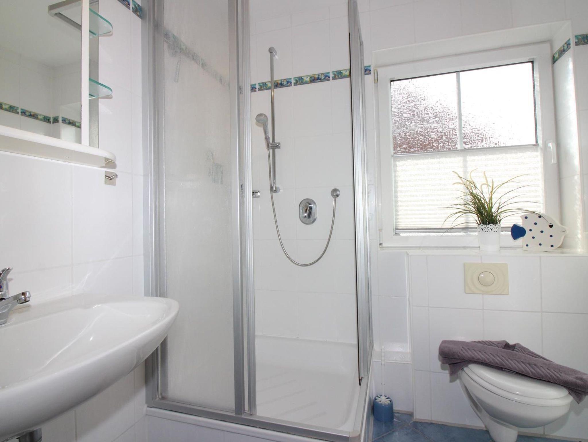 Im Bad mit Fenster finden Sie ein WC und WC-Aufsatz, Waschbecken, Dusche, Waschmaschine, Trittschemel, Handtuchheizkörper und Fön.