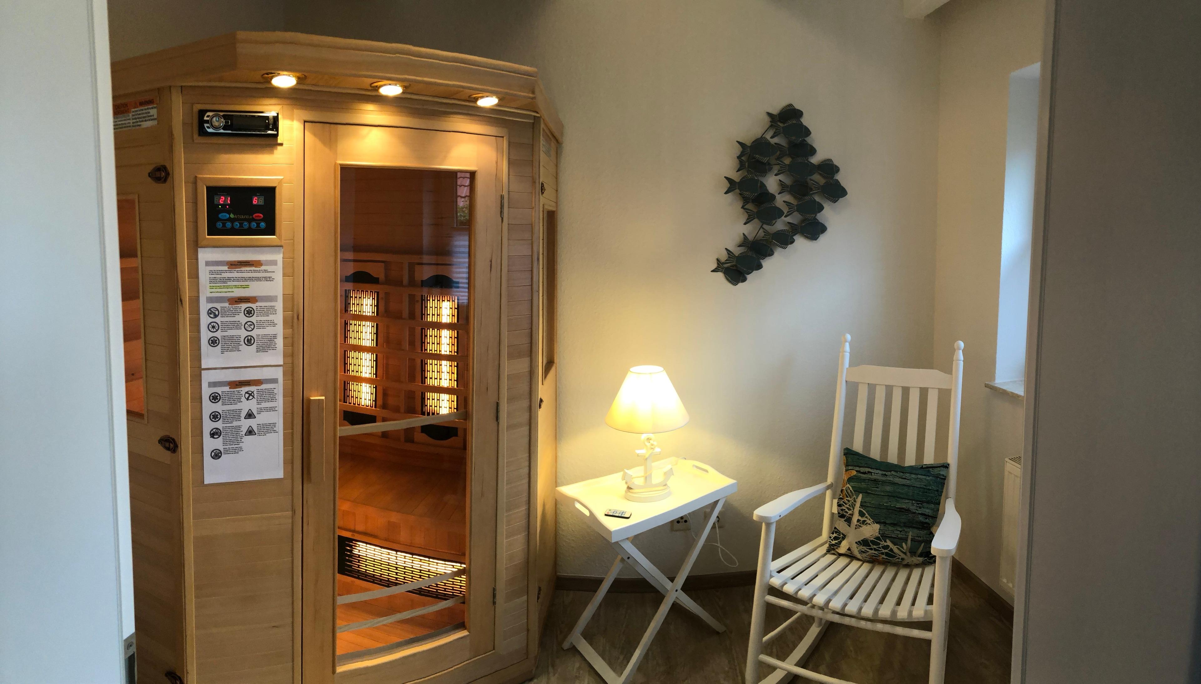 Ein besonderes Highlight ist das Wellness Zimmer im Erdgeschoss. Hier steht eine Infrarotwärmekabine für 2 Personen zur Verfügung in der man sich an kalten Tagen oder nach einem windigen Spaziergang am Strand entspannen und aufwärmen kann. Auch dieses Fenster verfügt über ein Insektenschutzgitter. Bitte beachten Sie unbedingt die Hinweise zur Benutzung und Sicherheit in unserem Hausordner.