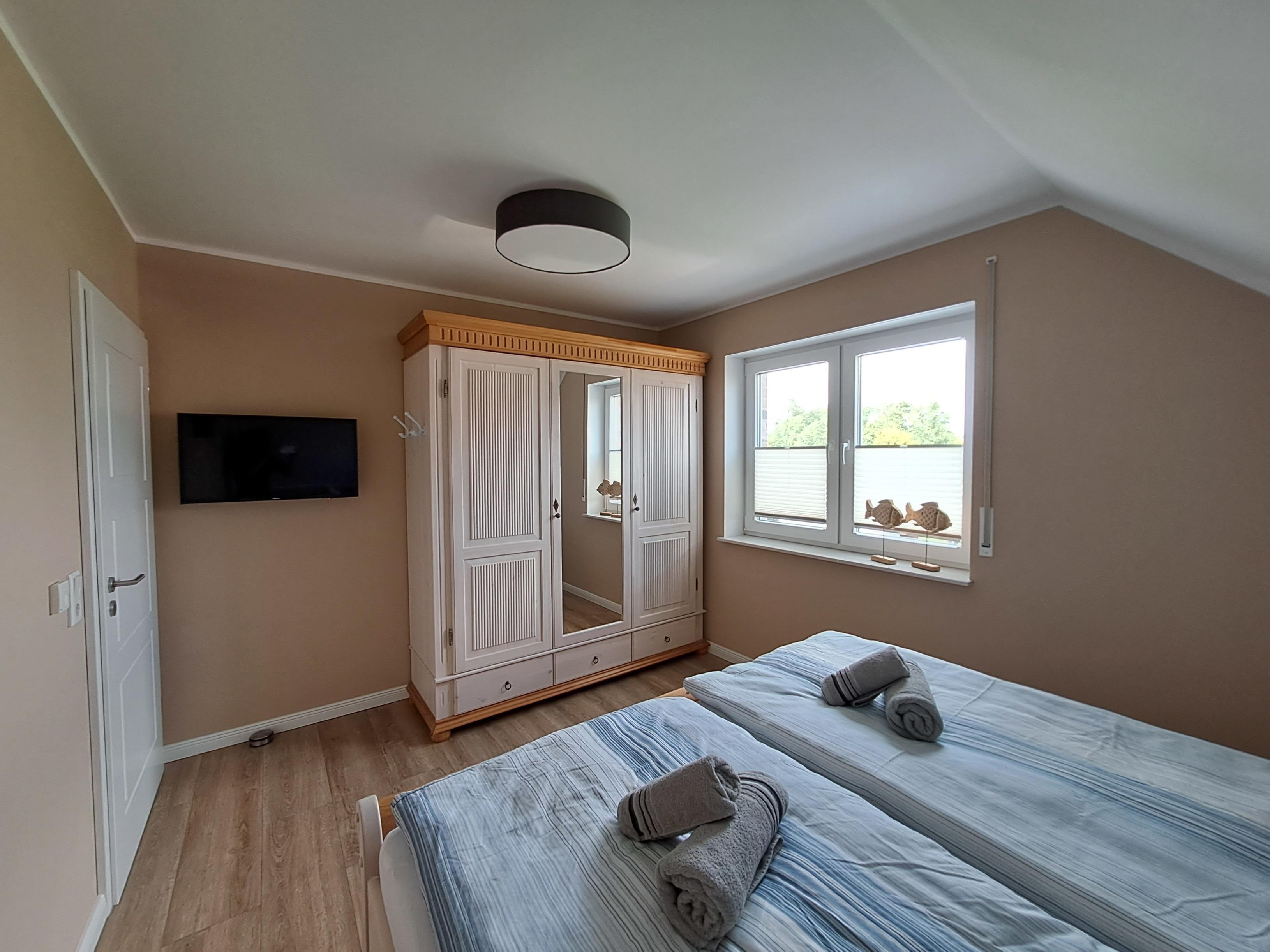 Im OG befinden sich 2 Schlafzimmer mit Doppelbetten(180x200), Smart TV und viel Stauraum. Ein weiteres Schlafzimmer verfügt über zwei Einzelbetten (100x200) .In allen Schlafzimmern befindet sich ein Insektenschutz.Das moderne Tageslichtbad besticht durch eine große begehbare Rainshowerdusche, Badewanne und einen Doppelwaschtisch. Zusätzlich befindet sich im EG ein zweites Bad mit WC und begehbarer Rainshowerdusche.
