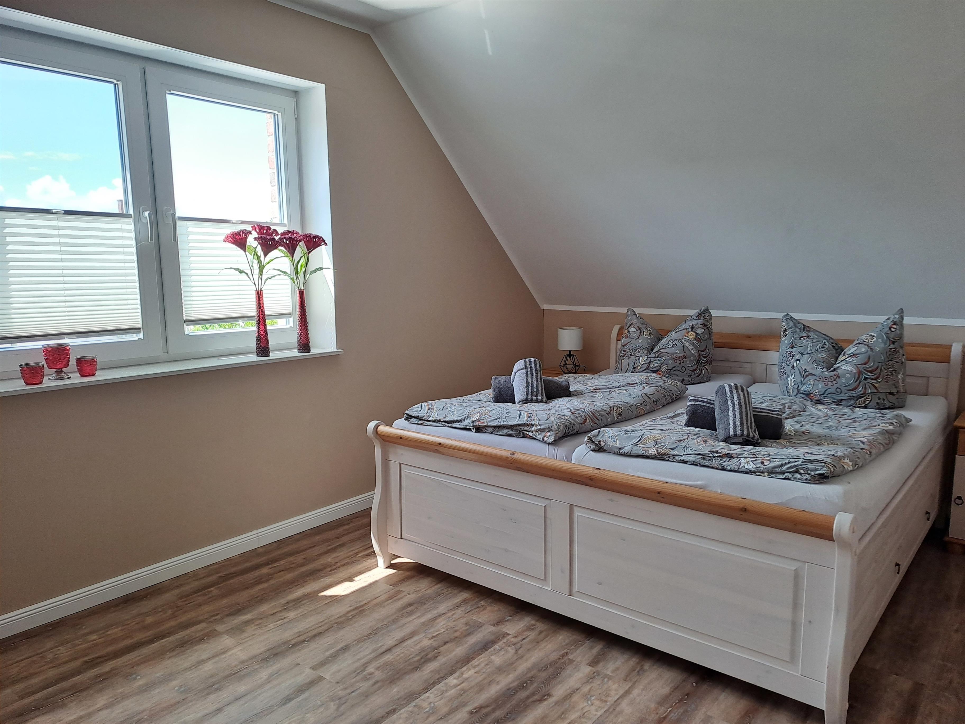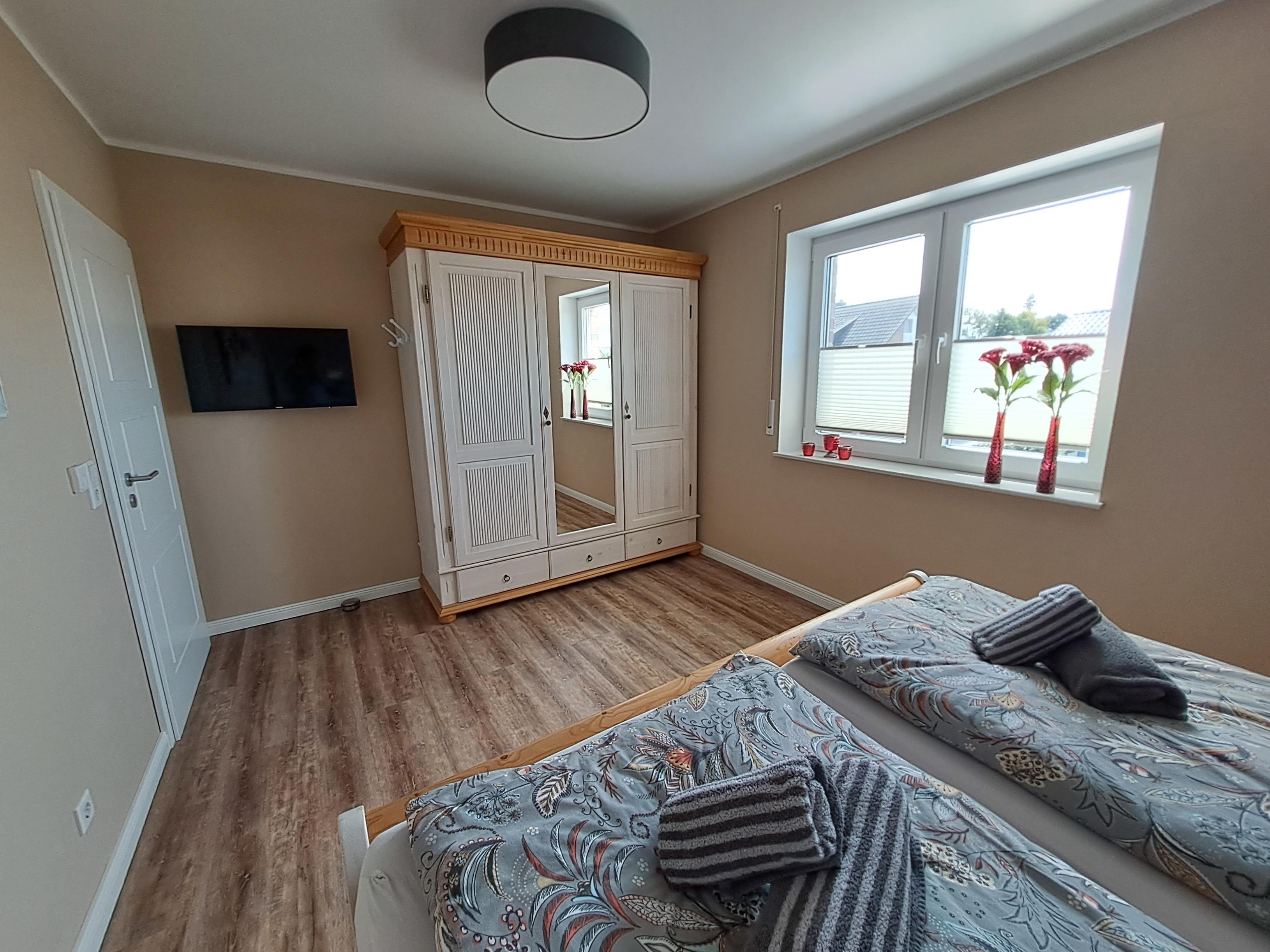 Im OG befinden sich 2 Schlafzimmer mit Doppelbetten(180x200), Smart TV und viel Stauraum. Ein weiteres Schlafzimmer verfügt über zwei Einzelbetten (100x200). In allen Schlafzimmern befindet sich ein Insektenschutz. Das moderne Tageslichtbad besticht durch eine große begehbare Rainshowerdusche, Badewanne und einen Doppelwaschtisch. Zusätzlich befindet sich im EG ein zweites Bad mit WC und begehbarer Rainshowerdusche.