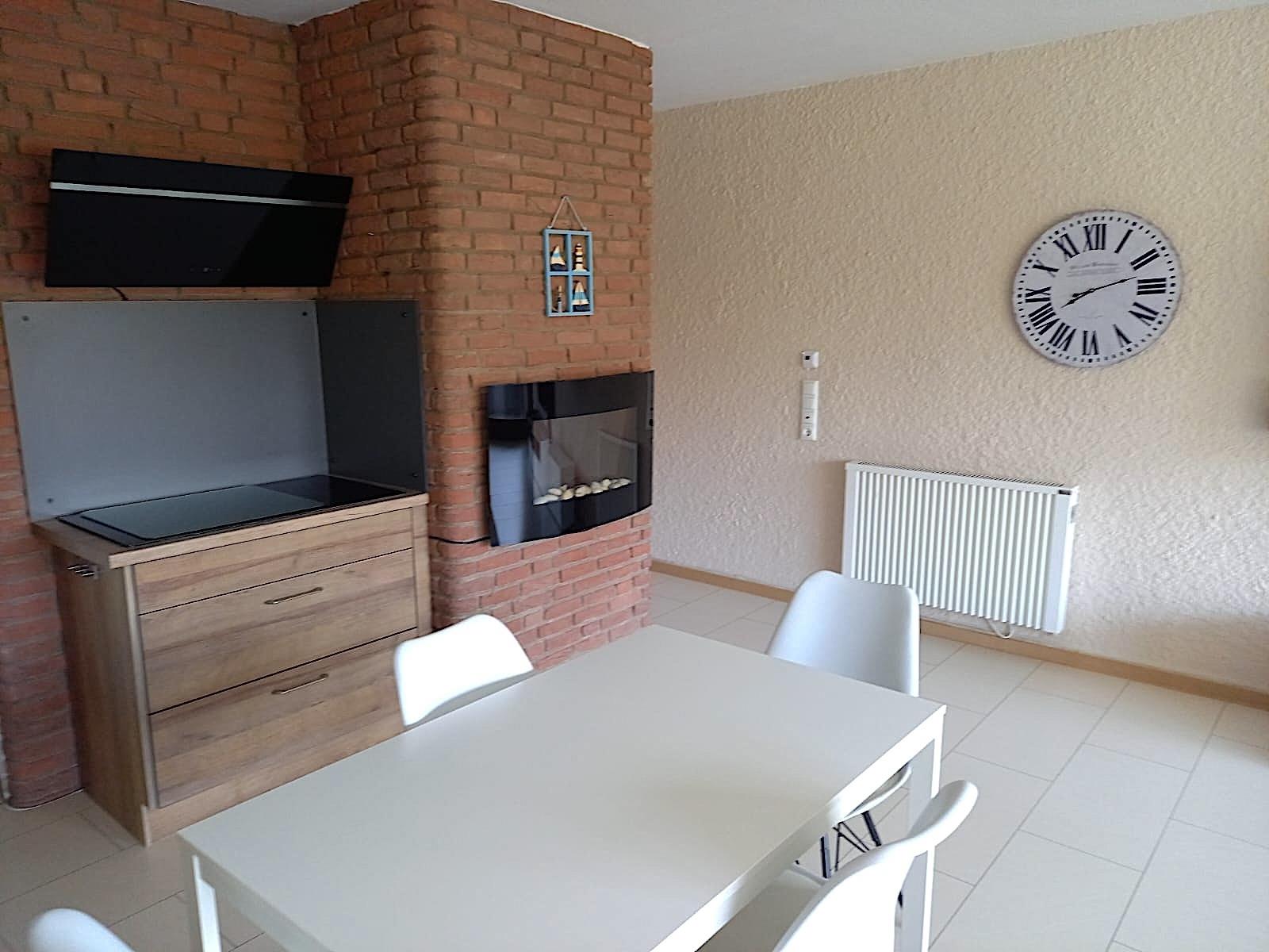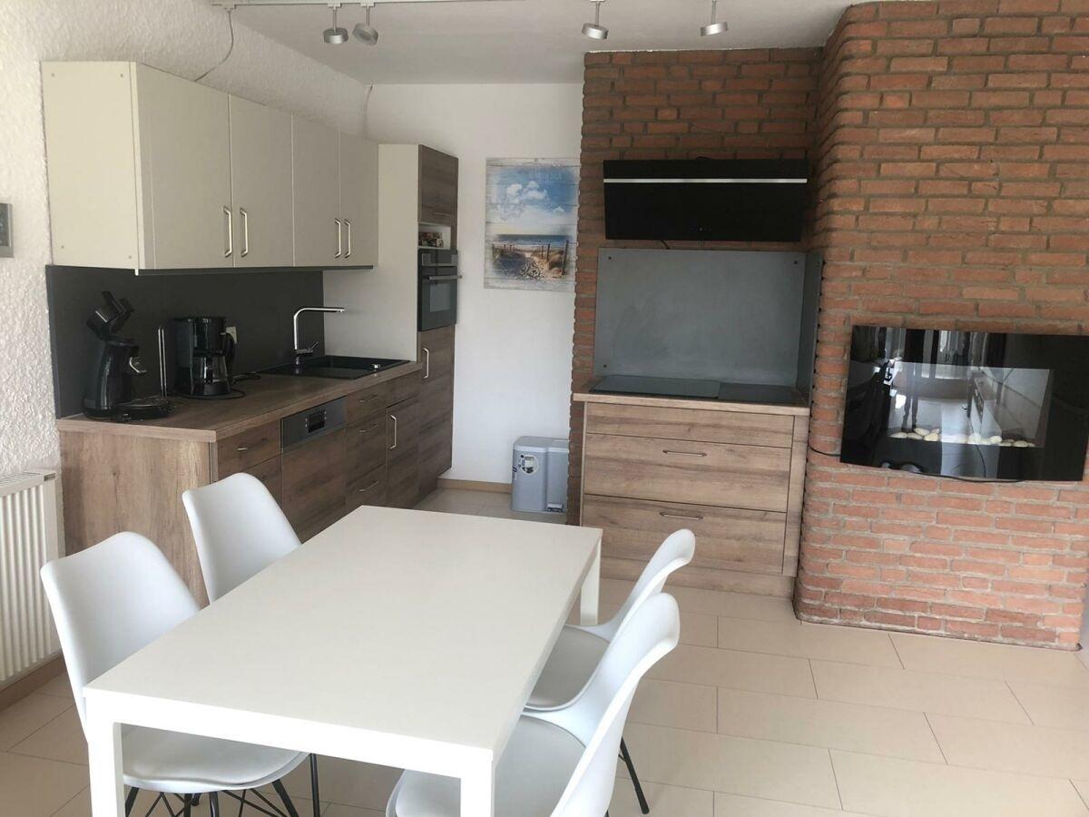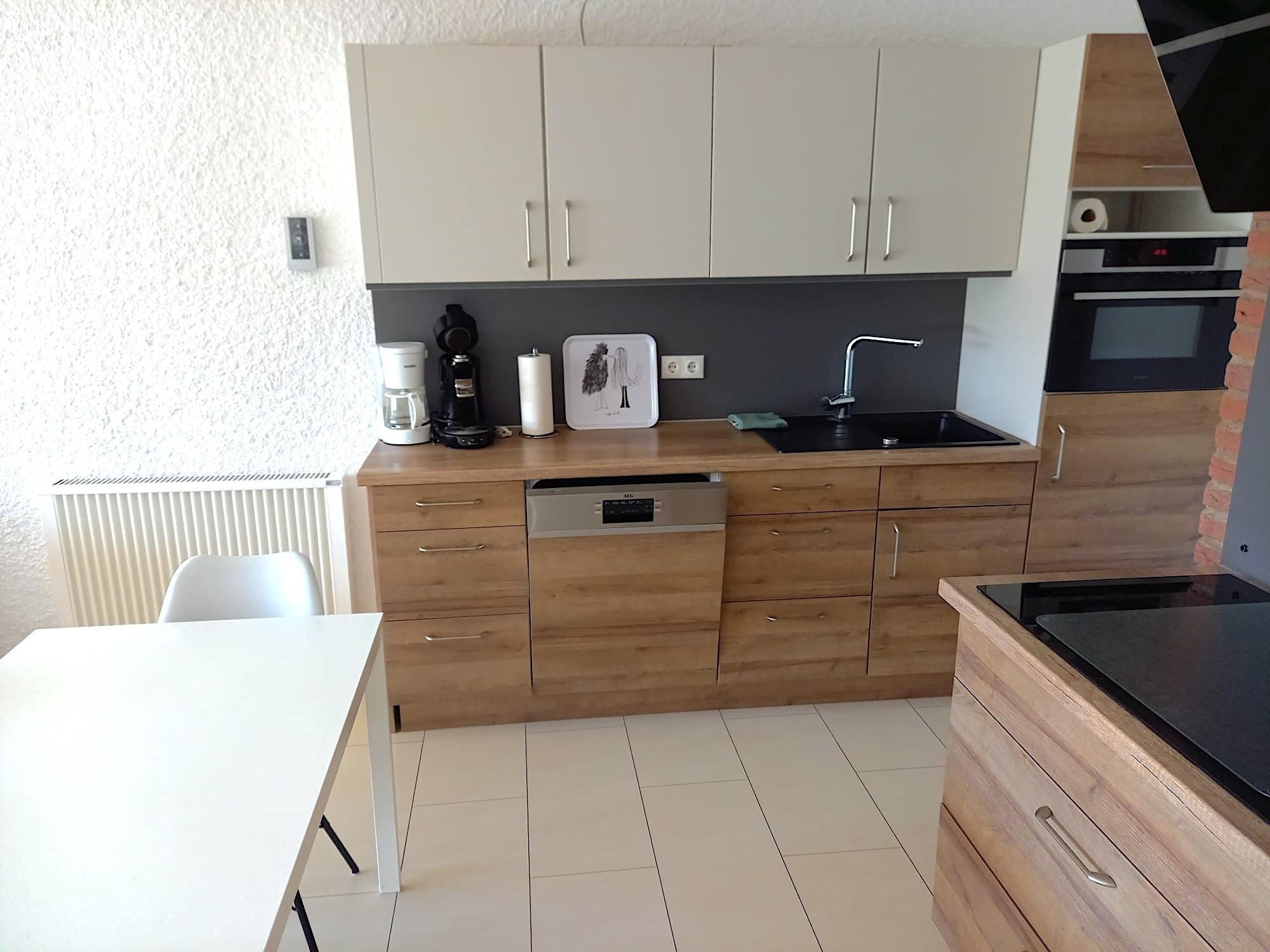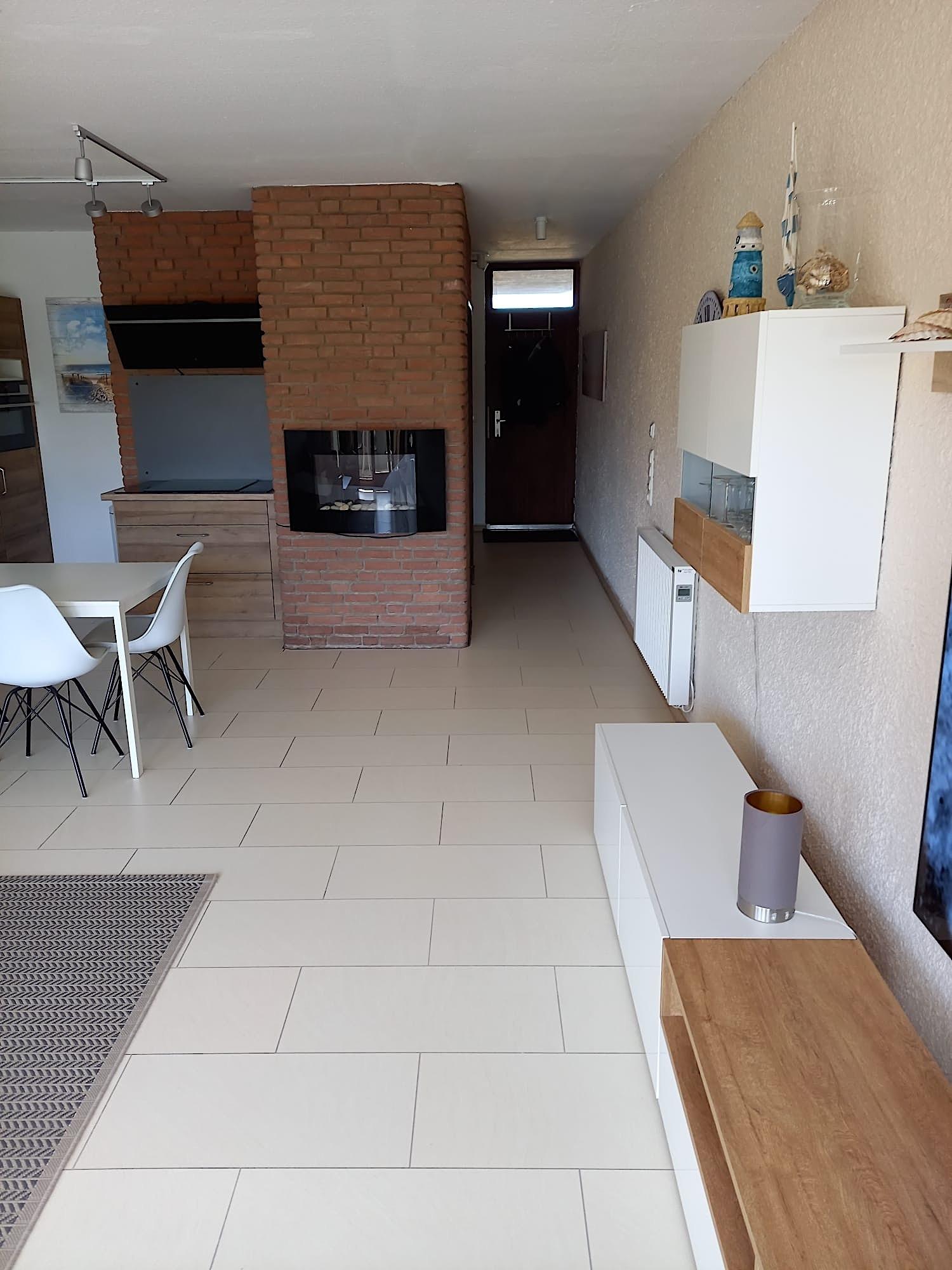 Das Apartment (52qm) bietet einen großzügigen Wohnbereich mit Laminatfußboden in Fliesenoptik, eine offene Küche und eine Essecke. Auf einem Schlafsofa zum Aufklappen mit Lattenrost (140 x 200) im Wohnbereich finden bis 2 Personen gemütliche Nachtruhe. Bei schlechtem Wetter gibt es Fernsehen in HD, Bücher und Gesellschaftsspiele. Ein Notfall- u. Verbandskasten ist vorhanden.