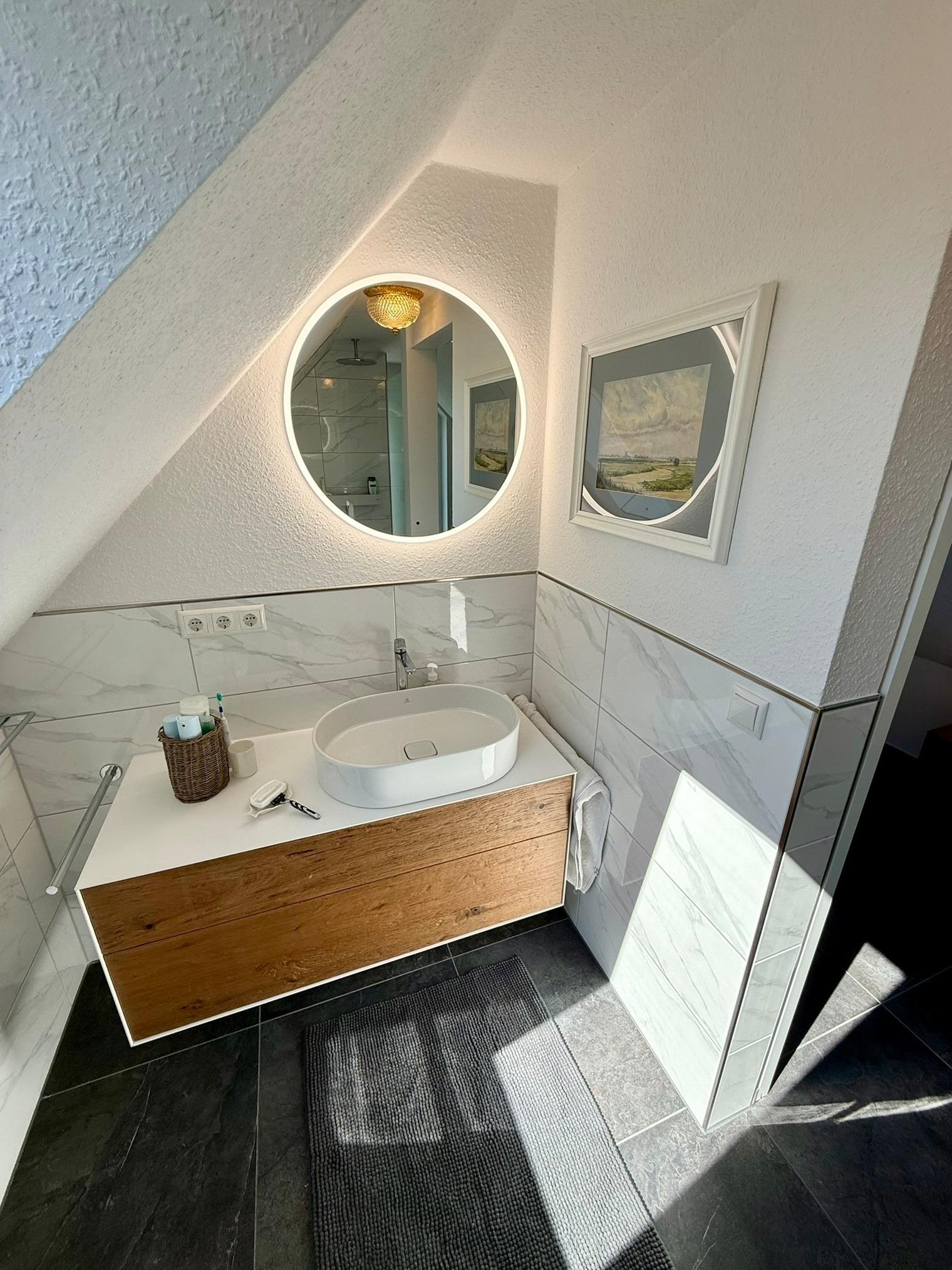 - Schickes Badezimmer mit großer Dusche und Waschtrockner