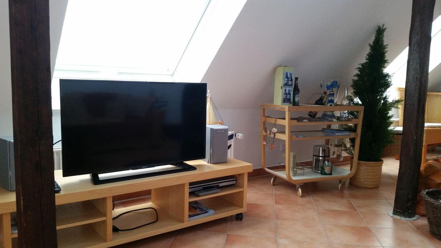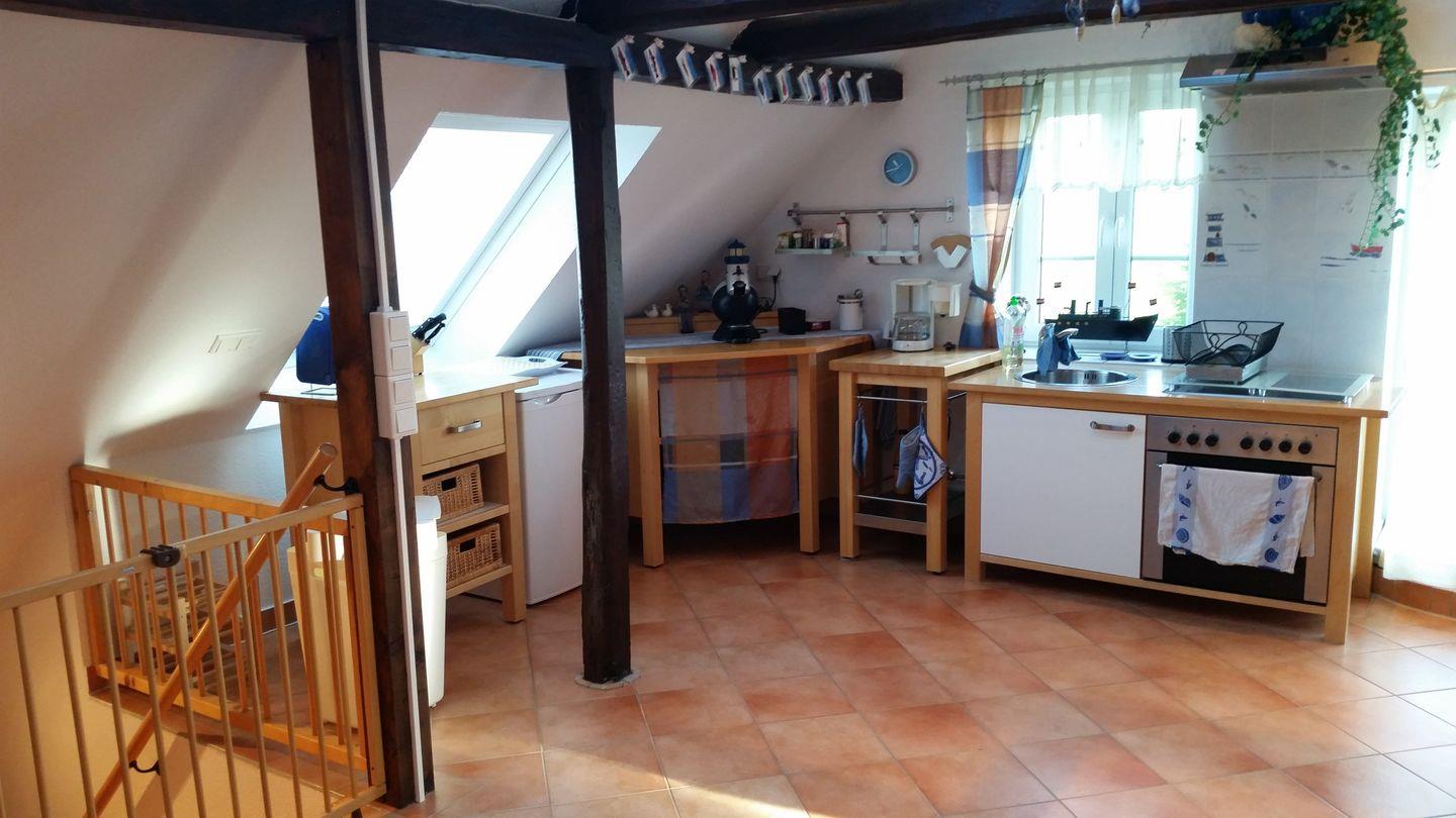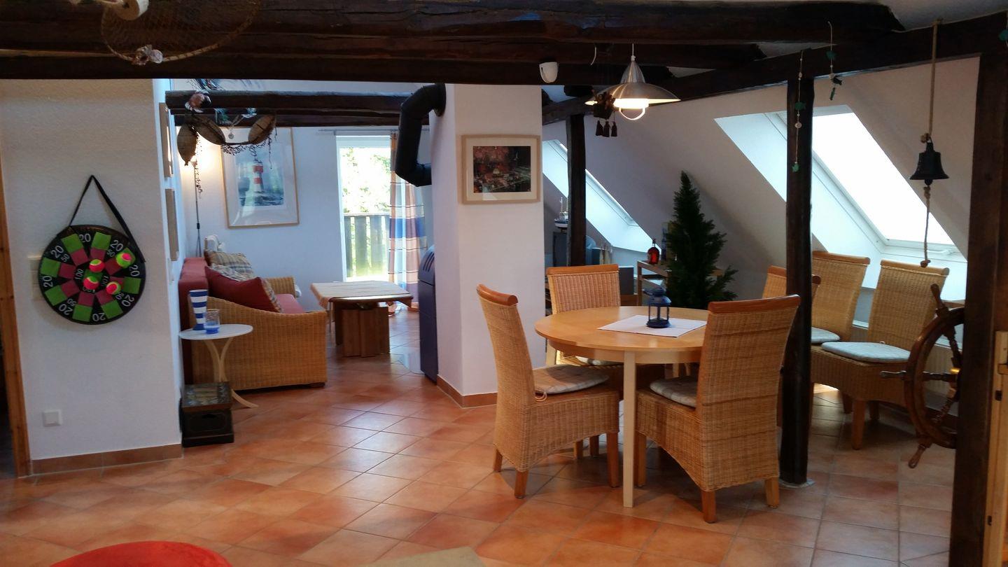 Die Wohnung ist für bis zu 2 Personen (auf Anfrage auch mit 1 Hund) geeignet. Der Treppenaufgang, der mit einer Kinder-Sicherheitstür ausgestattet ist, endet in den mehr als großzügigen Wohn- ,Ess- und Kochbereich. Damit ist das Wohn- und Esszimmer der zentrale Treffpunkt in der Ferienwohnung und bietet allen Komfort, den Sie erwarten können. Eine gemütliche Couchecke garantiert entspannte Stunden vor dem Kaminofen und/oder bei einem (hoffentlich) interessanten Fernsehprogramm. Oder Sie entspannen bei einem spannenden Buch? Der Essbereich mit einem großzügigen Esstisch und entsprechend bequemen Stühlen befindet sich in unmittelbarer Nähe zur Kochecke. Ein Kühlschrank mit Gefrierfach, ein Ceranherd mit Backofen und vollständiges Geschirr und Besteck lässt wirklich keinen Wunsch offen. Kaffeemaschine, Wasserkocher, usw. runden das Angebot komplett ab! Und zur Ruhe und Erholung lädt auch der großzügige und von den Nachbarn nicht einsehbare Balkon ein, den Sie sowohl über das Wohnzimmer als auch über das Schlafzimmer erreichen können. Diese Ferienwohnung kann man wirklich als absolut gehobene Ausstattung am besten beschreiben.