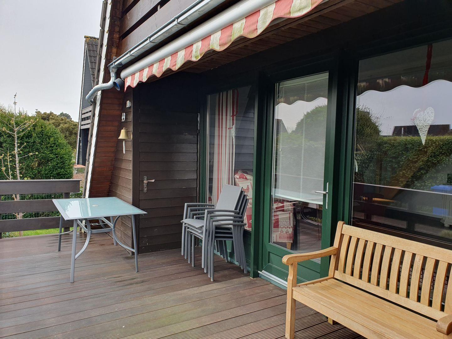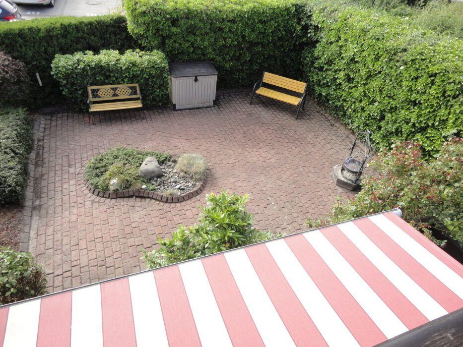 Zu dem Haus gehört ein PKW-Einstellplatz, eine Terrasse und ein Rasengrundstück.