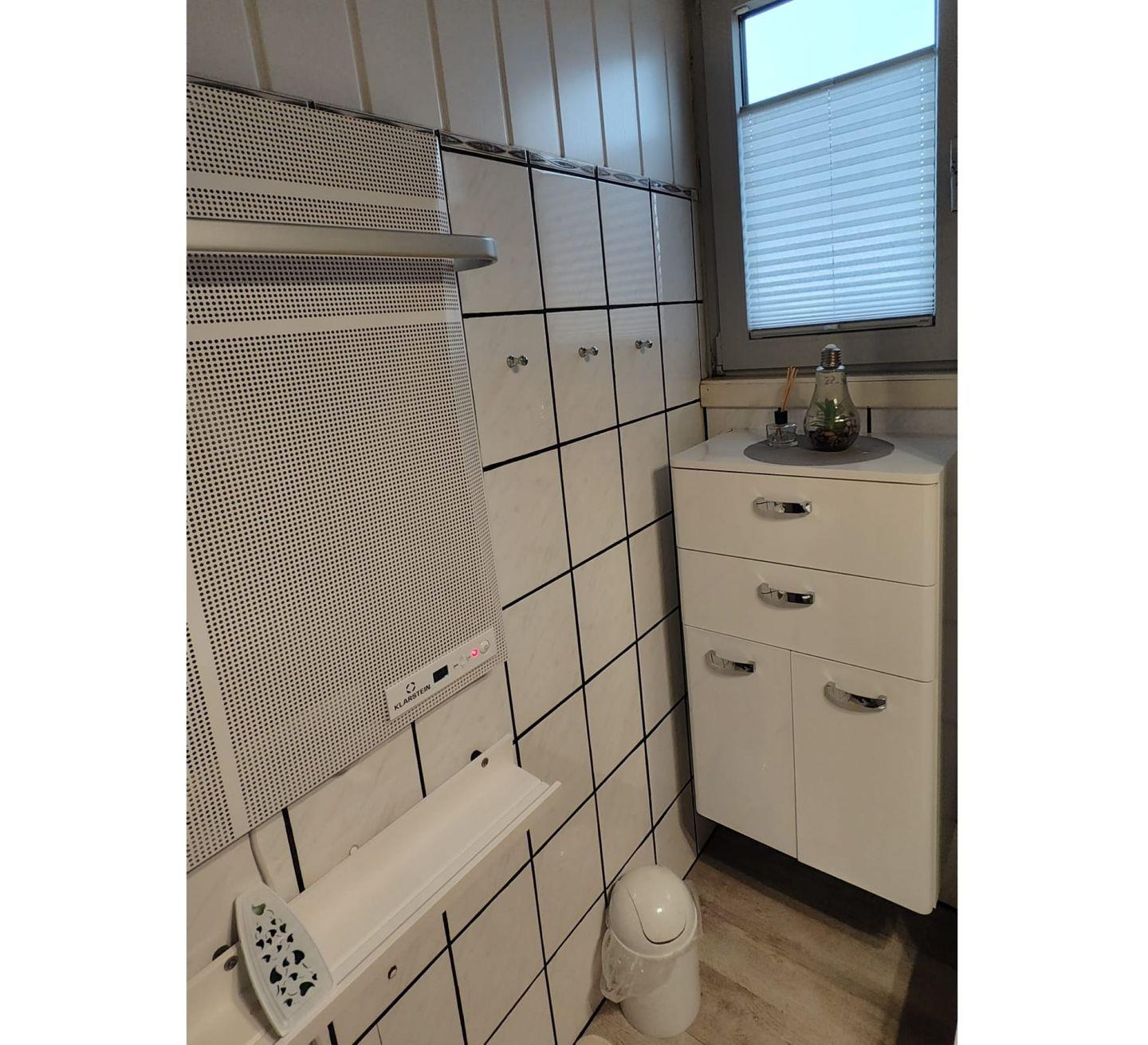 Ein modernes Badezimmer mit Dusche (mit Wanne), Kosmetikspiegel und Haartrockner rundet den Wohnkomfort ab. Des Weiteren profitieren Sie von einer eigenen Waschmaschine und einem Trockner zur Alleinnutzung, Bügeleisen sowie Bügelbrett, sodass auch längere Aufenthalte komfortabel gestaltet werden können.