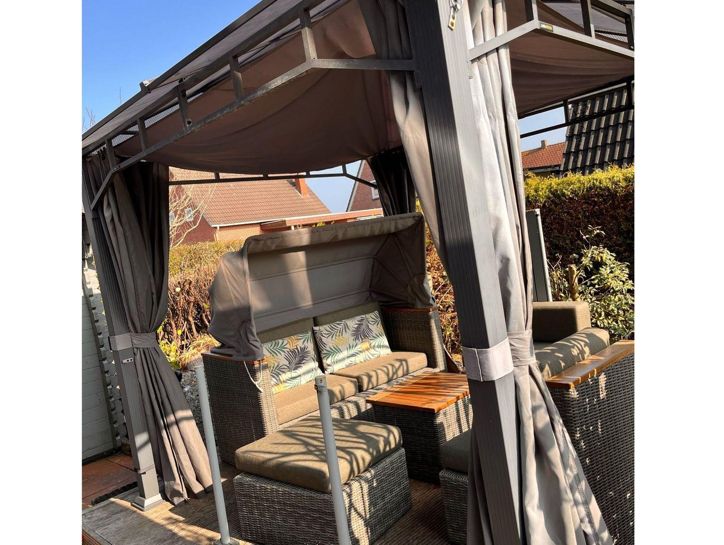 Für die kleinen Gäste ist Kinderspielzeug vorhanden, ein Strandkorb und Windschutz sorgen für Komfort.