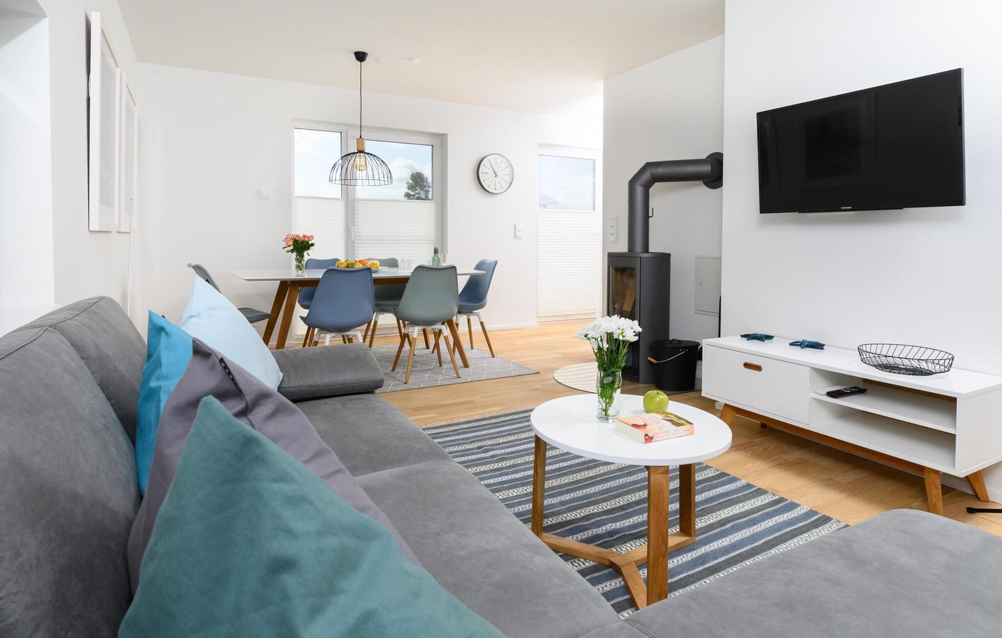 Det bliver romantisk foran pejsen i den hyggelige opholdsstue. Indendørs underholdning leveres af Wi-Fi og Smart TV med et Telekom hjemmeunderholdningsprogram på dage med dårligt nordisk vejr.