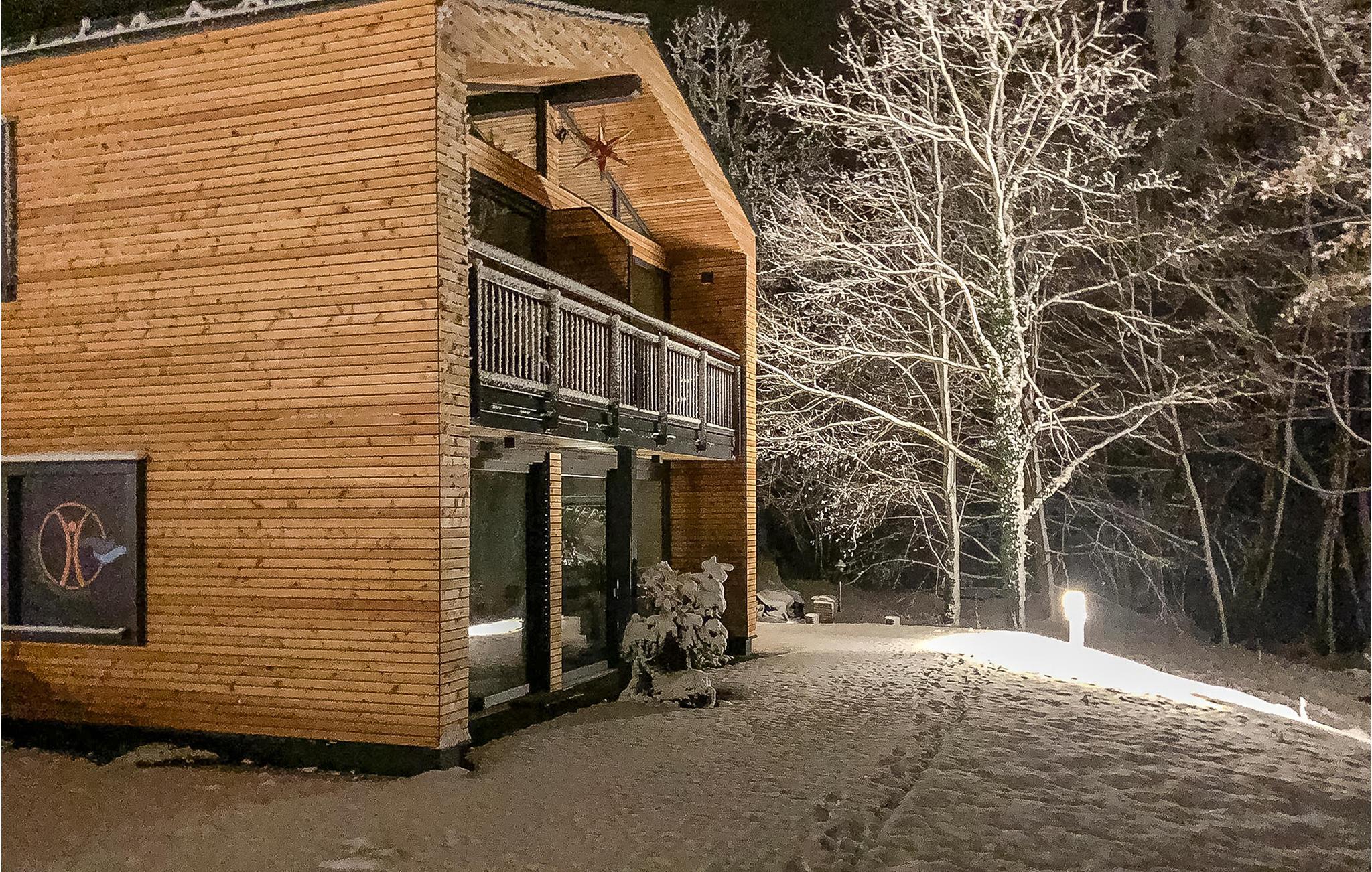 På grund af beliggenheden på en skråning er indgangene til ferielejligheden placeret på bagsiden af huset.