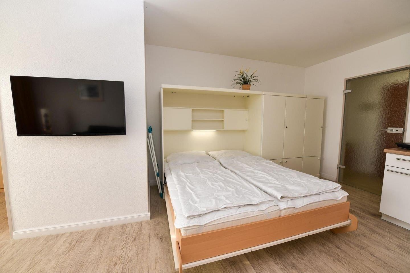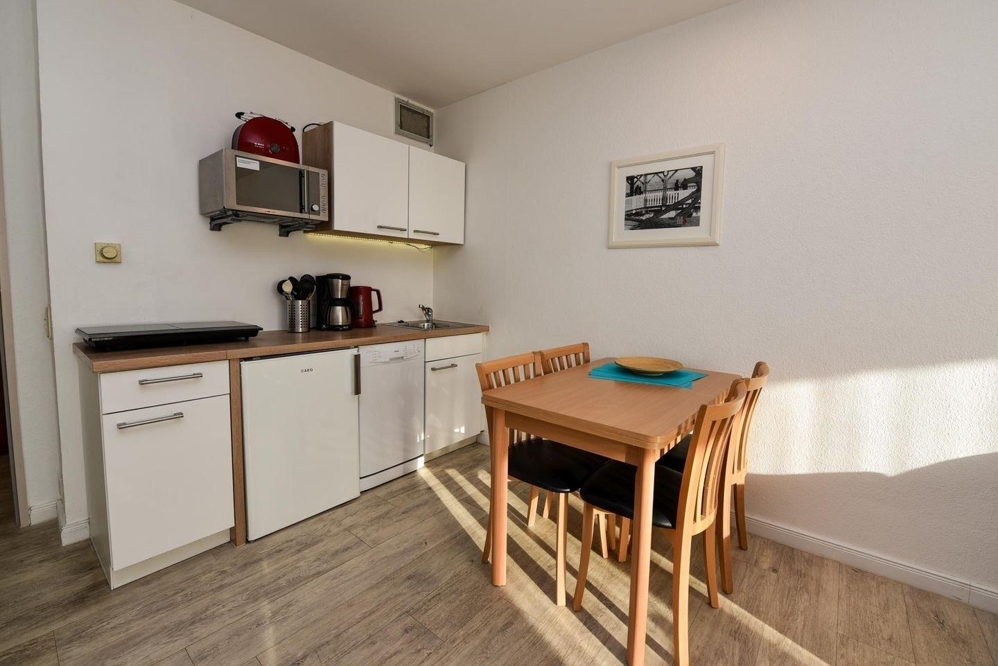 2-Zimmer Appartement im Haus "Nige Wark", bestehend aus einem Kinderzimmer mit Etagenbett und einem Doppelschrankbett im Wohnraum. Das Appartement verfügt zudem über eine gemütliche Zweisitzer-Couch, einen Sesseln und ein Flat- TV sowie eine integrierte Einbauküche mit Spülmaschine, Mikrowelle und Kühlschrank mit Gefrierfach. Das Badezimmer ist mit einer Dusche und WC ausgestattet. Größe ca. 40qm. Die Wohnung liegt ebenerdig im Erdgeschoß und hat eine Terrasse zum Garten.