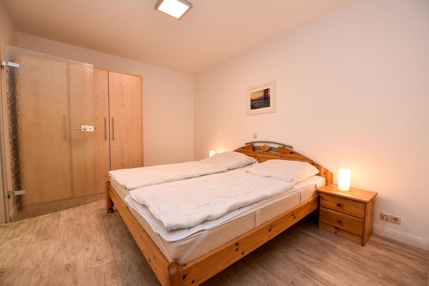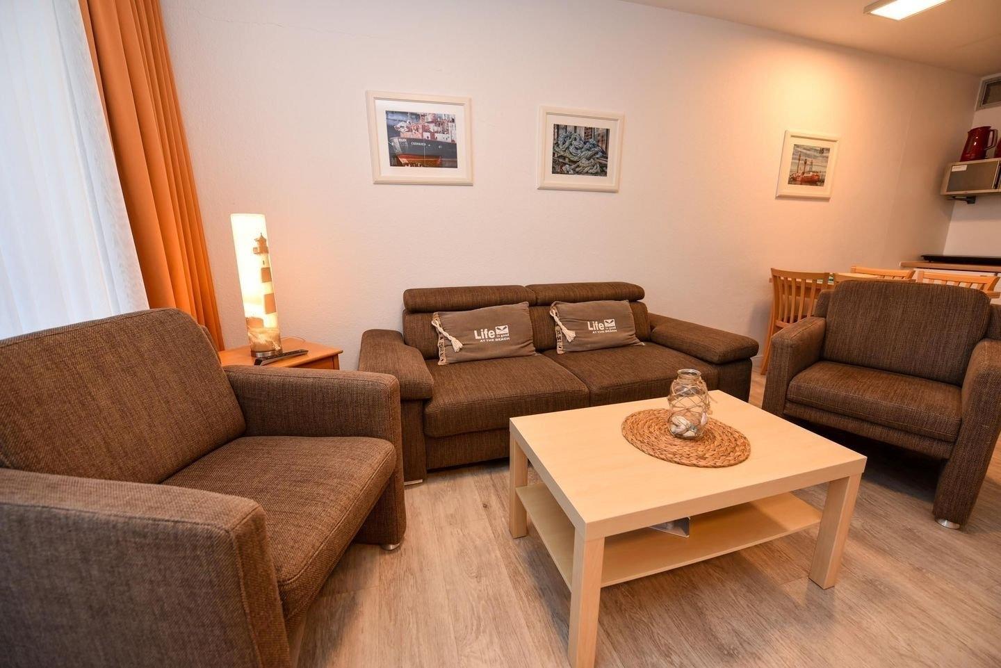 3-Zimmer Appartement im Haus "Nige Wark", bestehend aus einem Kinderzimmer mit Etagenbett und einem Schlafzimmer mit Doppelbett. Im Wohnzimmer befindet sich eine Couch, zwei Sesseln und ein Flat- TV sowie eine integrierte Küchenzeile die u.a. mit Spülmaschine, Mikrowelle und Kühlschrank mit Gefrierfach ausgestattet ist. Das Appartement verfügt über 2 Badezimmer die jeweils mit einer Dusche und WC ausgestattet sind. Größe ca. 50qm. Die Wohnung liegt im Erdgeschoß und hat eine Terrasse zur Seeseite.