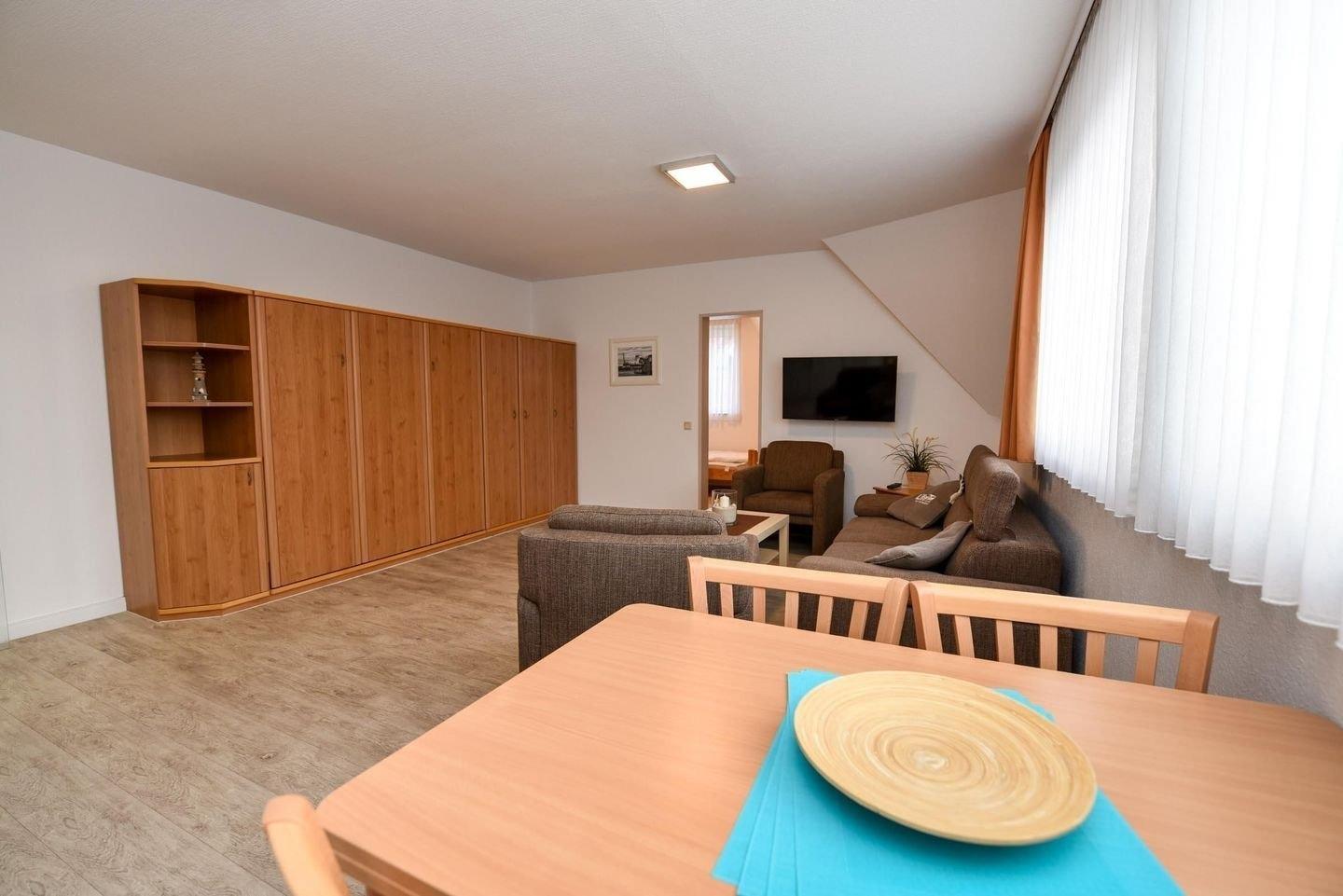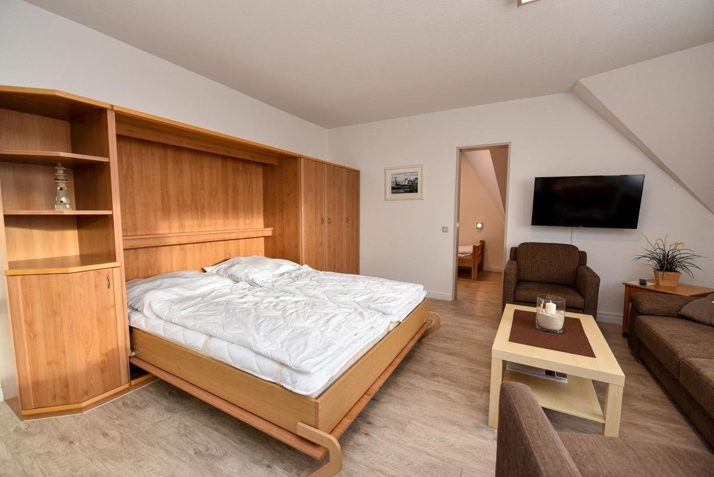 Die Unterkunft verfügt über ein gemütliches Schlafzimmer mit Etagenbett und ein helles Wohnzimmer mit zwei bequemen Zweisitzer-Sofas, Flat-TV und einer voll ausgestatteten Küchenzeile inklusive Spülmaschine, Mikrowelle und Kühlschrank mit Gefrierfach. Ein ausziehbarer Esstisch bietet ausreichend Platz für gemeinsame Mahlzeiten. Zusätzlich sorgt ein Schrankbett (2×90×200 cm) für flexible Schlafmöglichkeiten.
