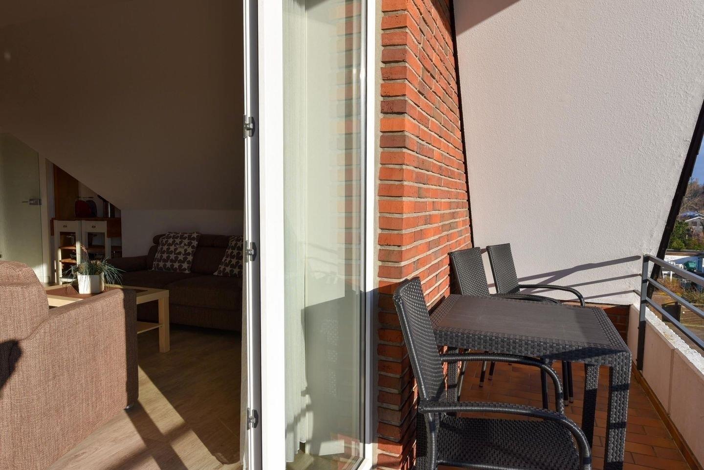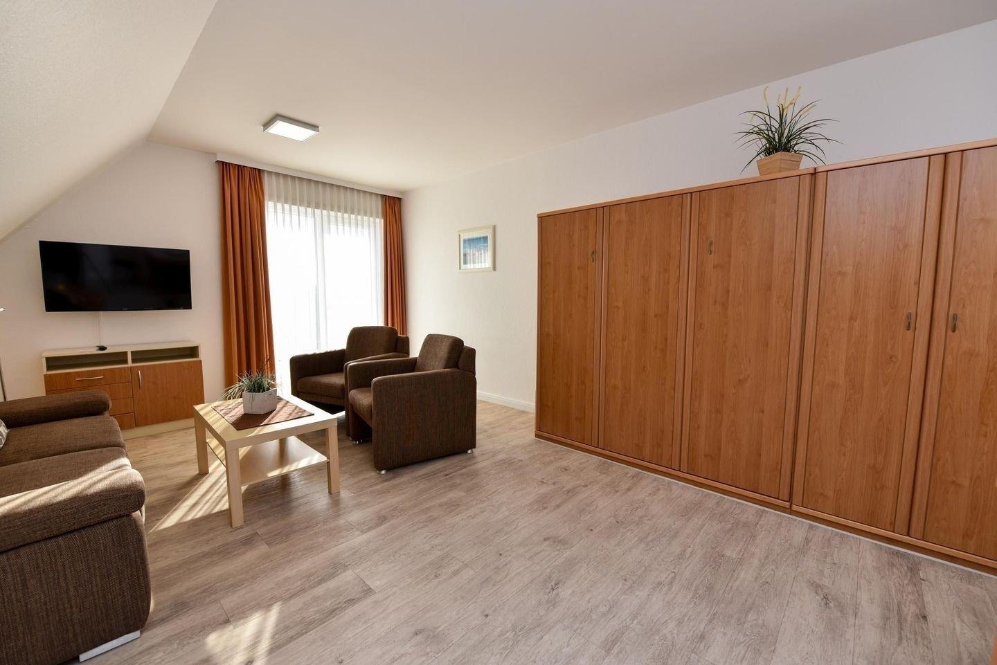 2-Zimmer Appartement im Haus "Nige Wark". In der TV-/Leseecke im Wohnzimmer befindet sich ein gemütliches Zweisitzer-Sofa, zwei Sessel und ein Flat- TV. Die integrierte Küchenzeile mit Spülmaschine, Mikrowelle und Kühlschrank mit Gefrierfach ist komplett ausgestattet und der ausziehbare Esstisch bietet genügend Platz für alle. Im Wohn-/Schlafraum befindet sich zusätzlich noch ein ein Schrankbett (2x90x200). Im Schlaf-/Kinderzimmer steht ein Etagenbett. Das Badezimmer ist mit einer Dusche und WC ausgestattet. Die ca. 40 qm große Wohnung liegt im 2. OG und verfügt zudem auch über einen Balkon zum Garten