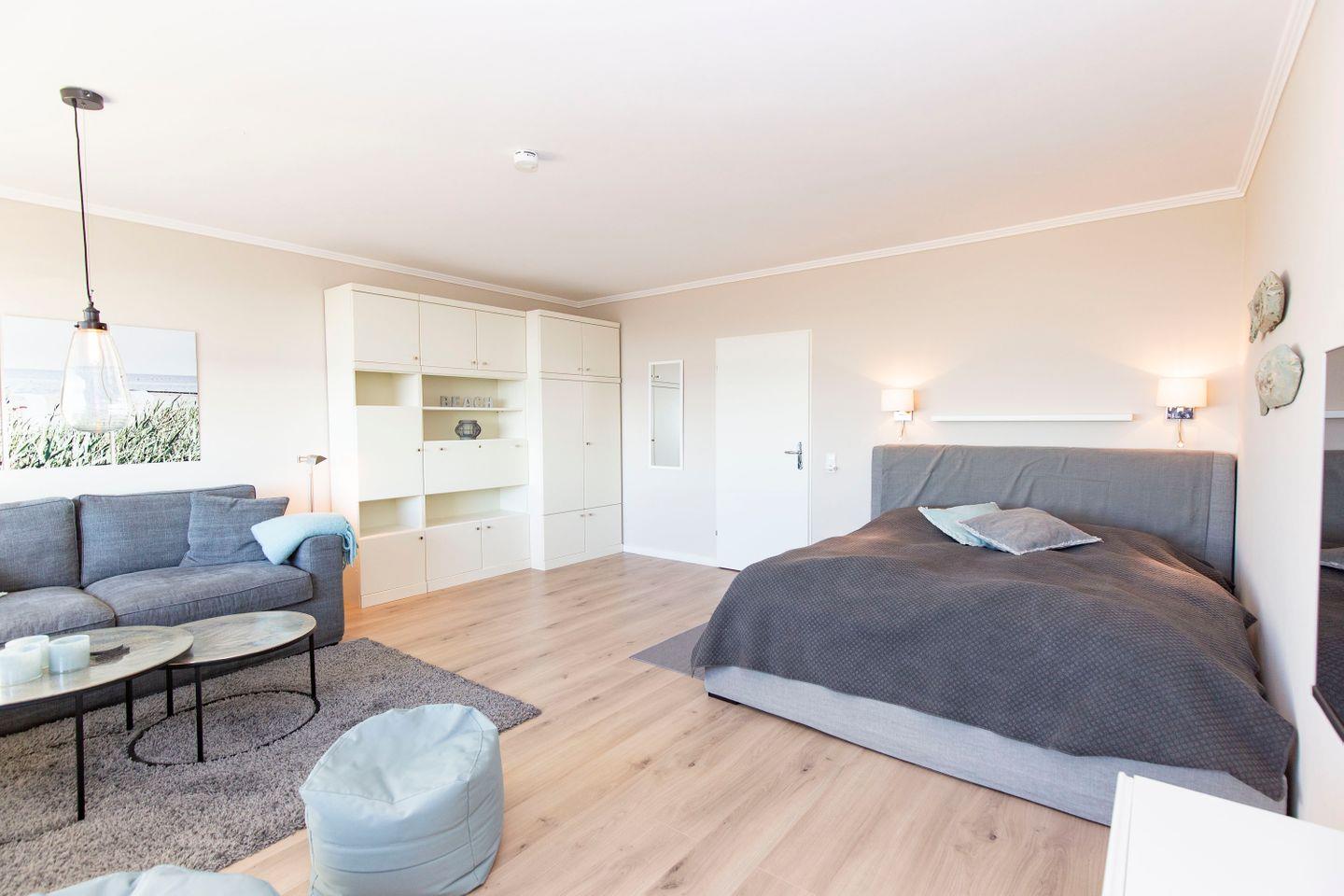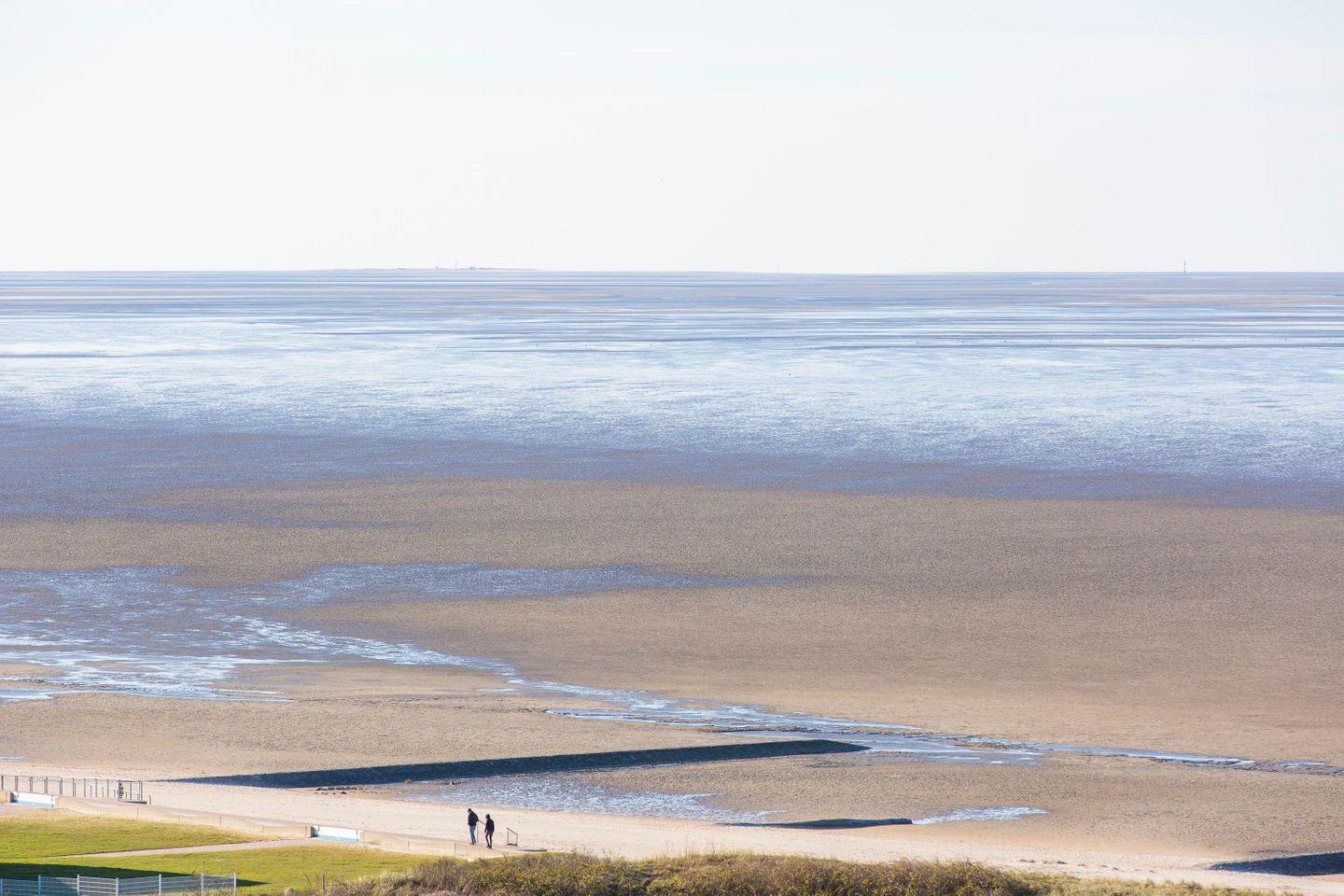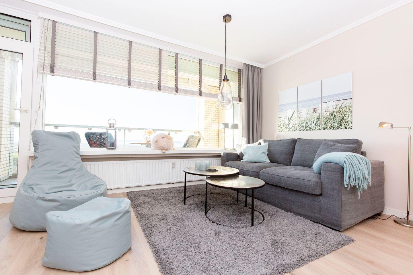 Aussicht nach Neuwerk und zur Elbmündung vom Balkon und Wohnzimmer, Aussicht auf die Kugelbake und das Hafengebiet von Cuxhaven aus der Küche und dem Esszimmer, diese Ferienwohnung bietet einen großartigen Ausblick auf die Umgebung. In direkter Strandnähe erwartet unsere Urlaubsgäste in dieser 54 m² großen Ferienwohnung eine moderne Einrichtung in angenehmen Weiß- und Grautönen. Die Wohnung bietet Platz für bis zu 3 Personen.