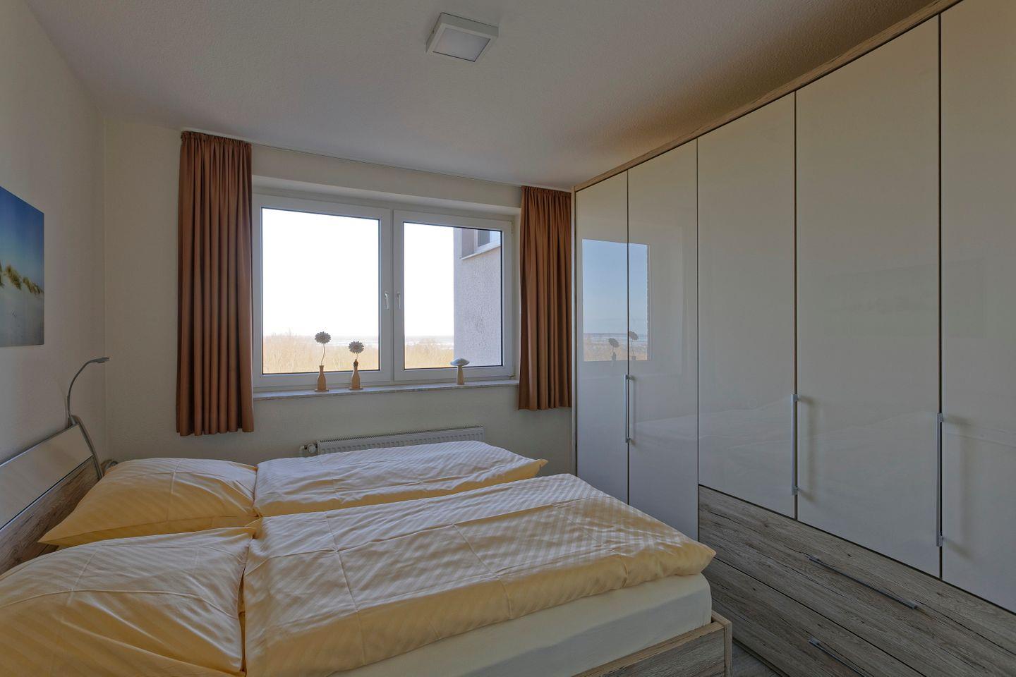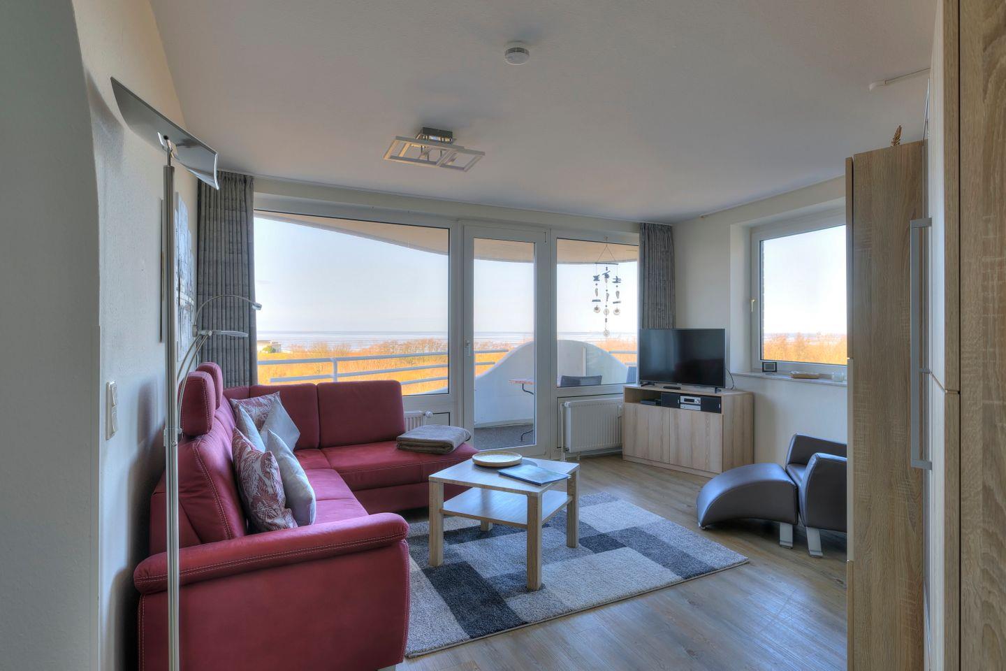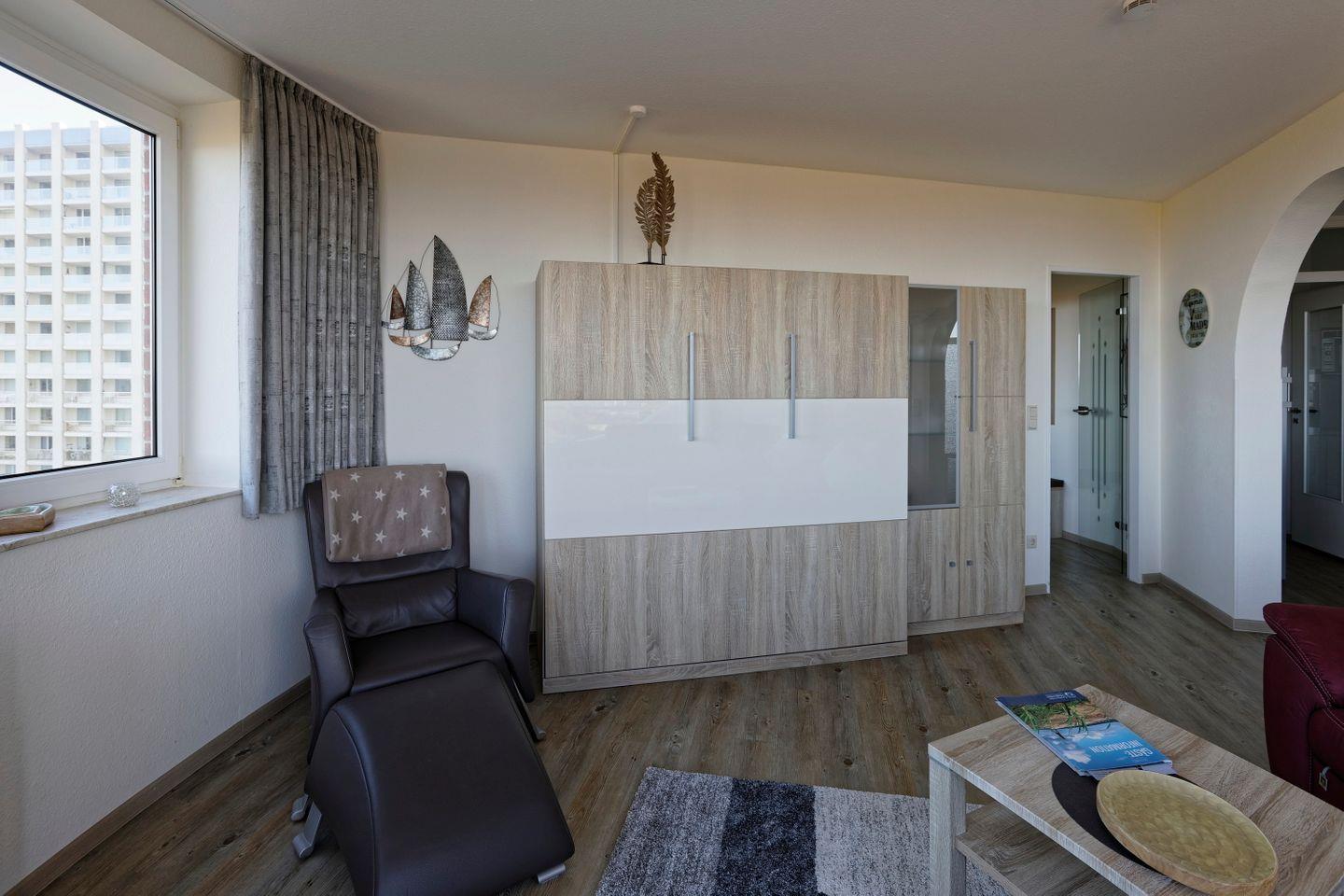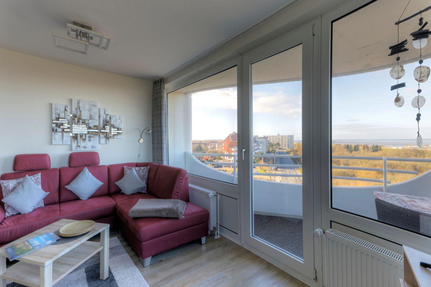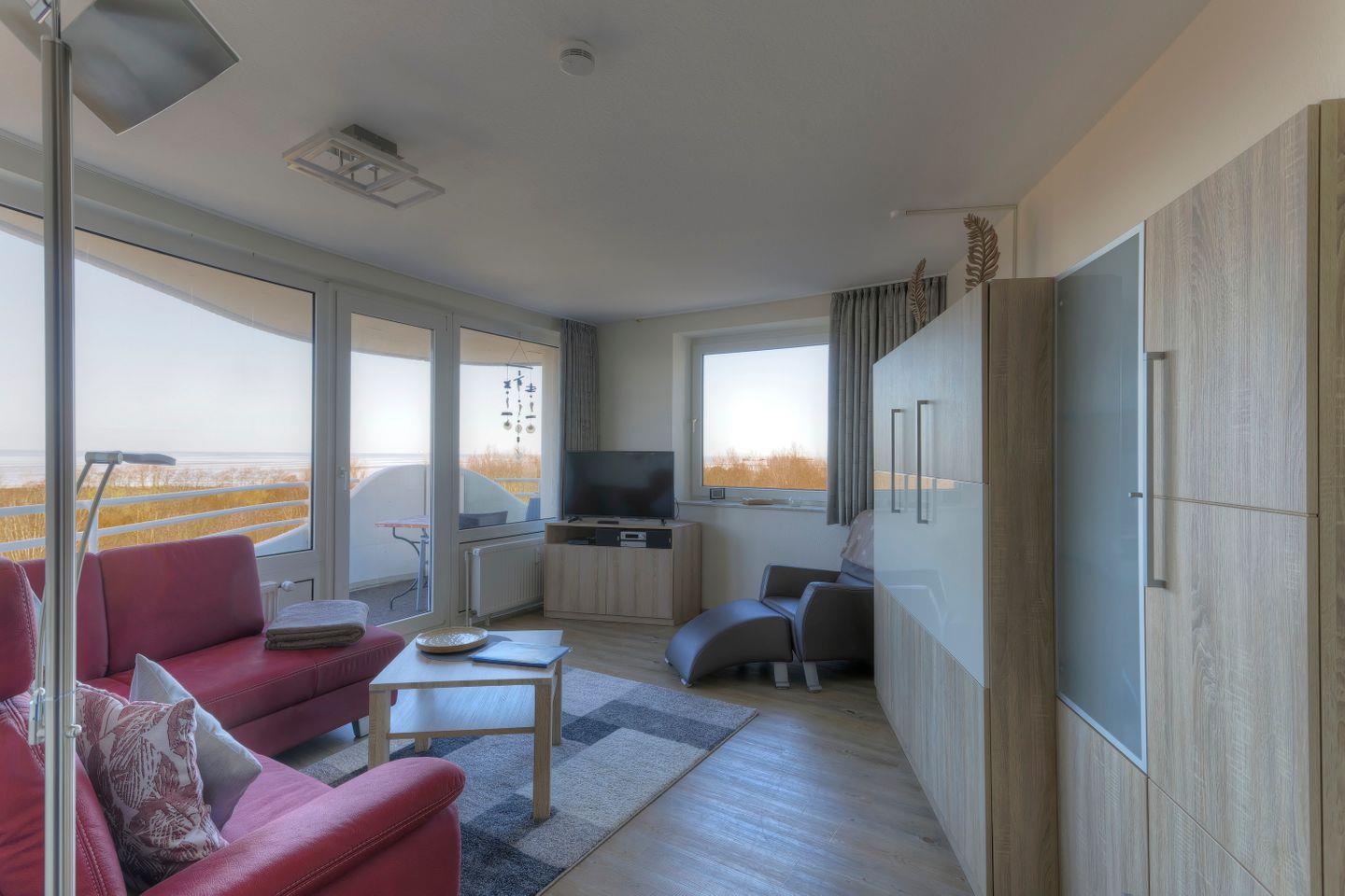 Haus "Lord Nelson", Typ 6, Appartement-Nr. 501, bis 4 Personen, 5. Etage, ca. 66 qm, Seesicht, Blick Richtung Weltnaturerbe Wattenmeer sowie auf den Weltschifffahrtsweg, Schlafzimmer mit Doppelbett, Wohnbereich mit Schrankbett, Dusche/WC, separate Küche mit Geschirrspüler und Mikrowelle, Balkon, kostenloser WLAN-Zugang im App., Kabel-TV, Nichtraucher, Haustiere sind nicht erlaubt, Strandkorb im Sommer 2026,Tiefgaragenstellplatz.