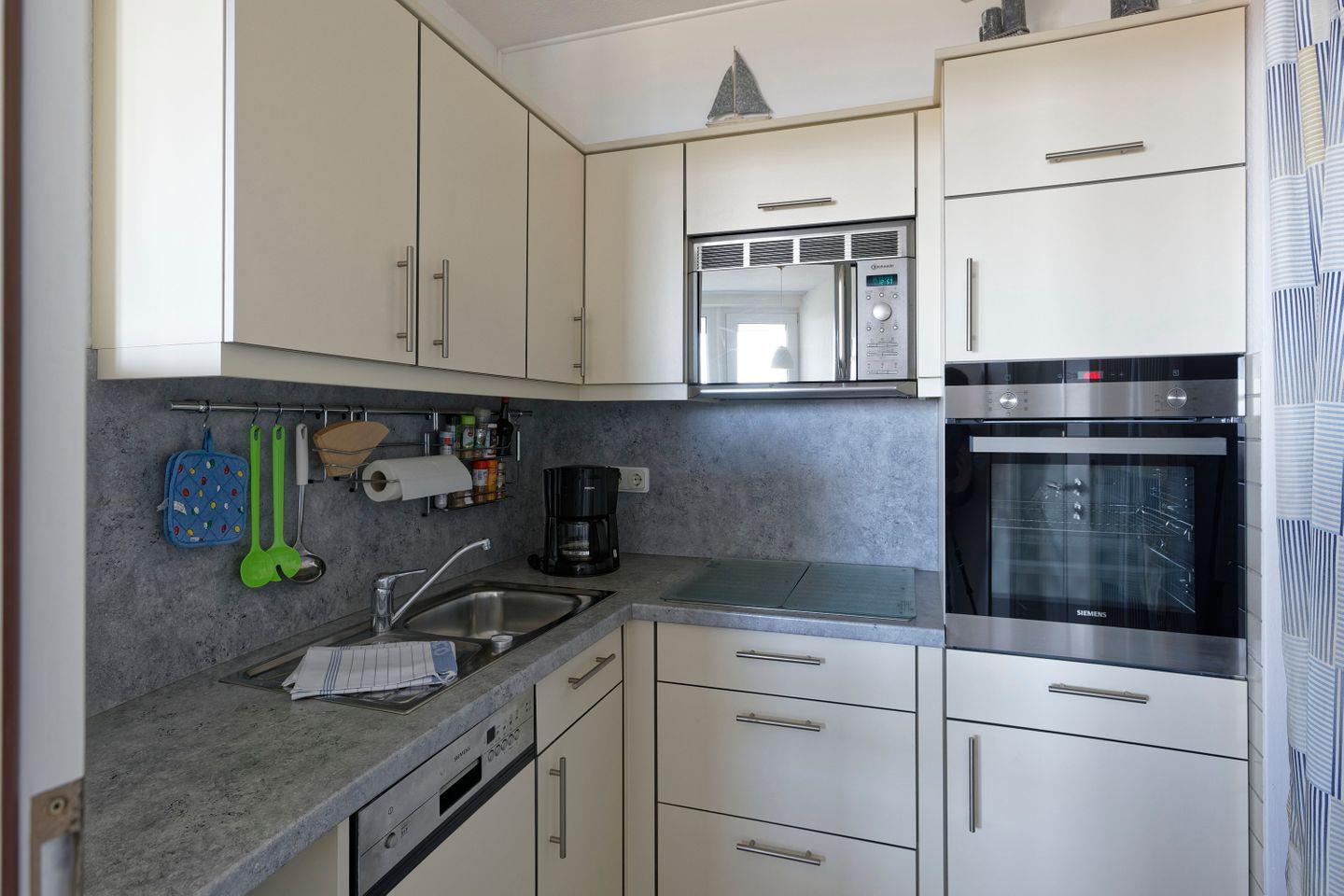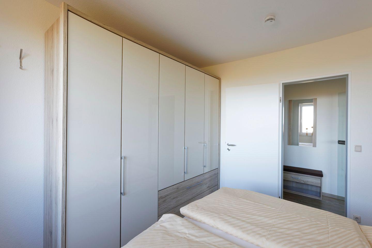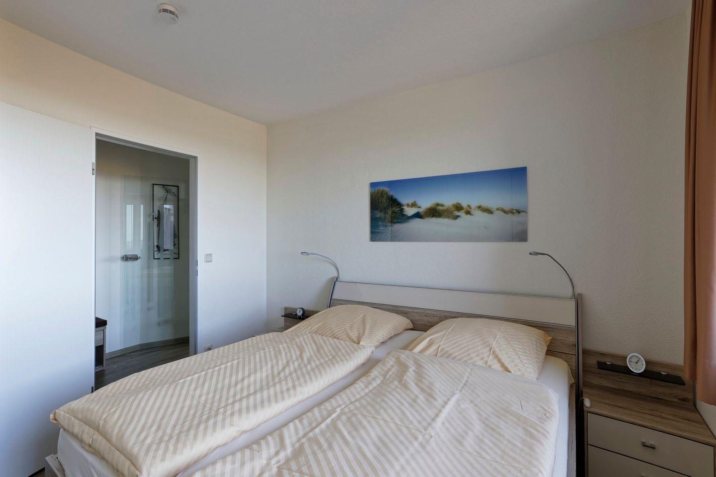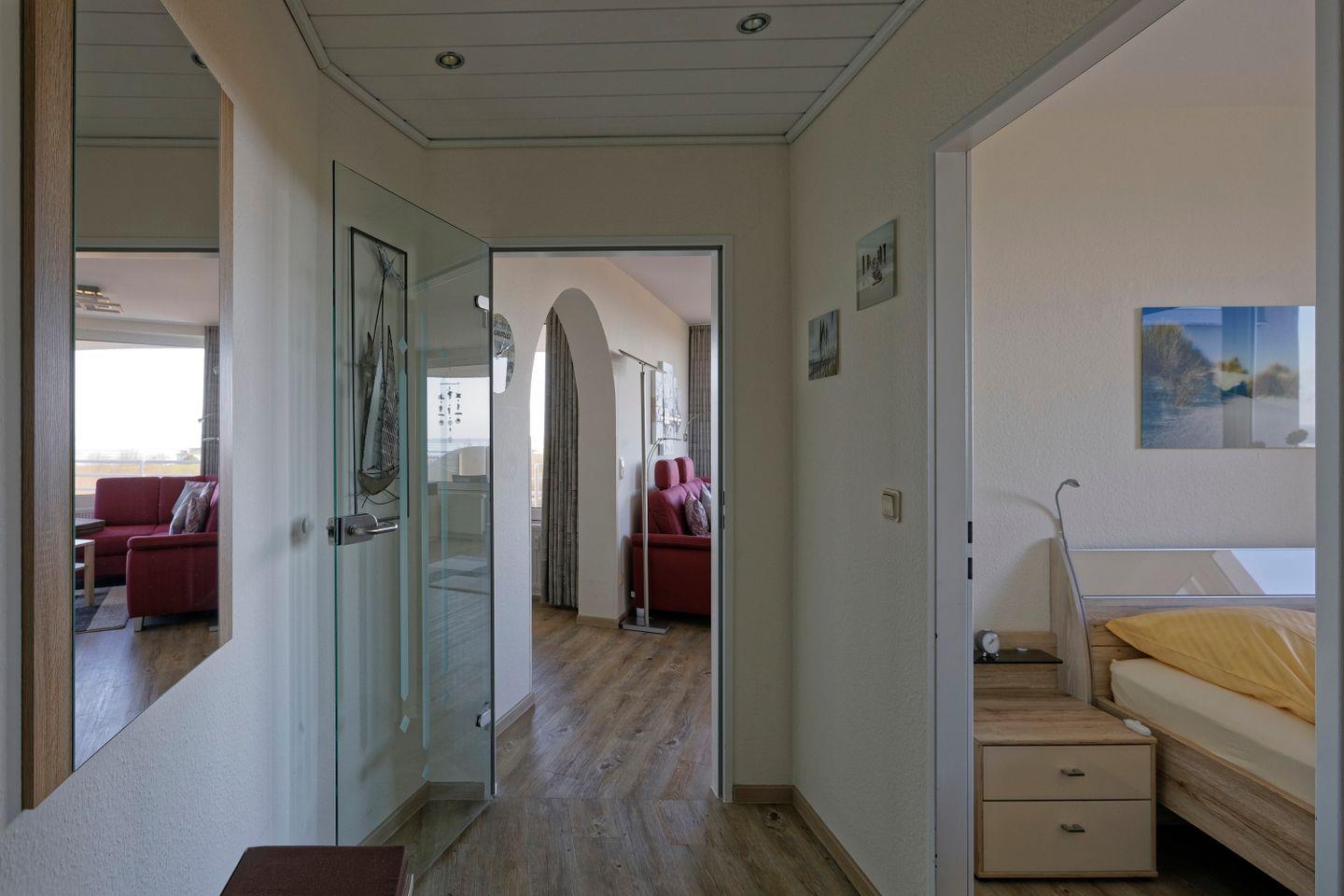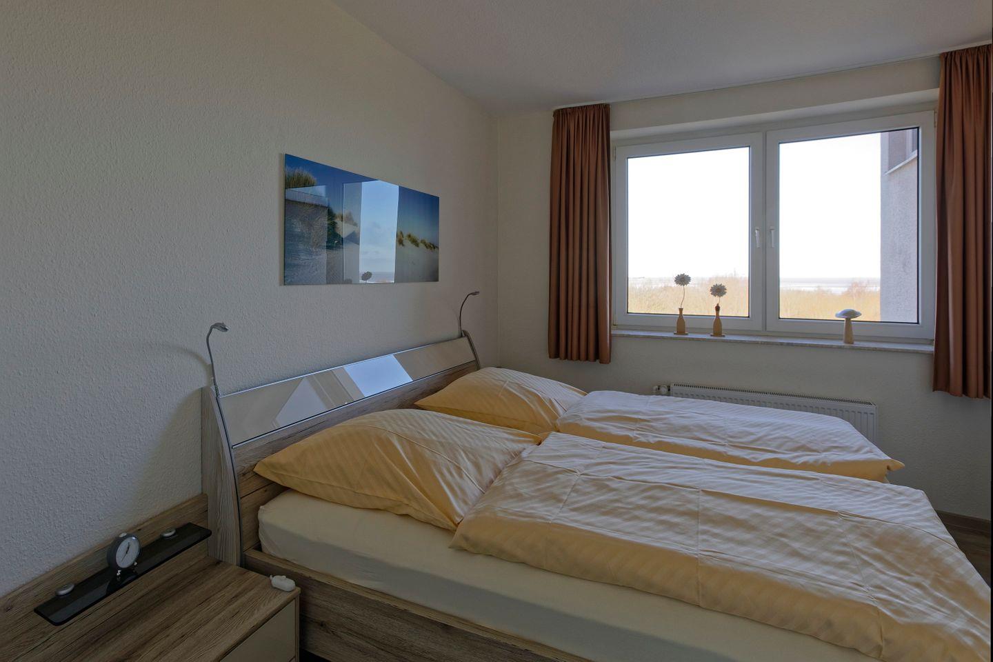 Haus "Lord Nelson", Typ 6, Appartement-Nr. 501, bis 4 Personen, 5. Etage, ca. 66 qm, Seesicht, Blick Richtung Weltnaturerbe Wattenmeer sowie auf den Weltschifffahrtsweg, Schlafzimmer mit Doppelbett, Wohnbereich mit Schrankbett, Dusche/WC, separate Küche mit Geschirrspüler und Mikrowelle, Balkon, kostenloser WLAN-Zugang im App., Kabel-TV, Nichtraucher, Haustiere sind nicht erlaubt, Strandkorb im Sommer 2026,Tiefgaragenstellplatz.