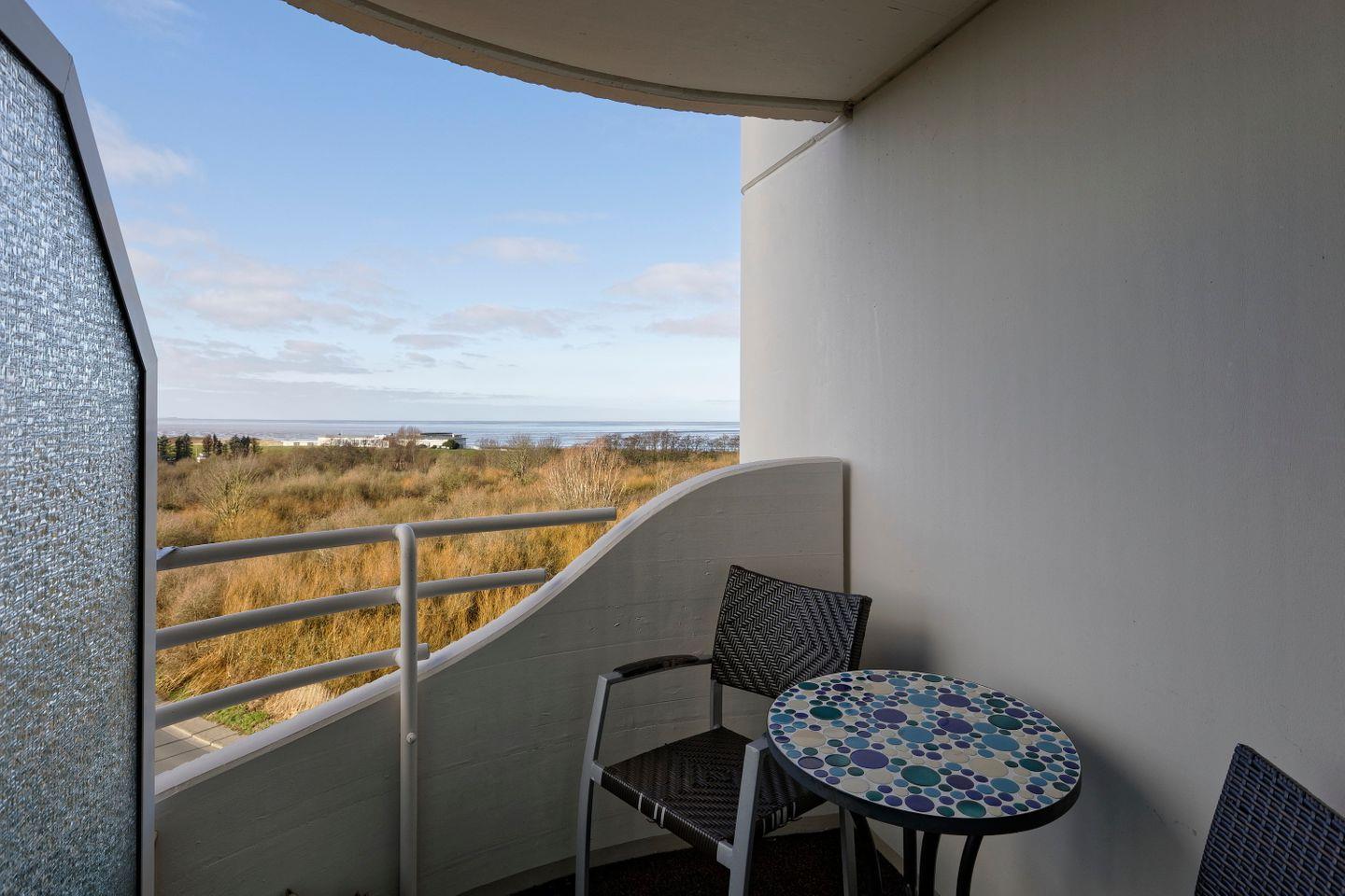Der Balkon besticht mit einem Panoramablick in Richtung Weltnaturerbe Wattenmeer und Nordsee sowie auf den Weltschifffahrtsweg. Hier können Sie Ihren Urlaub jederzeit an der frischen Nordseeluft genießen.