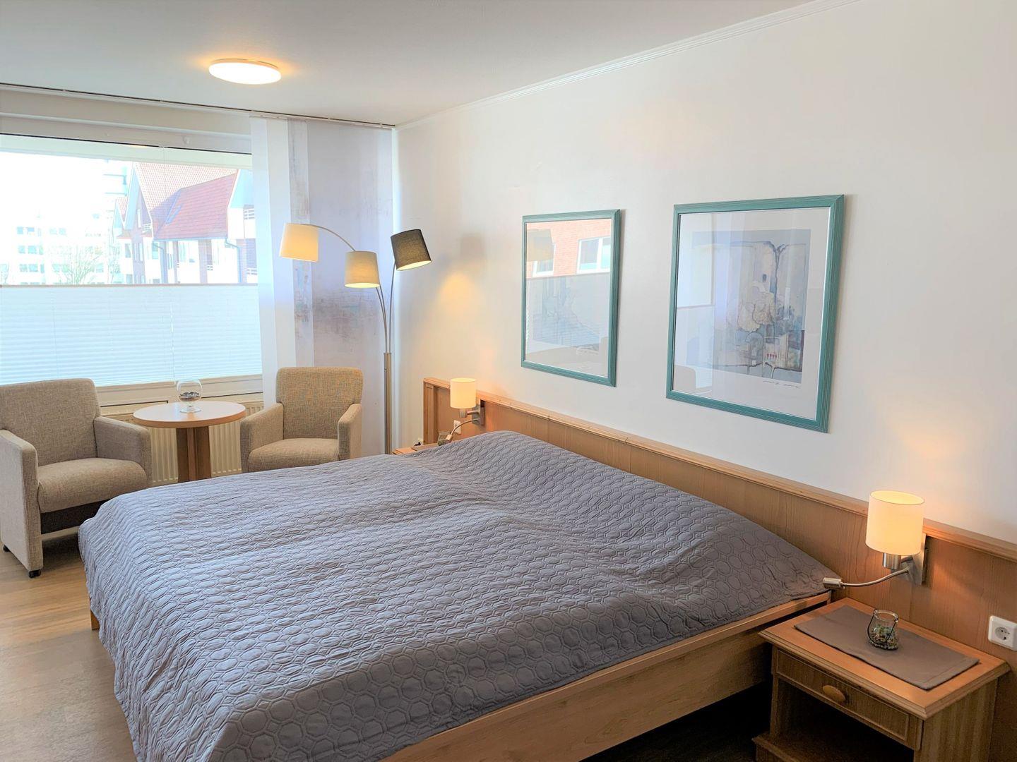 Haus "Trafalgar", Typ A-Ost, Appartement-Nr. 231, bis 2 Pers., 2.Etage, ca.34 qm, Ostseite (ohne Meerblick), Wohn/Schlafbereich mit fest stehendem Komfortbett (2 mal 100 x 200 cm), Küchenpantry mit Mikrowelle, Dusche/WC, Balkon, Flachbildschirm, kostenl. WLAN-Zugang im App., Tiefgaragenstellplatz, Strandkorb im Sommer 2026, ab 5 Übernachtungen 1 Wäschepaket p.P. inkl.