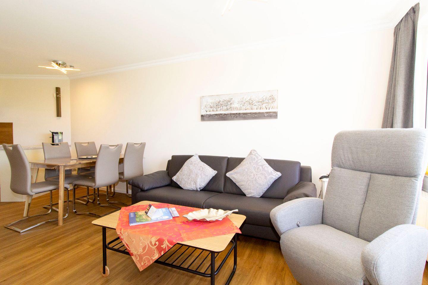 Die mit viel Liebe zum Detail eingerichtete Ferienwohnung für bis zu 4 Personen strahlt in frischen Farben. Die Ledercouch mit dem Relaxsessel prägt optisch das Bild dieser FeWo in Cuxhaven.