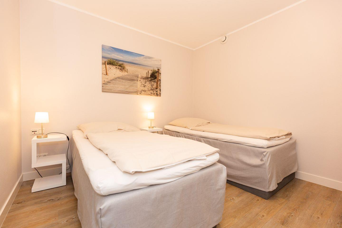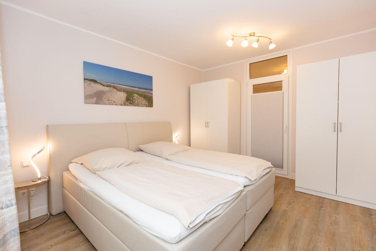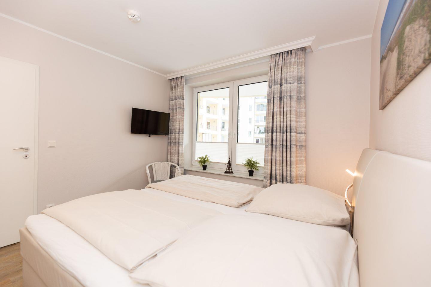 Haus "Kurpark-Residenz", Typ D2, App.-Nr. "125", bis 4 Personen, 1. OG, Ostseite ("Parkseite"), ca. 67 m² Größe, Wohnzimmer, separates Schlafzimmer mit Boxspringbett und Flachbild TV, zweites separates Schlafzimmer (innenliegend) mit zwei Boxspringbetten, Dusche/WC, Küchenzeile mit Mikrowelle, Backofen und Geschirrspüler, Balkon,
