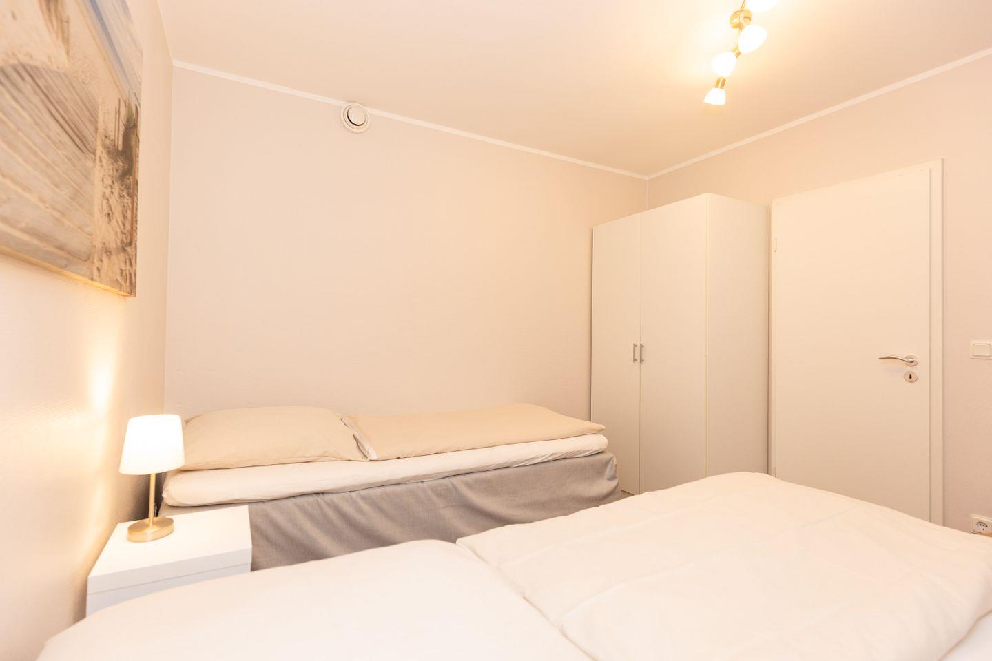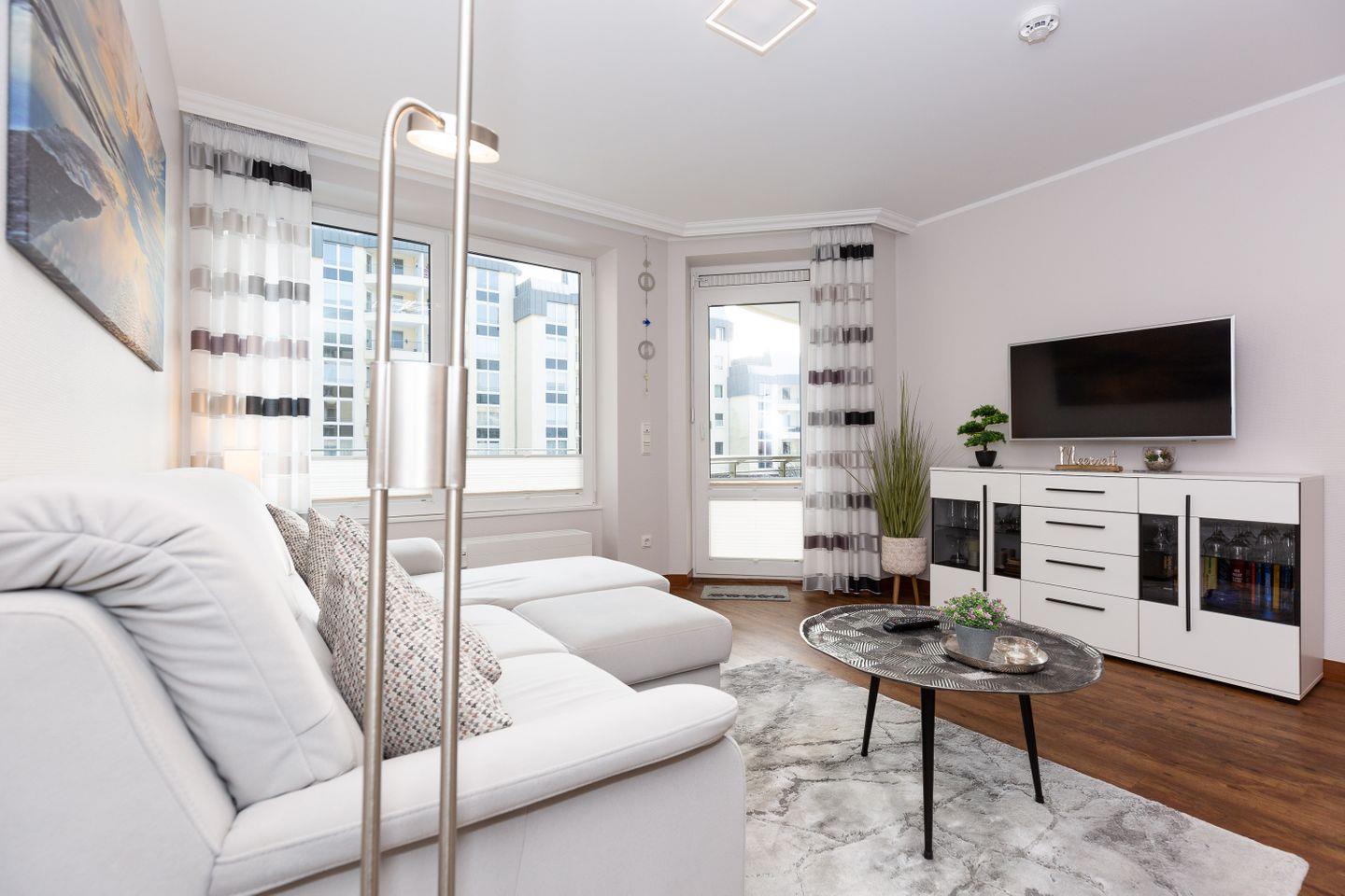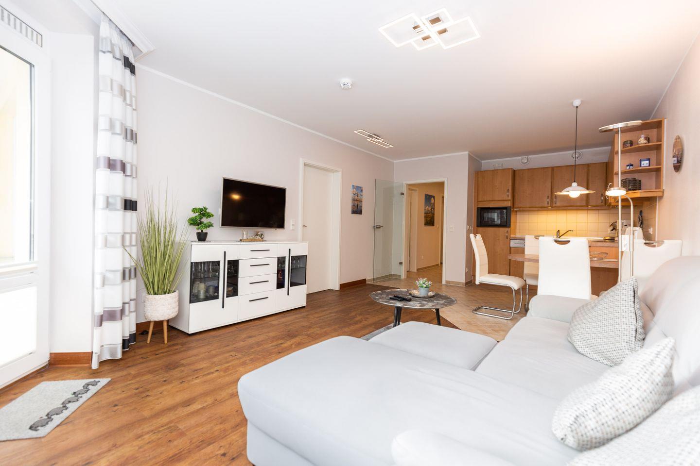 Haus "Kurpark-Residenz", Typ D2, App.-Nr. "125", bis 4 Personen, 1. OG, Ostseite ("Parkseite"), ca. 67 m² Größe, Wohnzimmer, separates Schlafzimmer mit Boxspringbett und Flachbild TV, zweites separates Schlafzimmer (innenliegend) mit zwei Boxspringbetten, Dusche/WC, Küchenzeile mit Mikrowelle, Backofen und Geschirrspüler, Balkon,