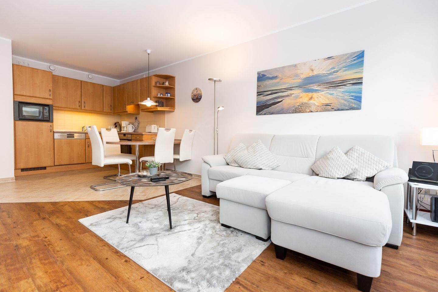 kostenloser W-Lan Zugang (eigener Router) im App., SAT-TV, Tiefgaragenstellplatz, Nichtraucherwohnung, Haustiere sind nicht gestattet, Strandkorb im Sommer 2026.