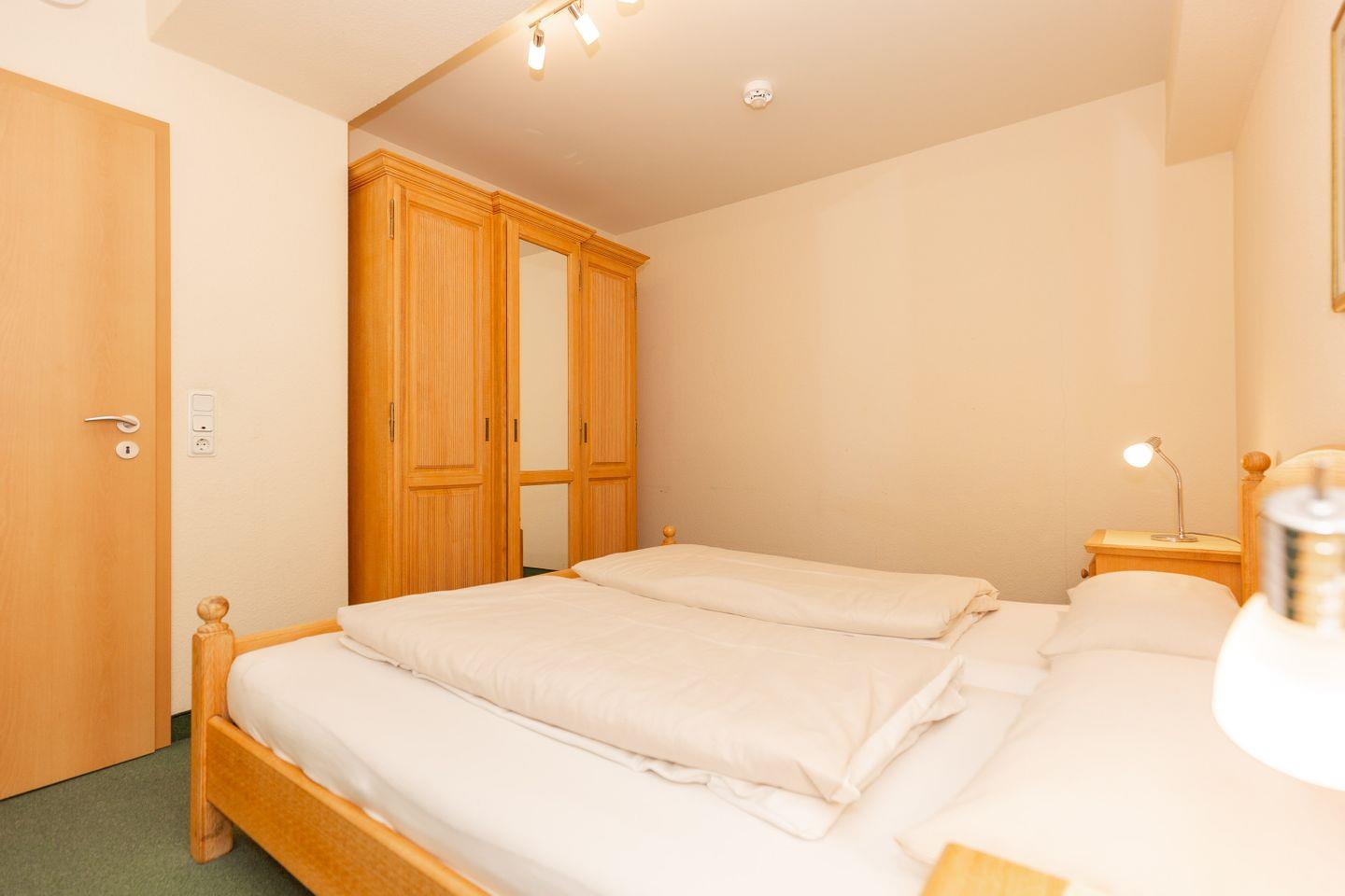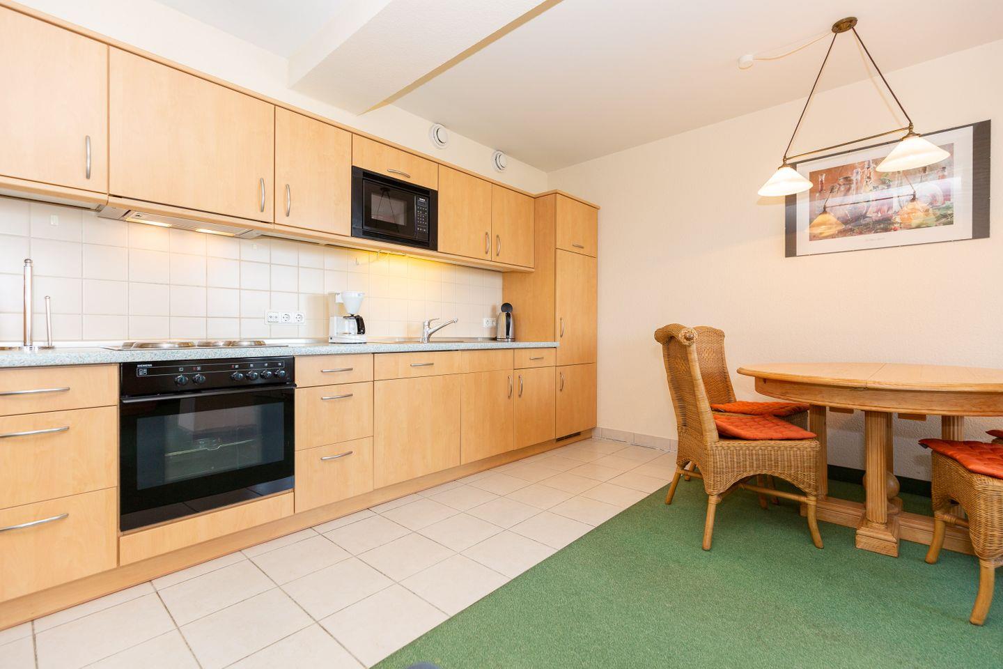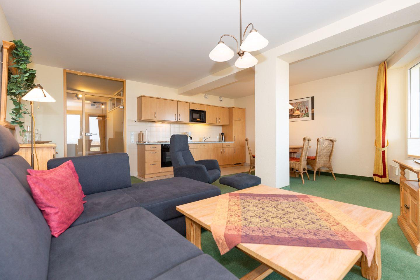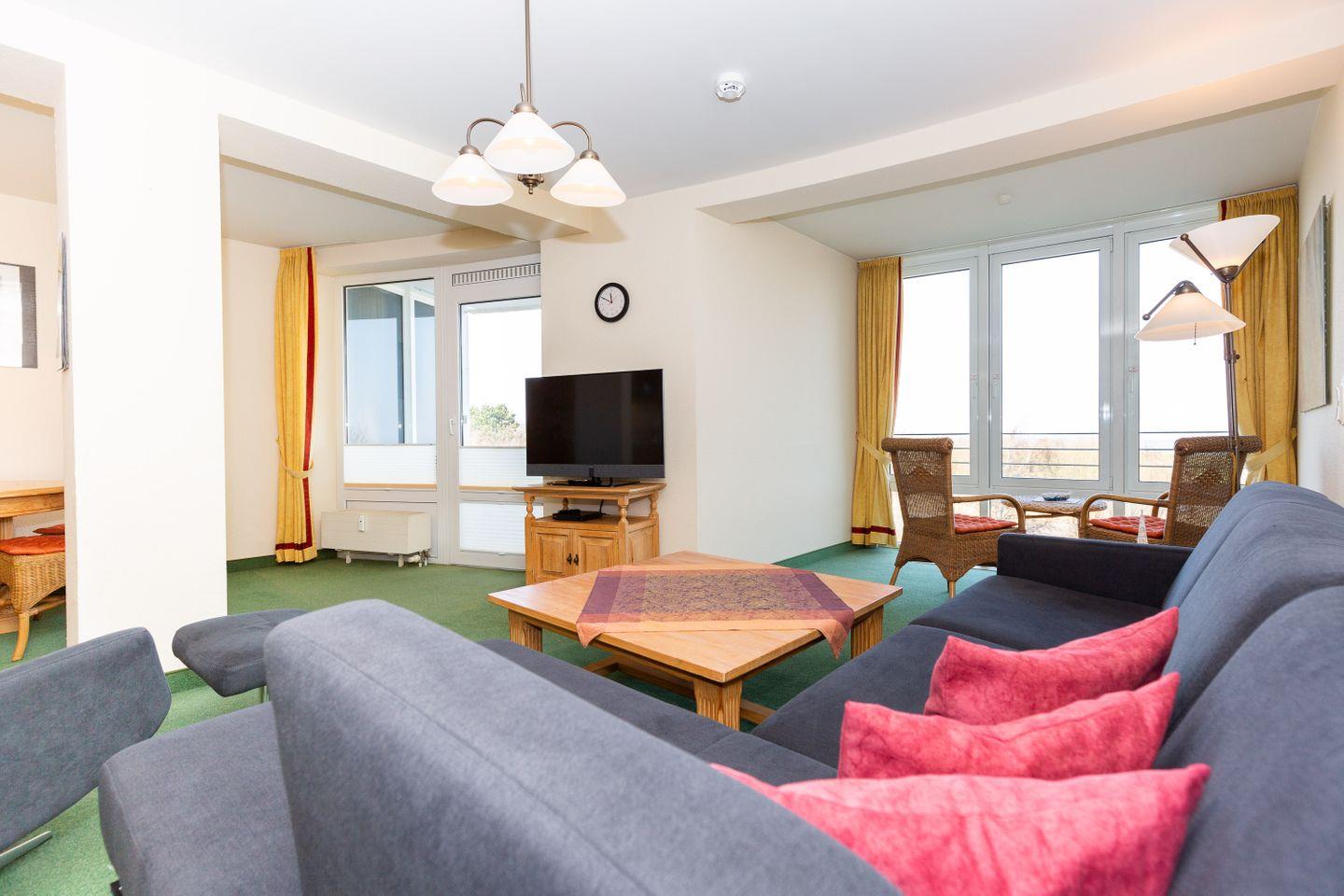 Haus "Kurpark-Residenz", Typ D1, Appartement-Nr. "215", bis 4 Personen, 2. OG, Nordseite (Seesicht Richtung "Elbe"), ca. 70 m² Wohnungsgröße, Wohnzimmer mit Schlafcouch, separates Schlafzimmer mit Doppelbett (innenliegend), Dusche/WC, Gäste-WC, Waschmaschine, Küchenzeile mit Mikrowelle, Backofen und Geschirrspüler, Loggia, SAT-TV, Tiefgaragenstellplatz, Haustiere sind nicht gestattet, Strandkorb im Sommer 2026.