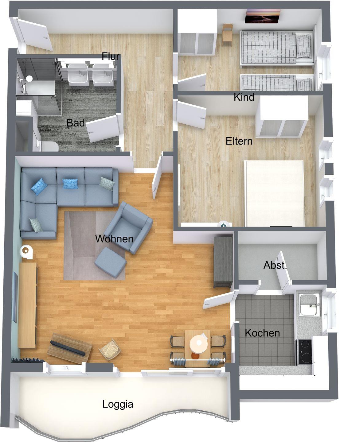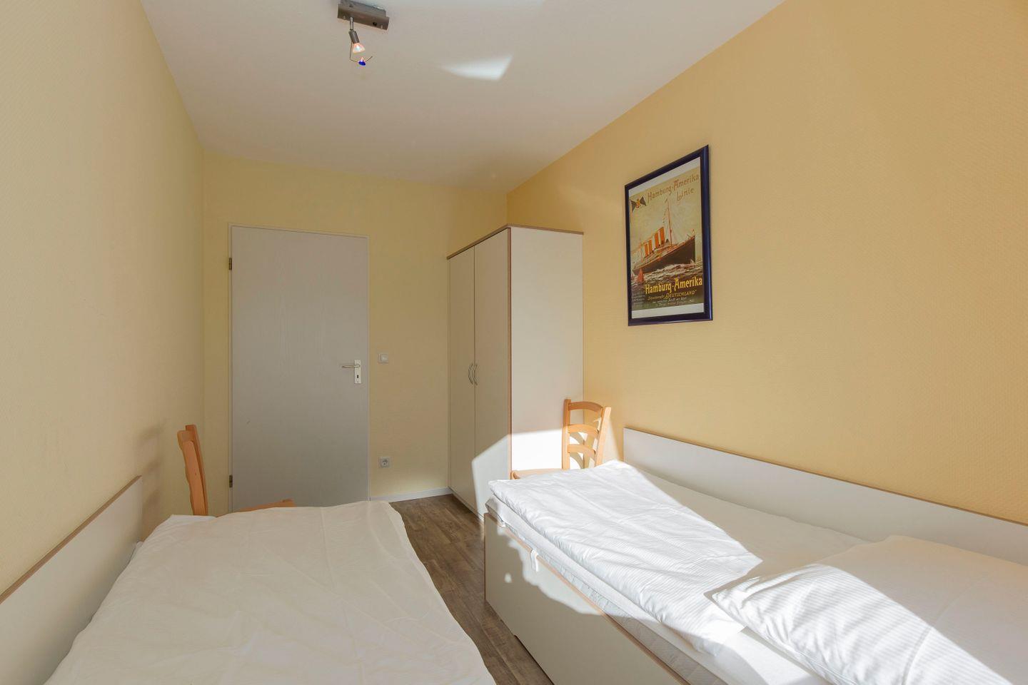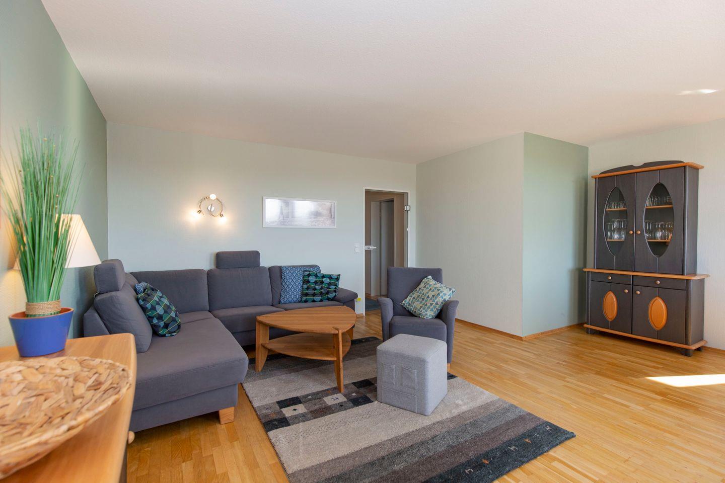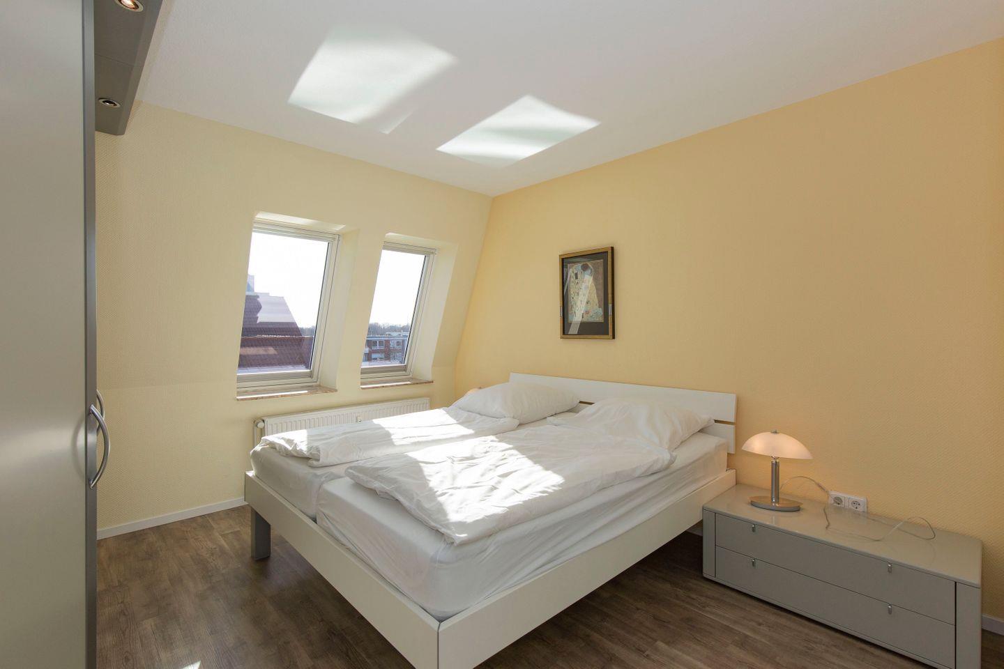 Haus "Trafalgar", Typ D, App.-Nr. 428, bis 4 Pers., 4. Etage, ca.70qm, Balkon Südseite mit Blick über Cuxhaven (ohne Meerblick), großzügiges Wohnzimmer mit Echtholzfußboden, 1. Schlafzimmer mit Doppelbett, 2. Schlafzimmer mit zwei Einzelbetten, Hart-PVC Design-Planken in beiden Schlafzimmern, sep. Küche mit Ceranfeld, Geschirrspüler, Backofen & Mikrowelle, Dusche/WC, Kabel-TV, W-Lan im App., breiter Tiefgaragenstellplatz, Nichtraucherwohnung, Haustiere sind nicht gestattet, Strandkorb im Sommer 2026.