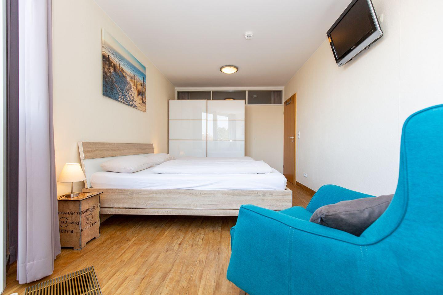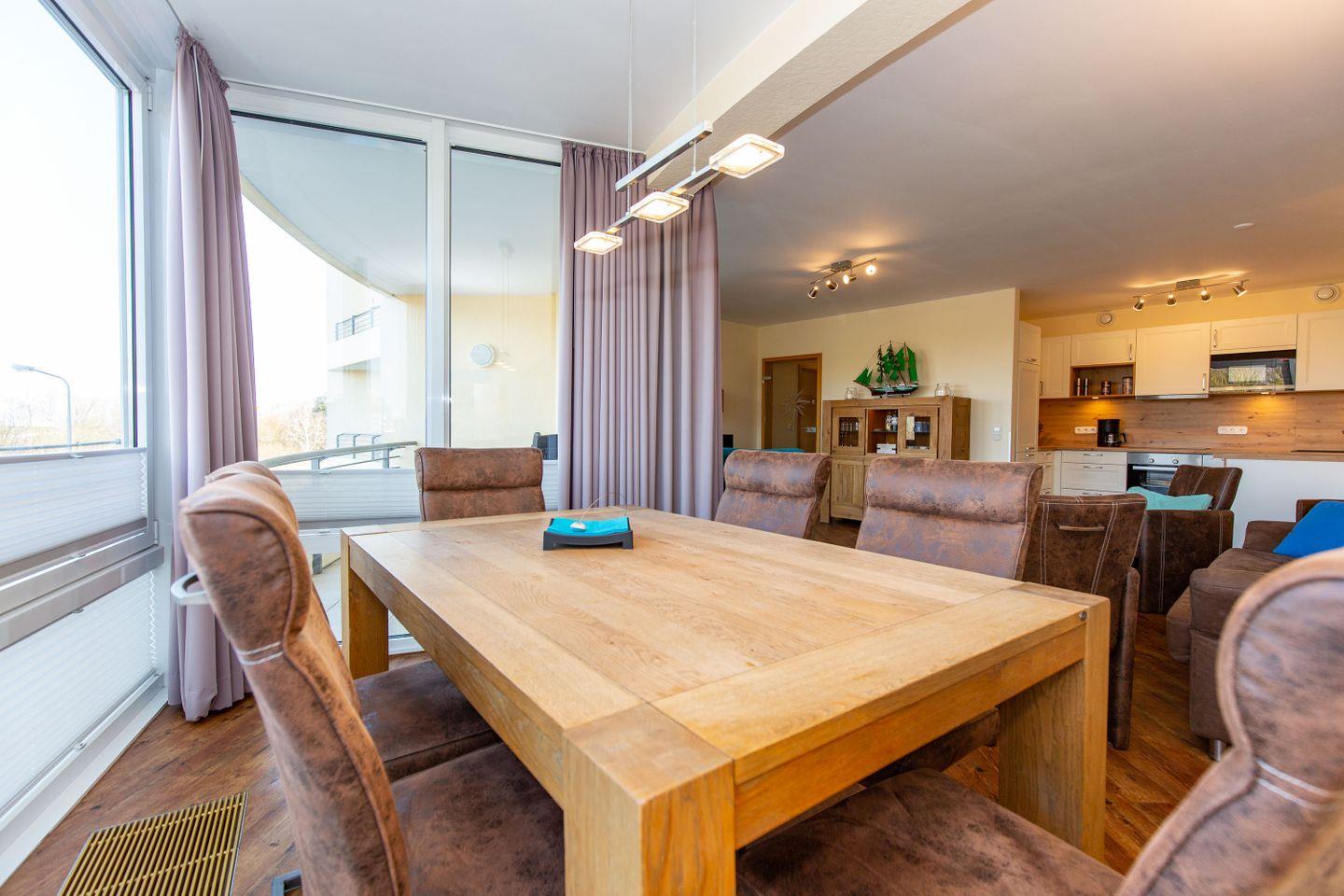 Haus "Kurpark-Residenz", Typ F, App-Nr. 118, bis 4 Personen, 1.OG, Nord/Westseite (eingeschränkter Seeblick Richtung Elbe), ca. 87 m² Größe, Wohnzimmer mit Schlafcouch, DVD-Player, sep. Schlafzimmer mit Doppelbett und 2. TV-Gerät, zweites sep. Schlafzimmer (innenliegend) mit Einzelbetten, kombiniertes Bad mit Haartrockner, Badewanne, Dusche und WC, sep. Gäste-WC, Küchenzeile mit Mikrowelle, Backofen und Geschirrspüler, Loggia, SAT-TV, kostenl. W-Lan Zugang im App., Tiefgaragenstellplatz, Nichtraucherwohnung, Haustiere gestattet, Strandkorb im Sommer 2026.