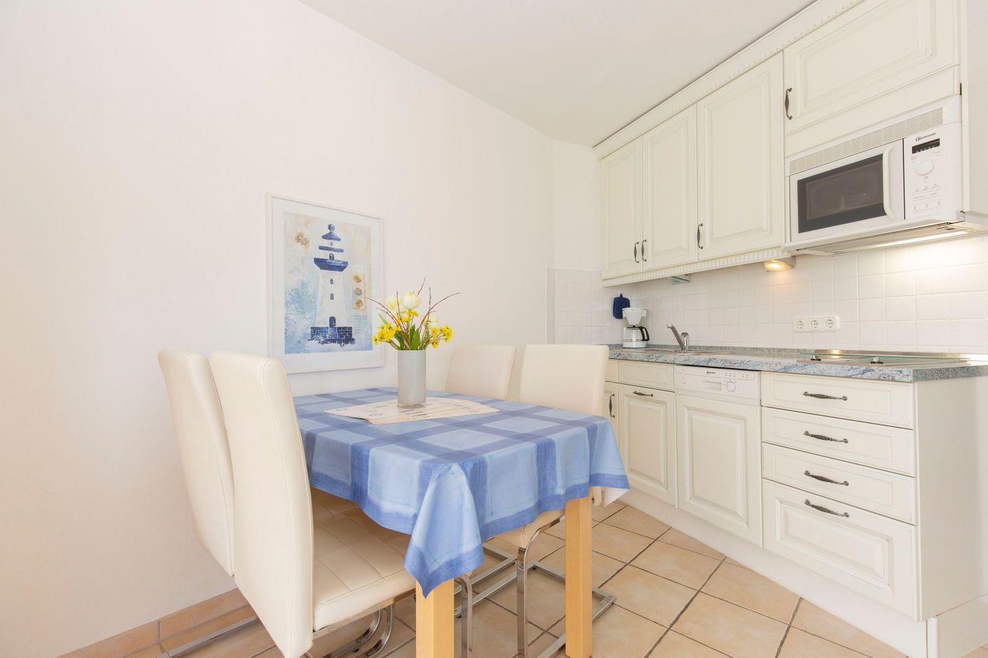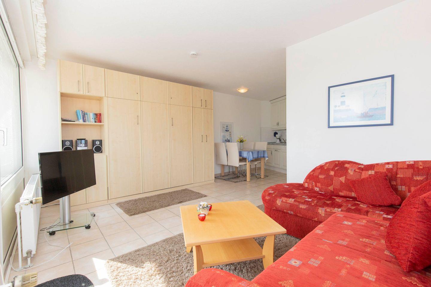 Haus "Lord Nelson", Typ 1, App.-Nr. "120", bis 4 Personen, 1. Etage, ca. 43 qm, Blick Richtung Weltschifffahrtsweg (ohne Meerblick/Richtung Elbe), Wohnbereich mit Schrankbett, separates Schlafzimmer mit zwei Einzelbetten, Dusche/WC, Küchenzeile mit Geschirrspüler, 2-Platten-Ceranfeld und Mikrowelle, Balkon, Telefon, Kabel-TV (Flat-Screen),kostenl. W-Lan Zugang im App., Tiefgaragenstellplatz, Haustiere sind nicht erlaubt, Nichtraucherwohnung, Strandkorb im Sommer 2025.
