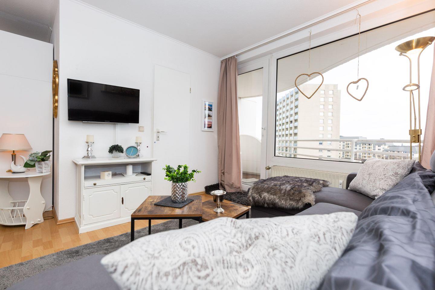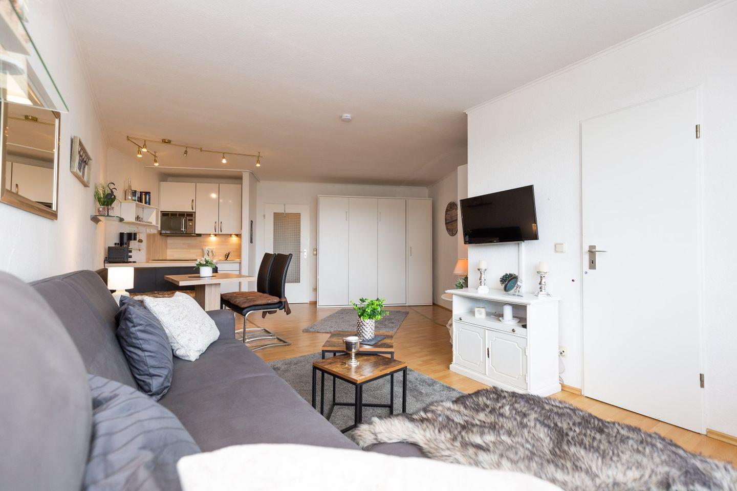 Haus "Lord Nelson", Typ 2, Appartement-Nr. 613, bis 3 Personen, ca. 42 qm, Weltschifffahrtsweg, seitlicher Meerblick Richtung Elbe, Wohnbereich mit Schrankbett, kleines Kinderzimmer mit Hochbett, Dusche/WC, Küchenzeile mit Geschirrspüler, 4-Platten-Ceranfeld und Mikrowelle, Balkon, Kabel-TV, kostenfreier WLAN-Anschluss im App., Aussenstellplatz, Nichtraucher, Haustiere sind nicht erlaubt,