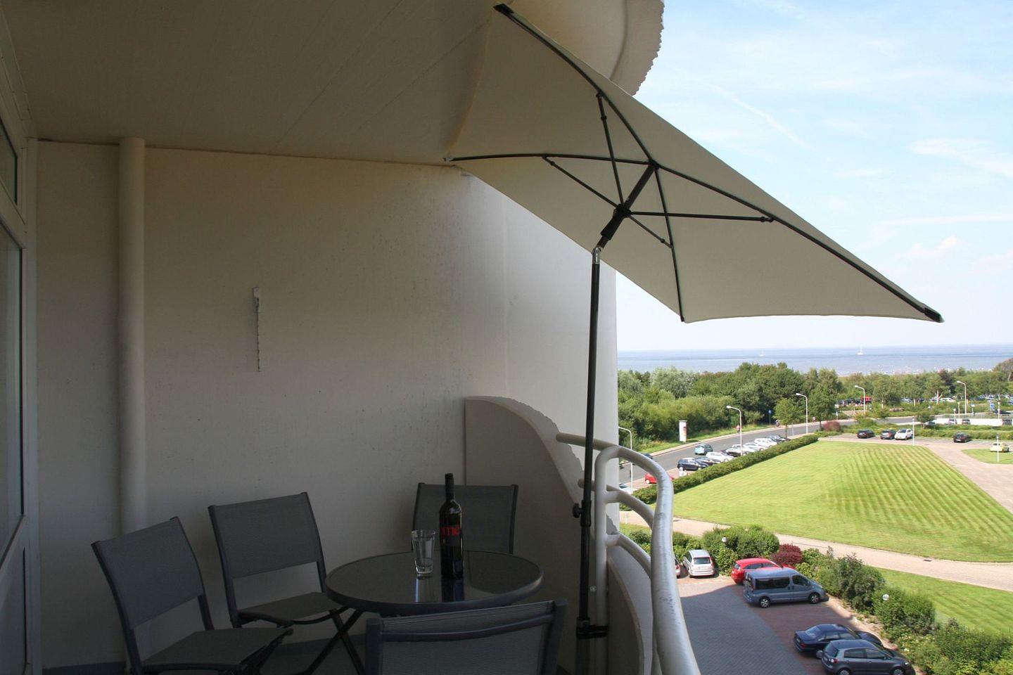 Der großzügige Ost-Balkon in der 5. Etage des Haus bietet einen wunderschönen Meerblick auf das Weltnaturerbe Wattenmeer und die wunderschöne Nordsee. Zudem eignet sich der Balkon optimal, um unter freiem Himmel auf den Balkonmöbeln zu frühstücken. So sieht ein optimaler Start in einen Urlaubstag an der Nordsee in Cuxhaven aus.