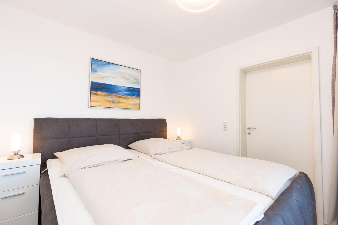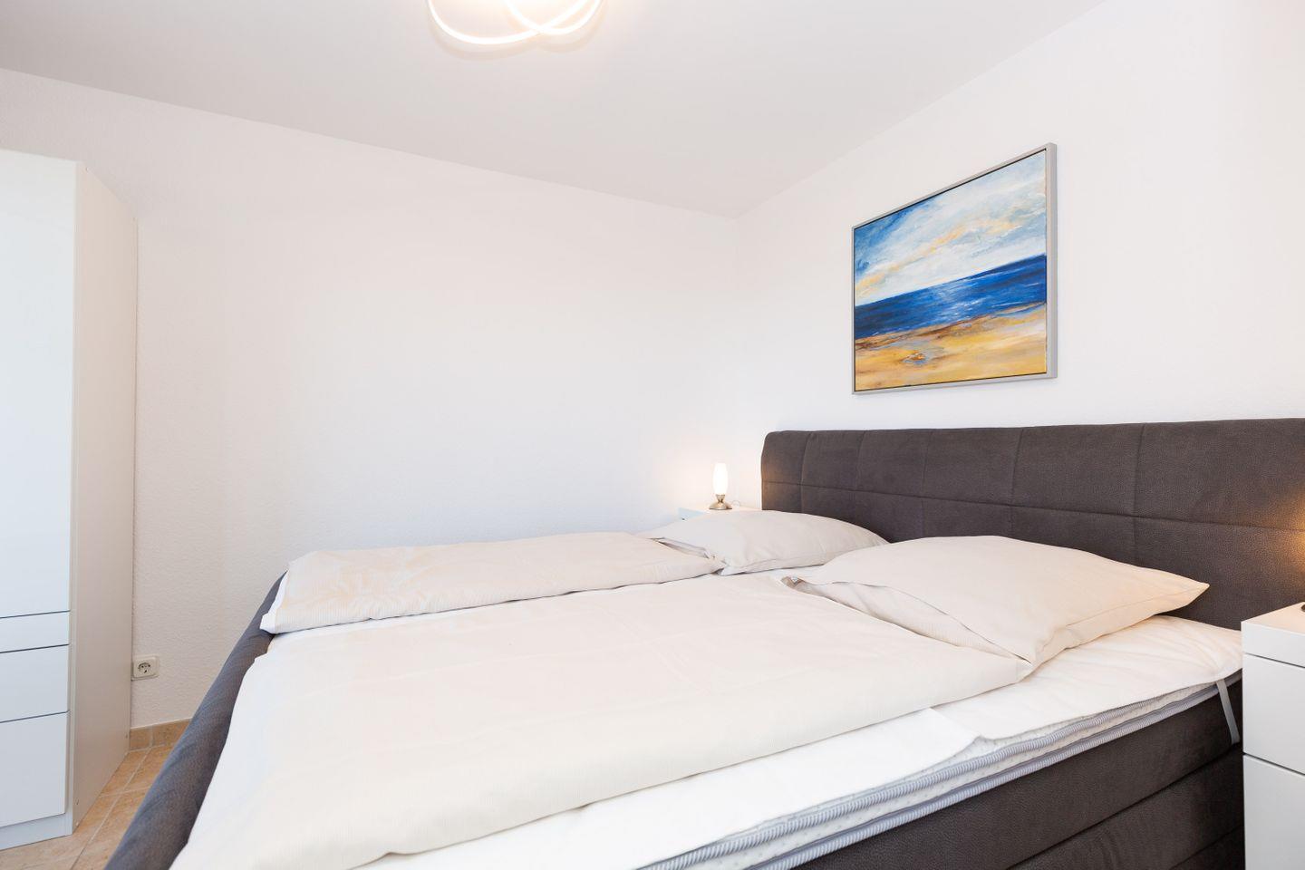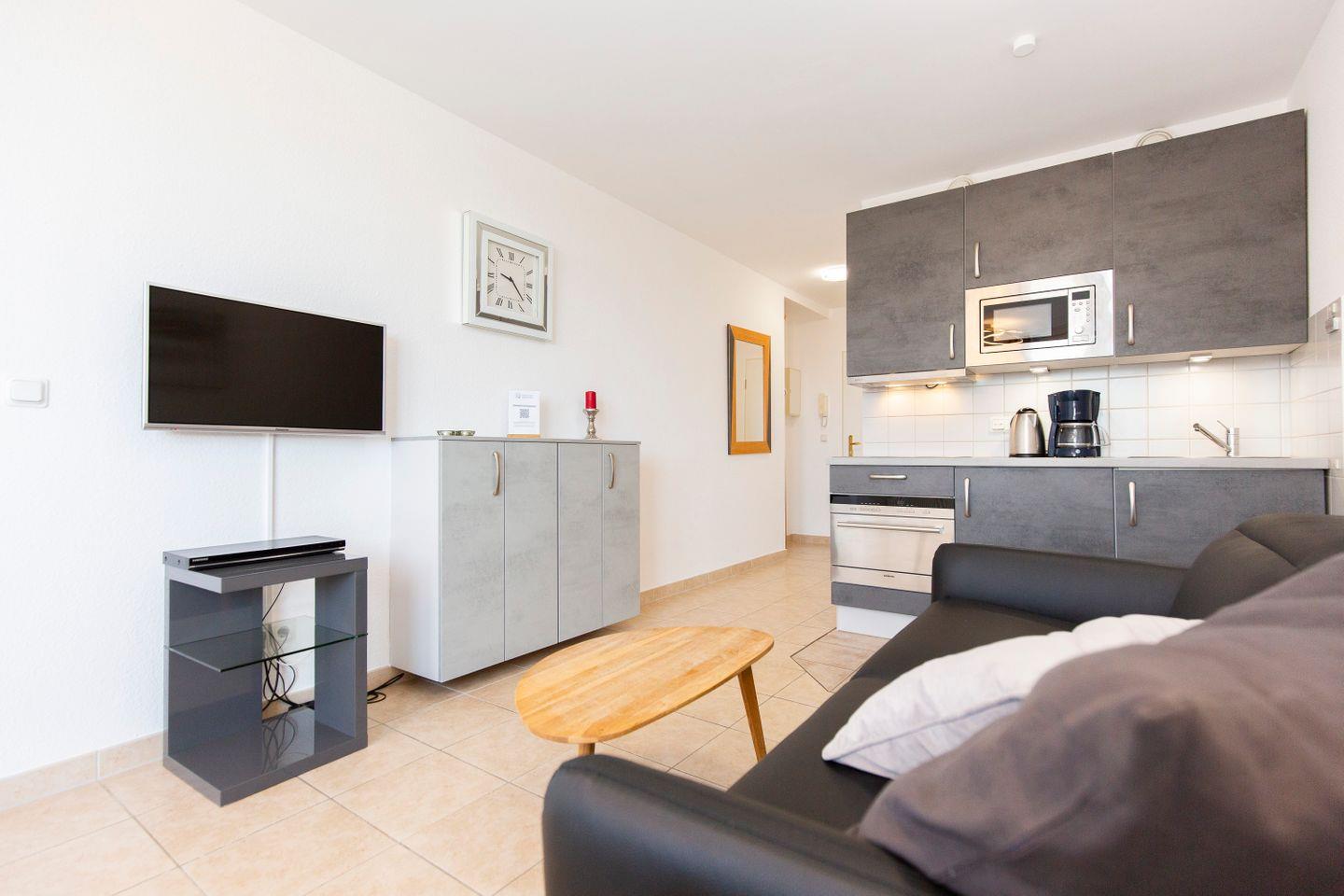 Haus "Kurpark-Residenz", Typ A, App.-Nr. "241", bis 2 Personen, 2. OG, ca. 38 m² Größe, Nordseite (Seeseite, Blickrichtung "Elbmündung"), Wohnzimmer mit Couch, sep. Schlafzimmer mit Boxspringbett (großes Laken), Dusche/WC, Küchenzeile mit Mikrowelle, Loggia, SAT-TV, kostenl. W-Lan Zugang im App., Tiefgaragenstellplatz, Strandkorb im Sommer 2026.