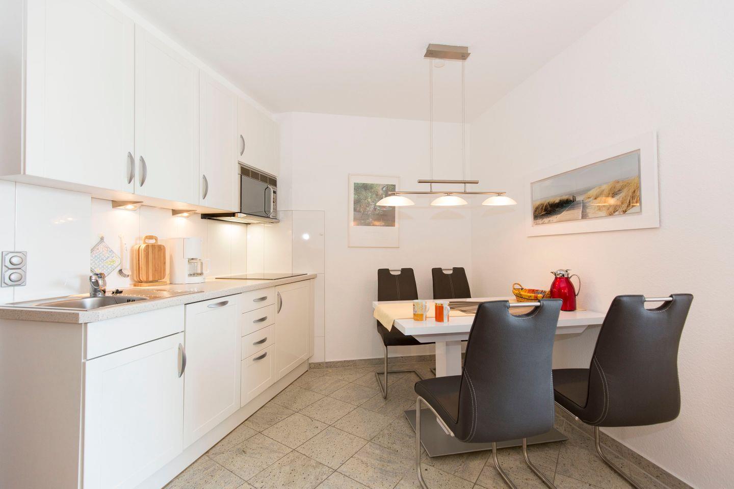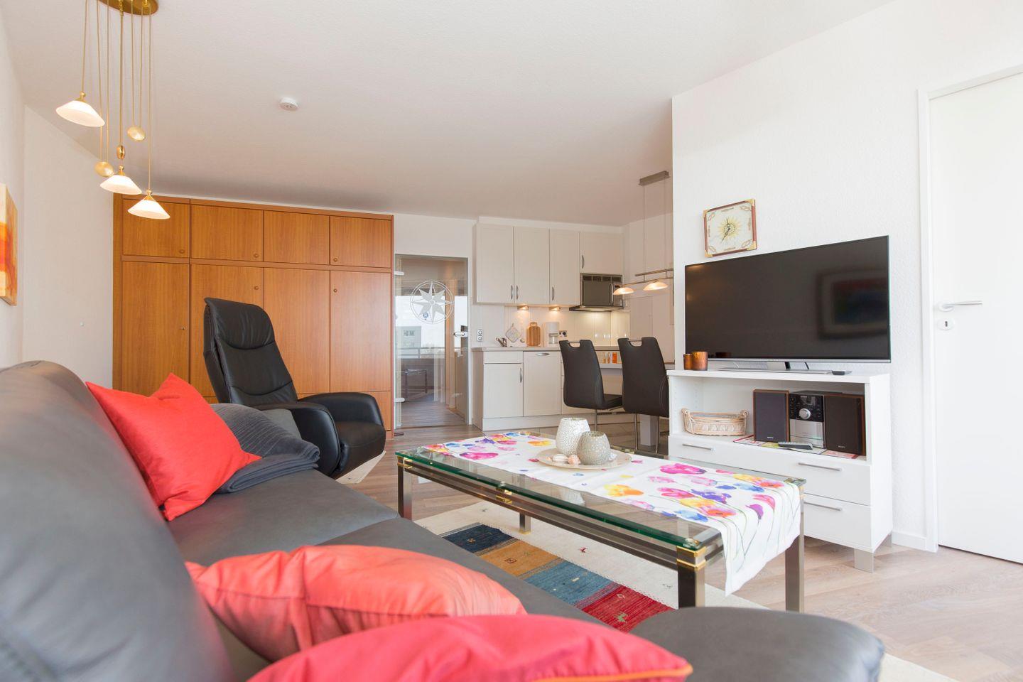 Haus "Lord Nelson", Typ 2, App.-Nr. 616, bis 4 Pers., ca. 40 qm, Weltschifffahrtsweg, seitlicher Meerblick/Richtung Kugelbake, Wohnbereich mit Schrankbett, Kinderzimmer mit Etagenbett, Dusche/WC/Föhn, Küchenzeile mit 4-Platten Ceranfeld, Geschirrspüler und Mikrowelle, Balkon, Kabel-TV, kostenl. W-Lan Zugang im App., Tiefgaragenstellplatz, Nichtraucherappartement, keine Haustiere erlaubt, Strandkorb im Sommer 2026.
