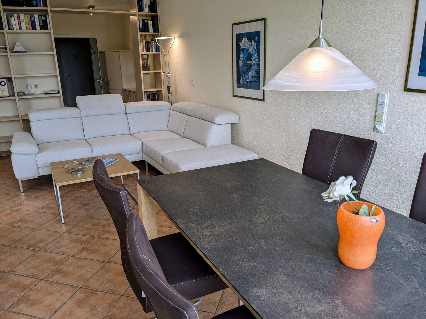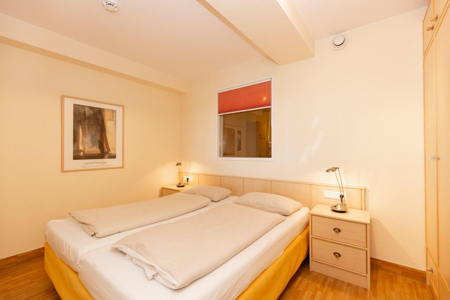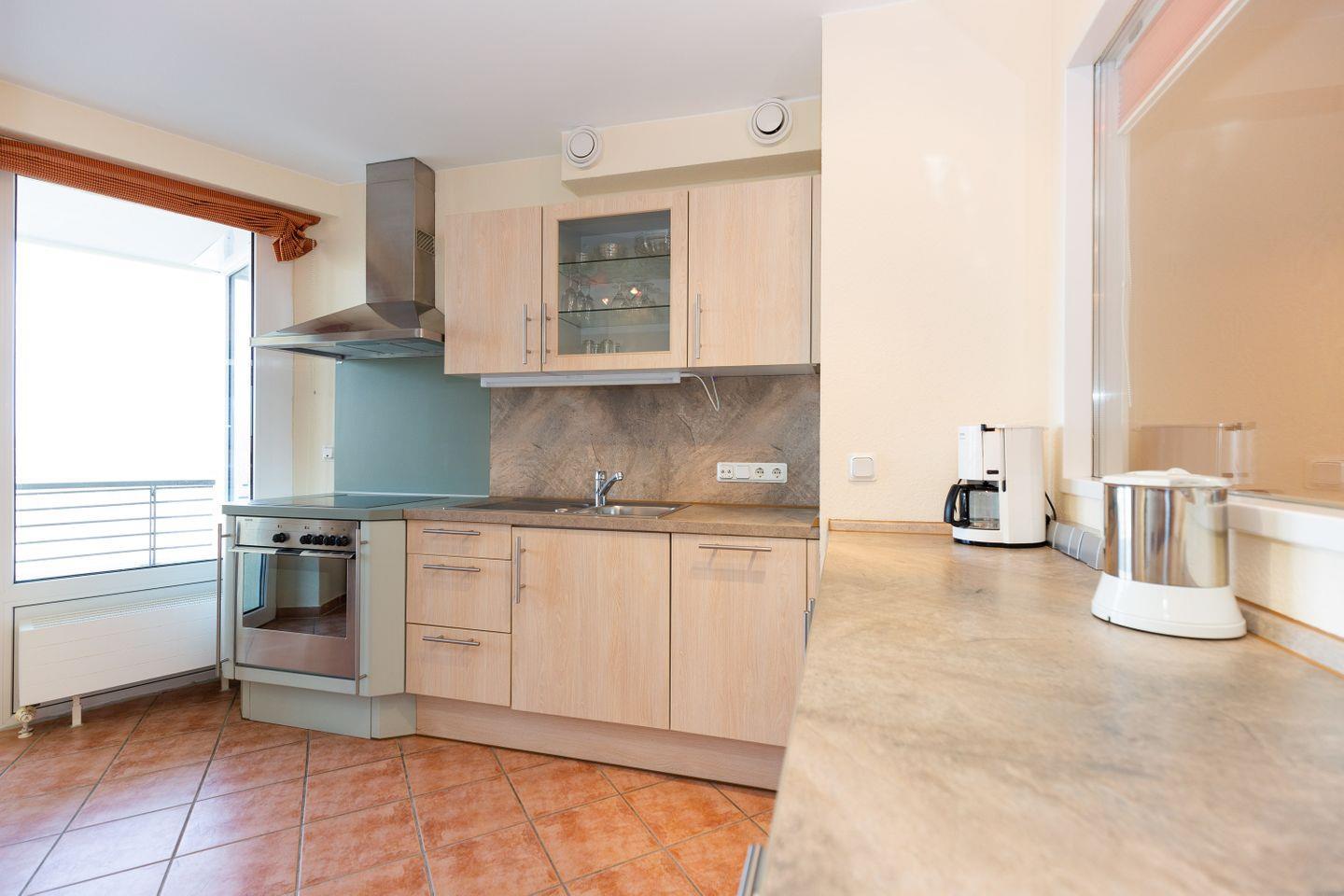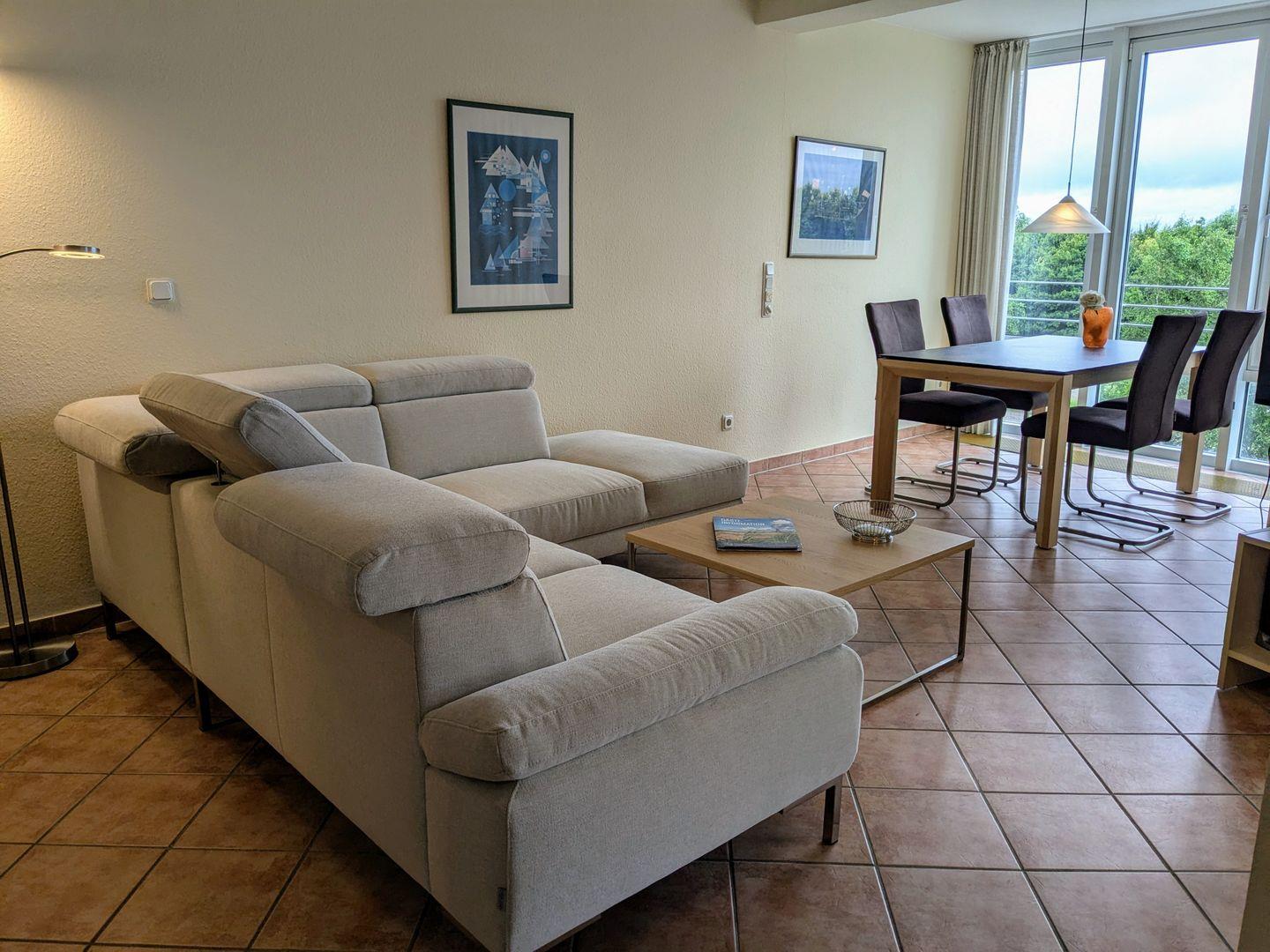 Haus "Kurpark-Residenz", Typ D2, App.-Nr. "242", bis 4 Personen, 2. OG, Nordseite (Seesicht Richtung "Elbe"), ca. 67 m² Größe, Wohnzimmer, sep. Schlafzimmer mit Doppelbett (innenliegend), sep. Kinderzimmer mit Etagenbett (innenliegend), Dusche/WC, Küchenzeile mit Mikrowelle, Backofen und Geschirrspüler, Raucher App., Loggia, SAT-TV, WLAN, Tiefgaragenstellplatz, Strandkorb im Sommer 2025.