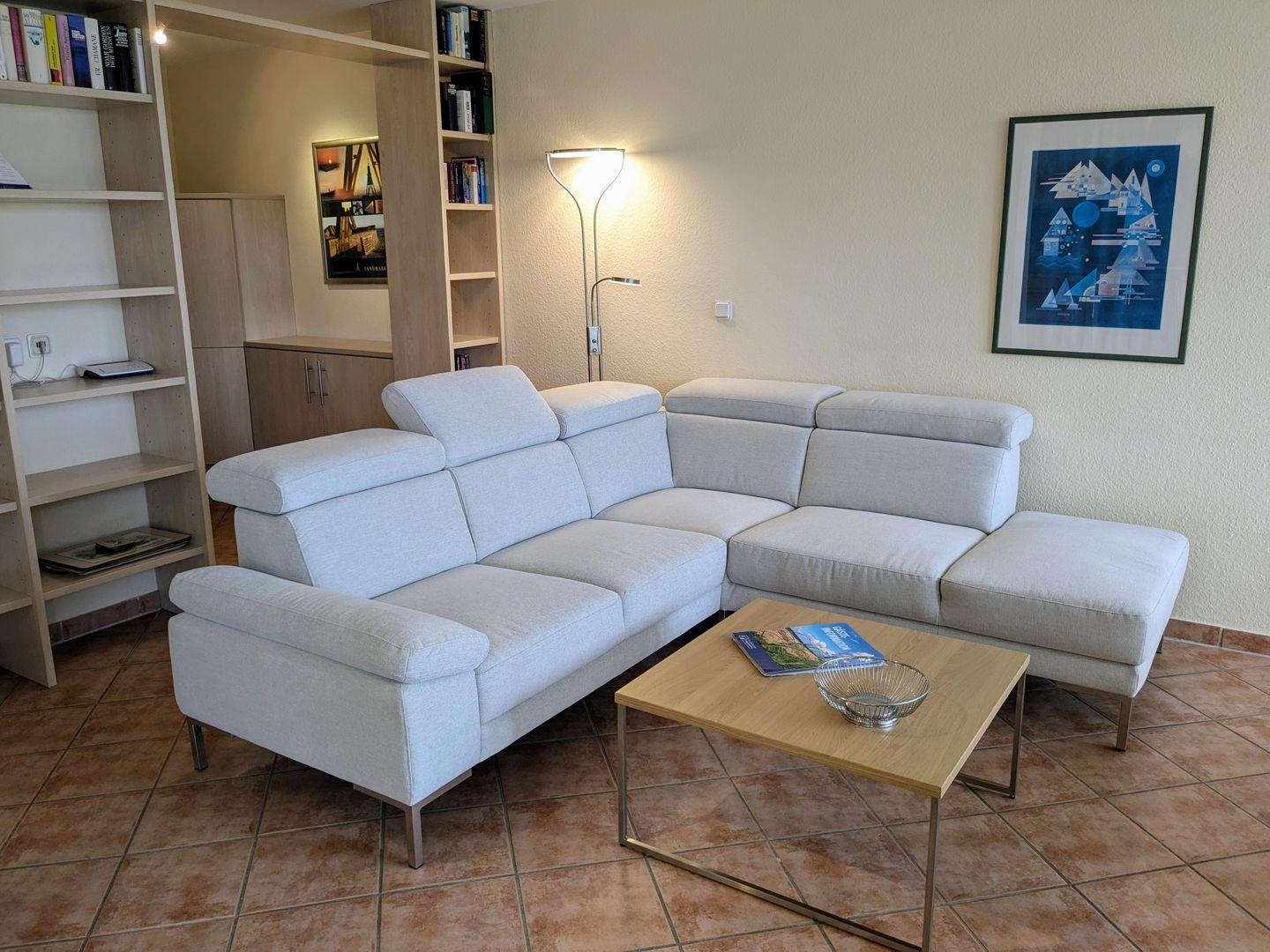Das Highlight der Loggia ist der Blick auf die Elbmündung und den Weltschifffahrtsweg. Unter freiem Himmel können es sich unsere Urlaubsgäste bequem machen und die passierenden Schiffe aus der Ferne beobachten.