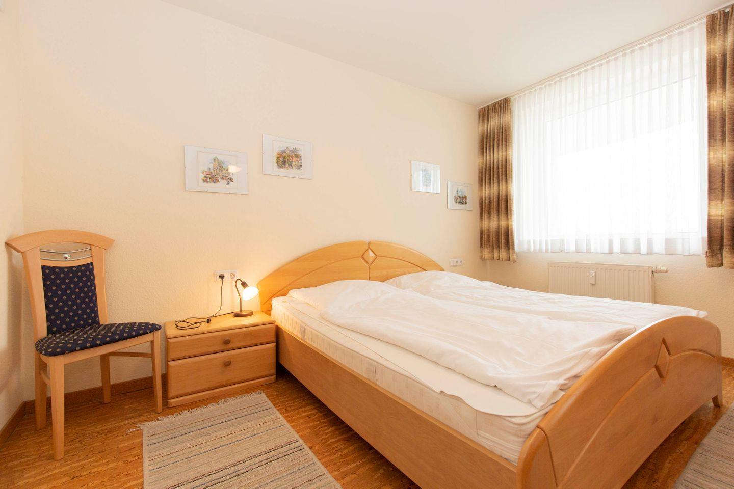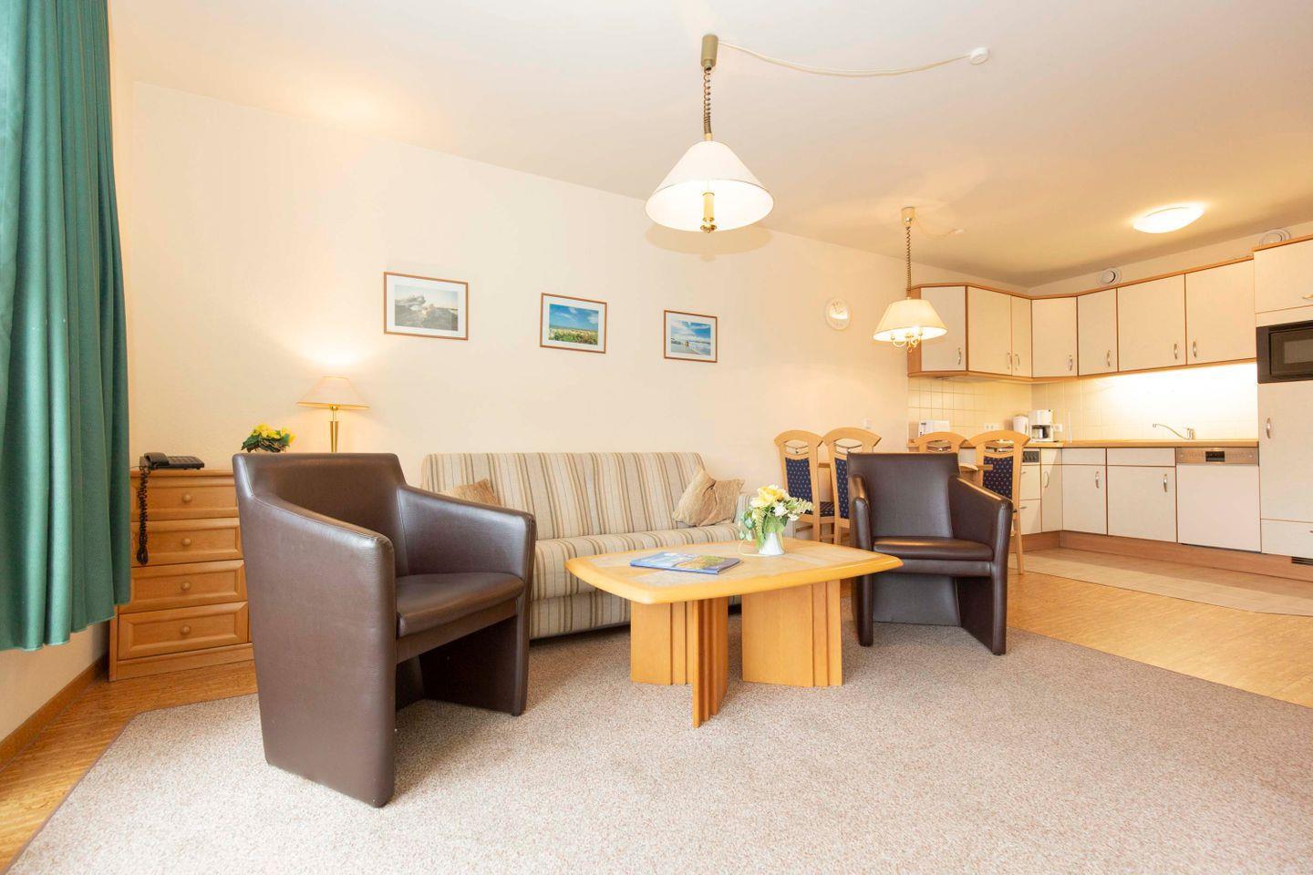 Haus "Kurpark-Residenz", Typ D2, App.-Nr. "209", bis 6 Pers., 2. OG, Ostseite (Richtung "Kugelbake"), ca. 68 m² Größe, Wohnzimmer mit Schlafcouch, sep. Schlafzimmer mit Doppelbett, sep. Kinderzimmer mit Einzelbetten (innenliegend), Dusche/WC, Gäste-WC, Küchenzeile mit Mikrowelle und Geschirrspüler, Loggia, Telefon, SAT-TV, Tiefgaragenstellplatz, Hunde sind willkommen und für die Raucher steht ein Aschenbecher auf dem Balkon bereit. Strandkorb im Sommer 2026.