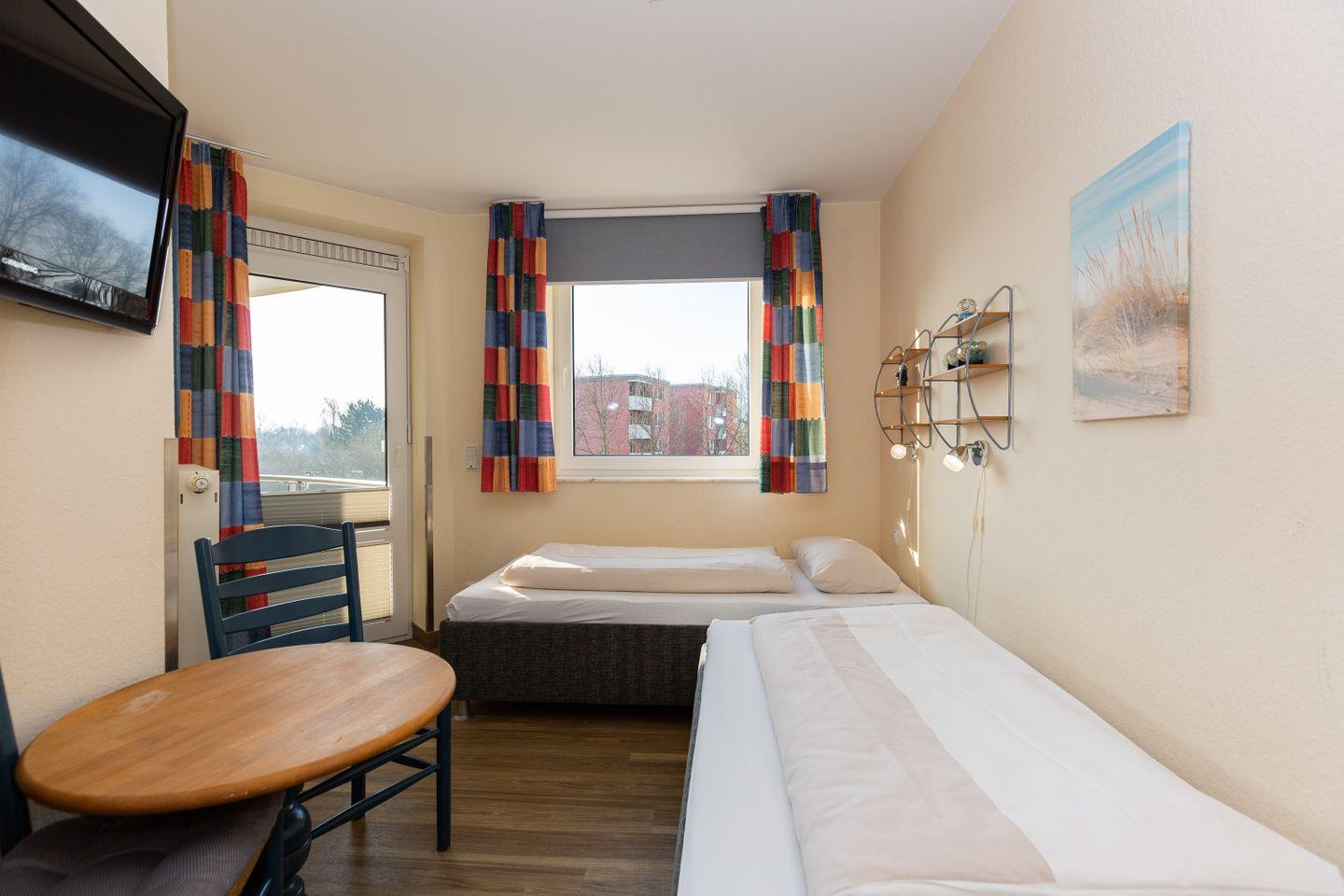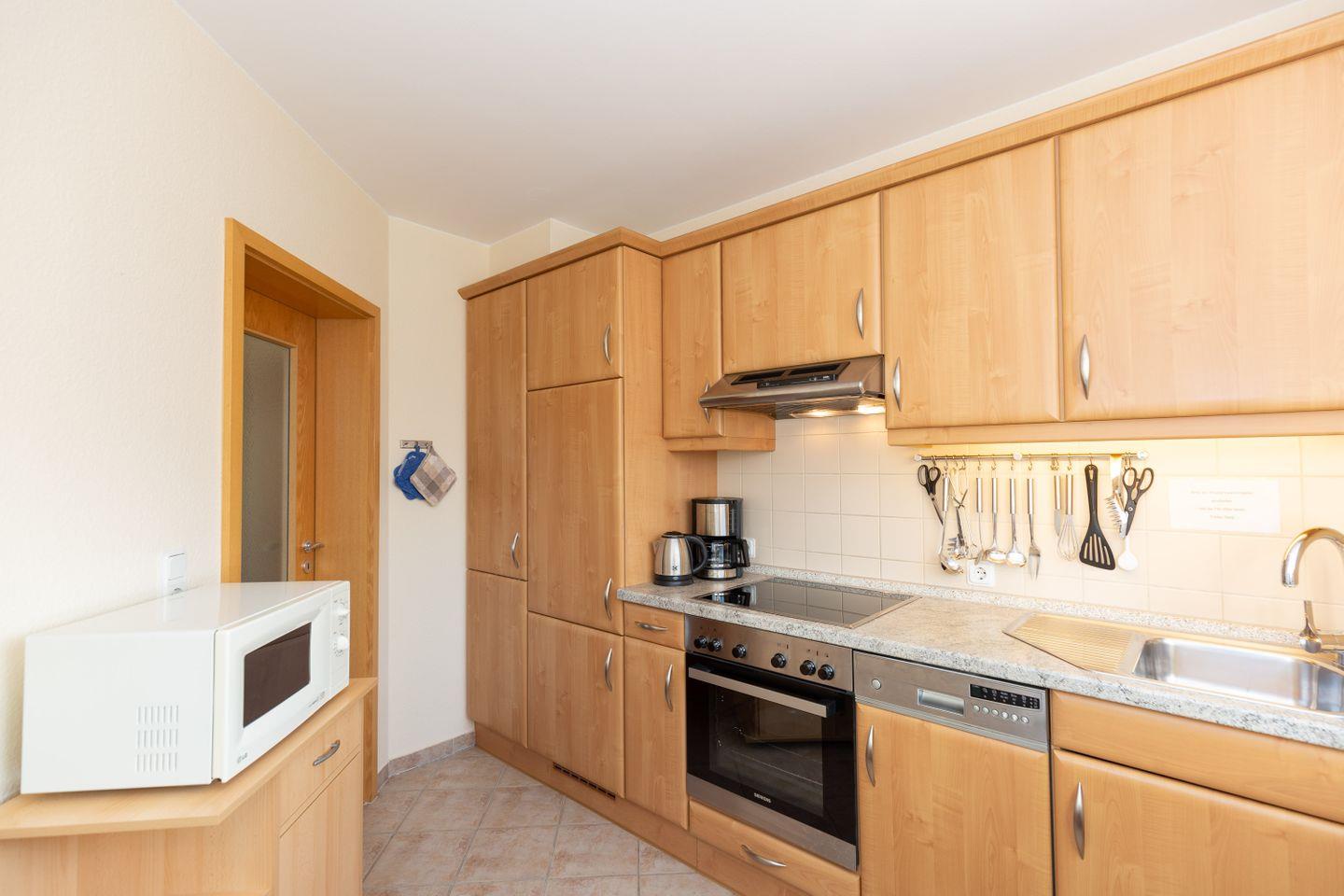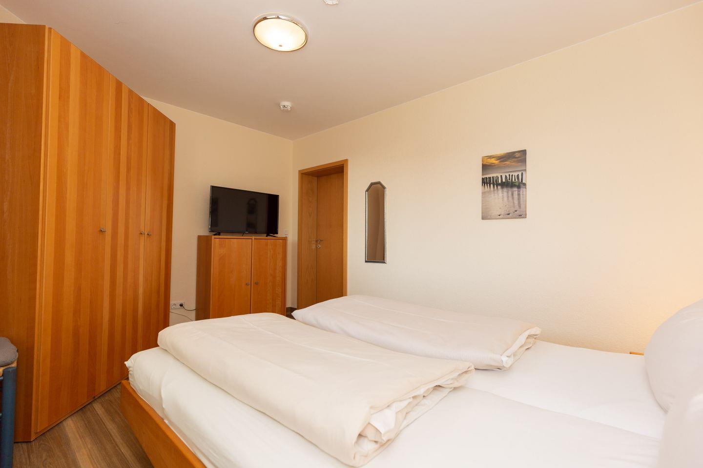 Haus "Kurpark-Residenz", Typ E2, Appartement-Nr. "123", bis 4 Personen, 1. OG, Südseite (Parkseite),ca. 75 m² Wohnungsgröße, Wohnzimmer, separates Schlafzimmer mit Doppelbett und TV, zweites separates Schlafzimmer mit Tageslicht, Einzelbetten und TV, Hochstuhl, Dusche/WC, separate Küche mit Mikrowelle, Backofen und Geschirrspüler,