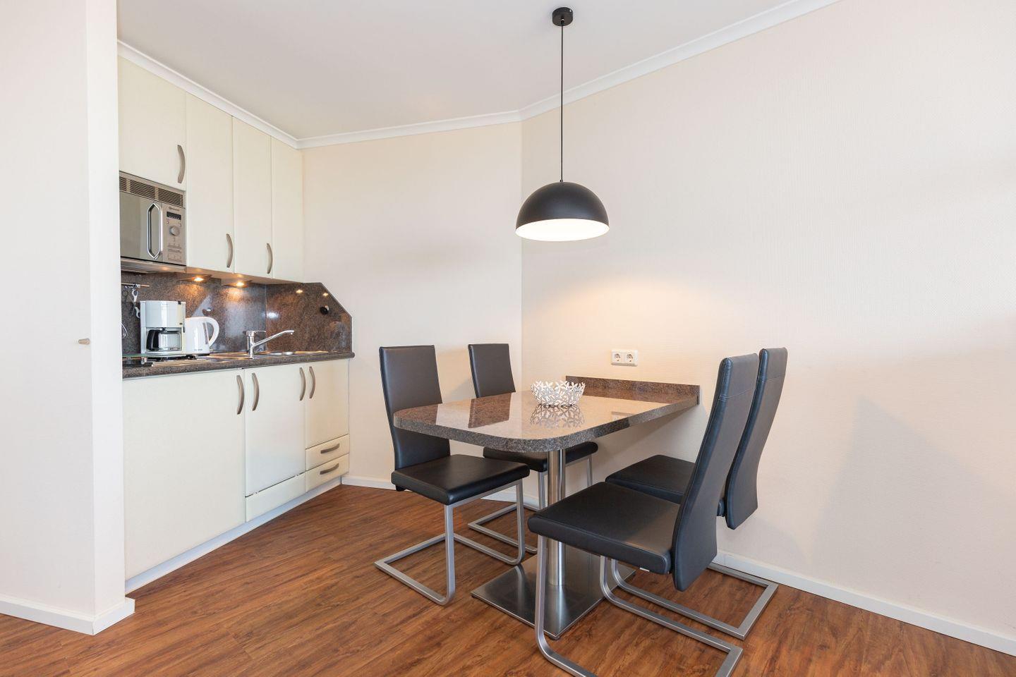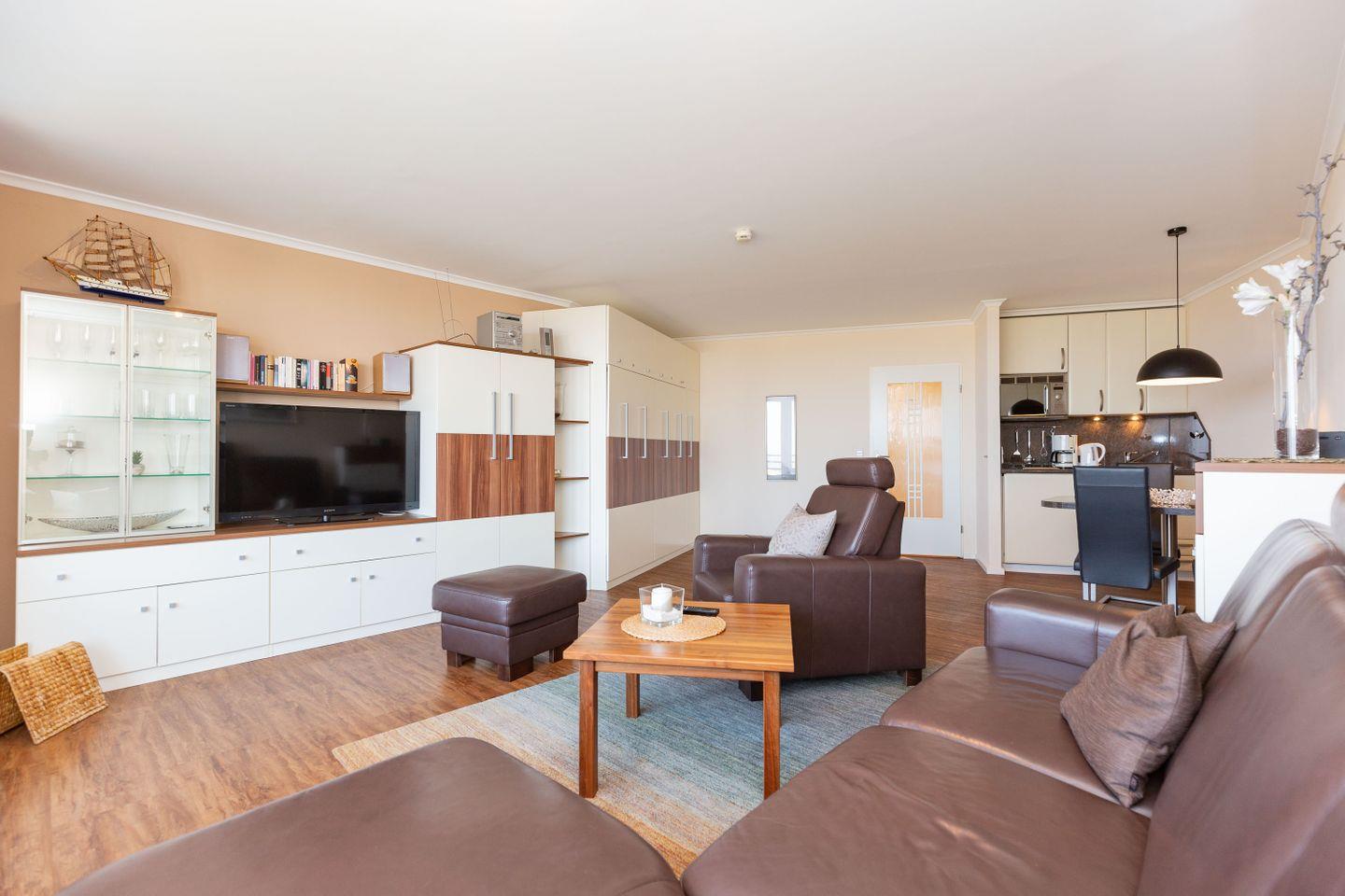 Haus "Lord Nelson", Typ 4, App.-Nr. 702, bis 2 Pers., 7.Etage, ca. 40 qm Größe, am Weltnaturerbe Wattenmeer (Meerblick Richtung Neuwerk), Wohnbereich mit Schrankbett, Dusche, WC, Küchenzeile mit Geschirrspüler und Mikrowelle, Balkon, Kabel-TV, kostenloser WLAN-Zugang im App., Garagenstellplatz, Nichtraucherwohnung, Haustiere nicht erlaubt, Strandkorb im Sommer 2025.