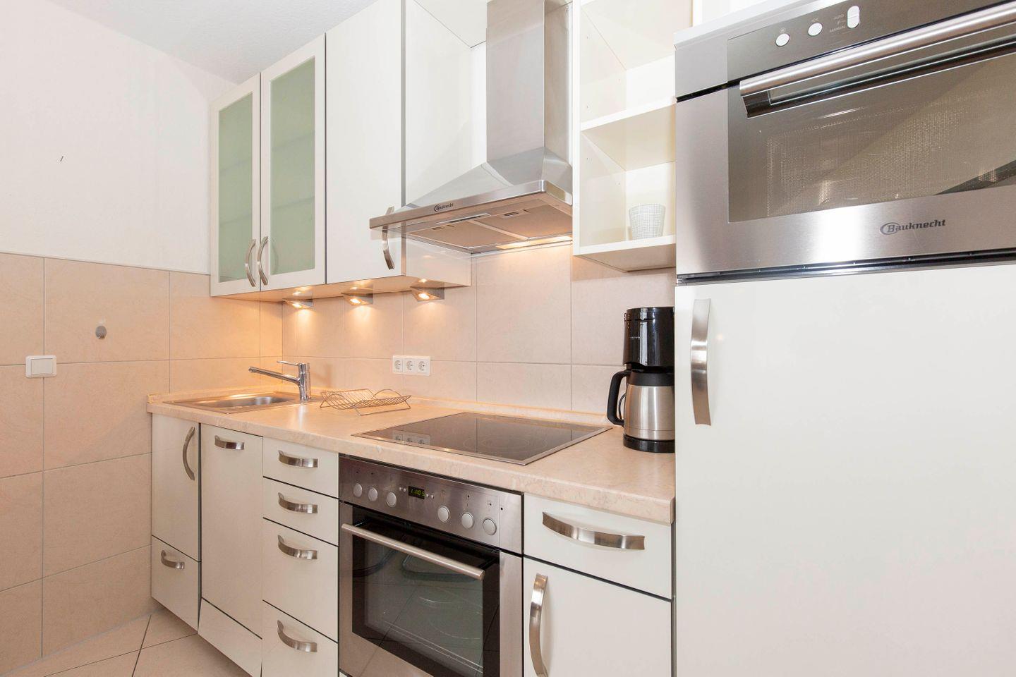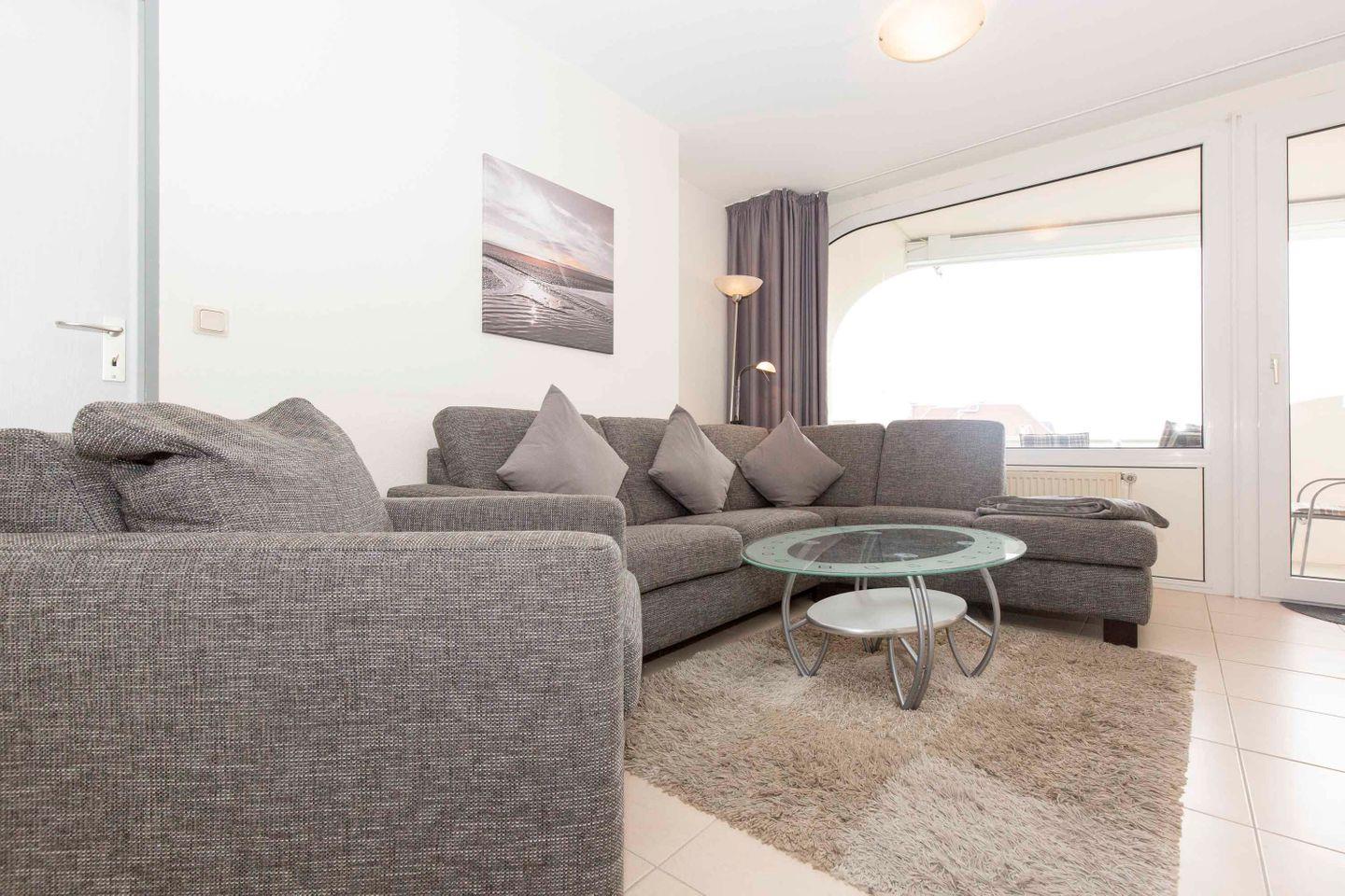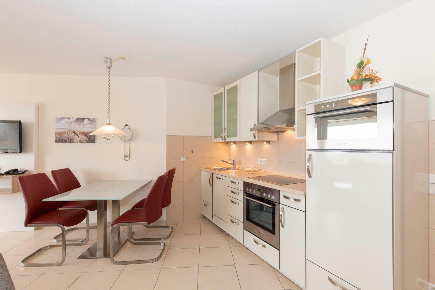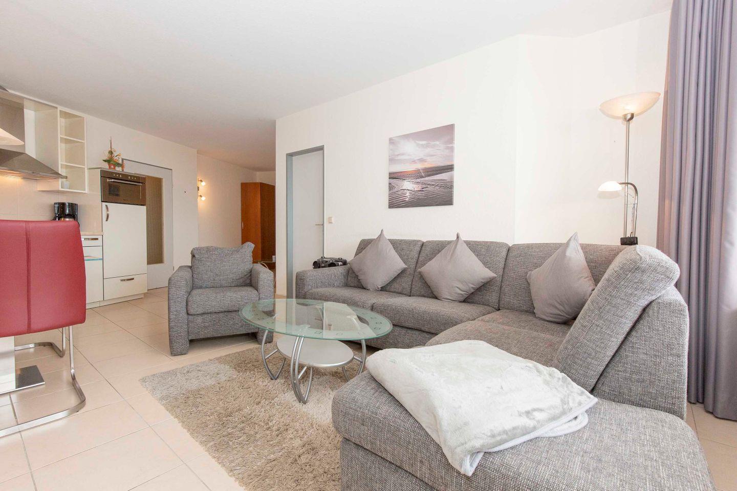 Haus "Trafalgar", Typ B, App.-Nr. "425", bis 4 Personen, 4. Etage, ca. 55 qm Größe, Westseite (Meerblick/Richtung Neuwerk), Wohn/Schlafraum mit Schlafcouch, sep. Schlafzimmer mit Doppelbett, Küchenzeile mit Mikrowelle/Geschirrspüler, Dusche/WC, das Appartement ist bis auf das Schlafzimmer gefliest, Balkon, Telefon, Kabel-TV, kostenl. W-LAN im App., Tiefgaragenstellplatz, Strandkorb im Sommer 2026, max. 2 Hunde pro Buchung gegen Gebühr erlaubt, Nichtraucher