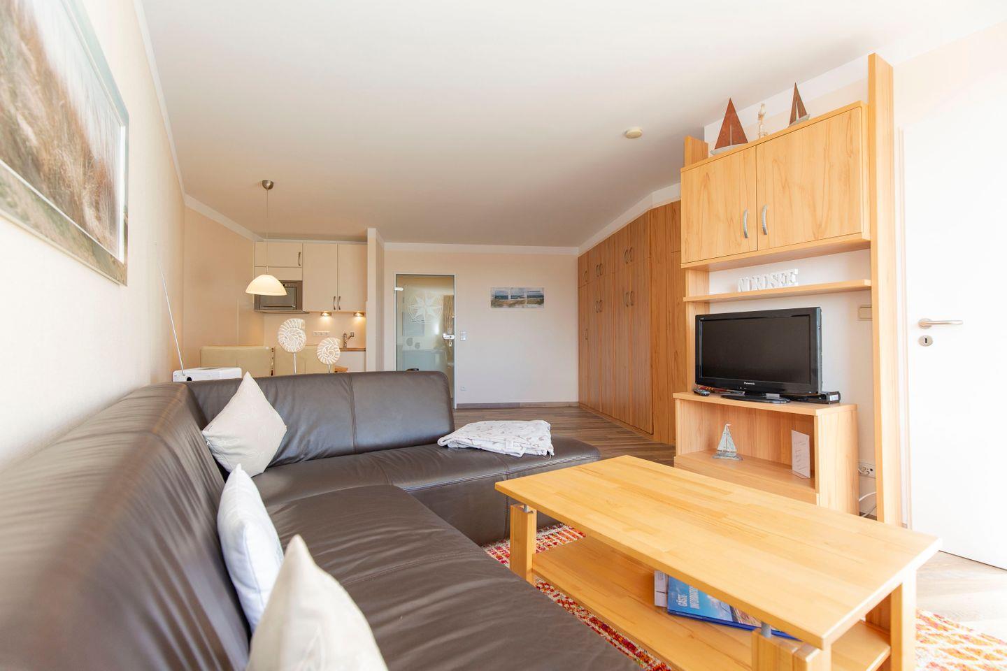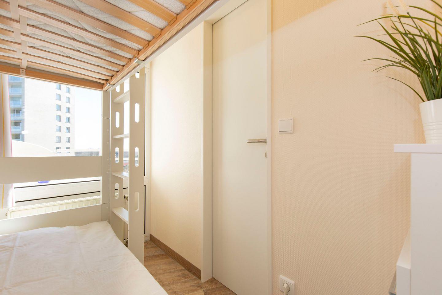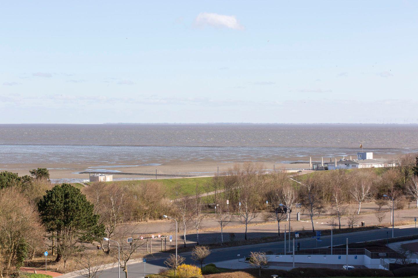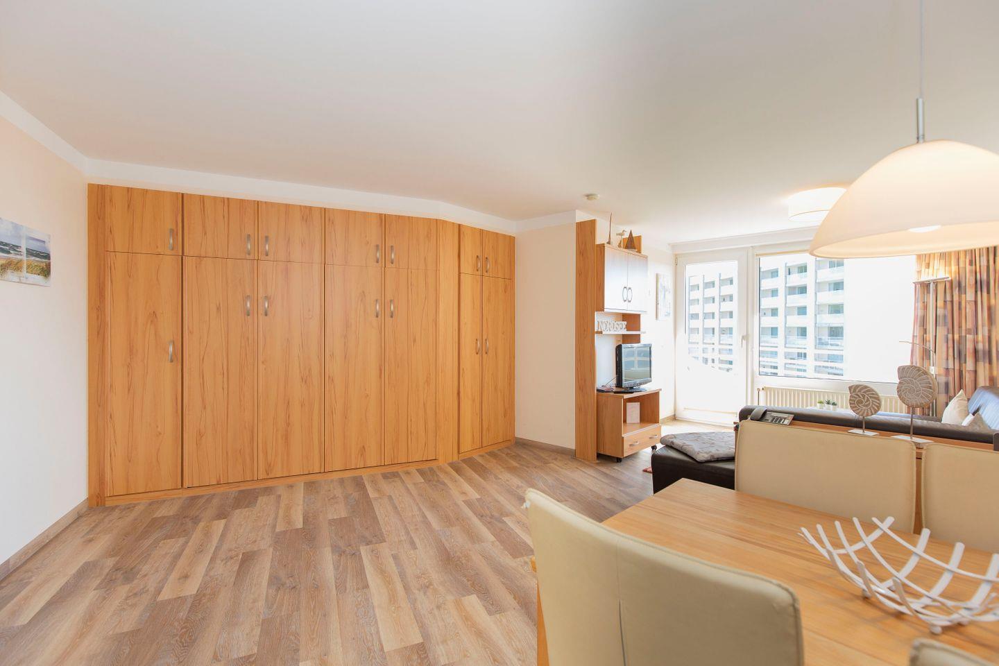 Haus "Lord Nelson", Typ 2, Appartement-Nr. "719", bis 4 Personen, 7. Etage, ca. 40 qm Wohnungsgröße, Weltschifffahrtsweg (seitlicher Meerblick Richtung Elbe), Wohnbereich mit Schrankbett einzeln klappbar, separates kleines Kinderzimmer mit Etagenbett, Dusche/WC, Küchenzeile mit Geschirrspüler und Mikrowelle, 2-Platten-Ceranfeld, Telefon, kostenl. WLAN-Anschluss im App., Kabel-TV, Balkon, Haustiere sind nicht erlaubt, Nichtraucherwohnung, Tiefgaragenstellplatz, Strandkorb im Sommer 2026.