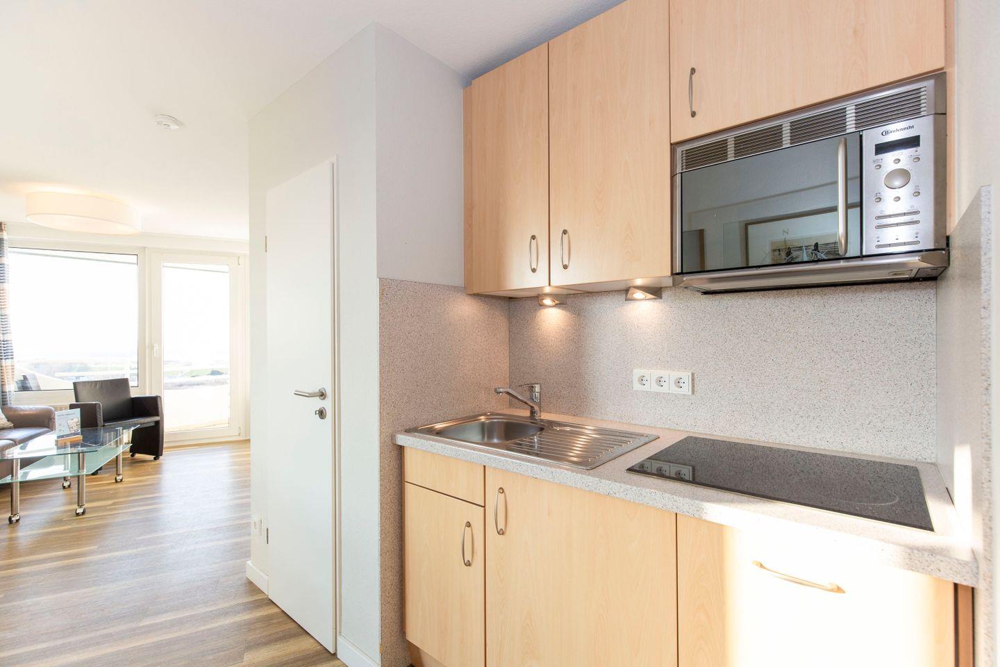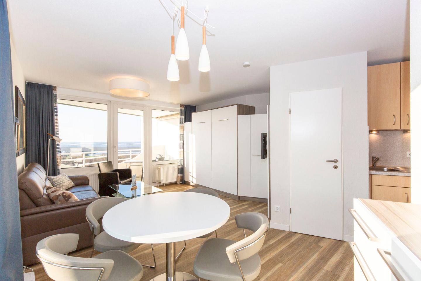 Haus "Lord Nelson", Typ 1, App.-Nr. "807", bis 4 Pers., 8. Etage, ca. 43 qm Größe, zur Westseite (Meerblick Richtung Neuwerk), Wohnbereich mit Schrankbett, sep. kleines Kinderzimmer mit Einzelbett und Schiffskojen-Bett sowie TV, Dusche/WC, Küchenzeile mit Geschirrspüler/Mikrowelle, Telefon, Kabel-TV, kostenl. WLAN-Anschluss im App., Balkon, Dachterrasse mit Strandkorb, Strandkorb im Sommer 2026, Tiefgaragenstellplatz.