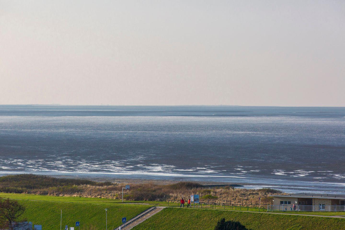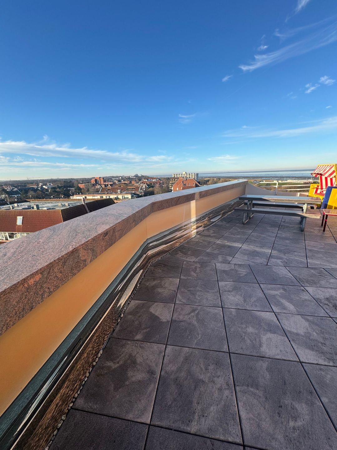 Neben einem möblierten Balkon erwartet Sie eine große Dachterrasse, die mit einem Strandkorb und rustikalen Holzmöbeln bestückt ist. Mit Blick auf die Nordsee in Richtung Neuwerk können Sie hier den Urlaubstag in geselliger Runde ausklingen lassen. Ein absolutes Highlight.