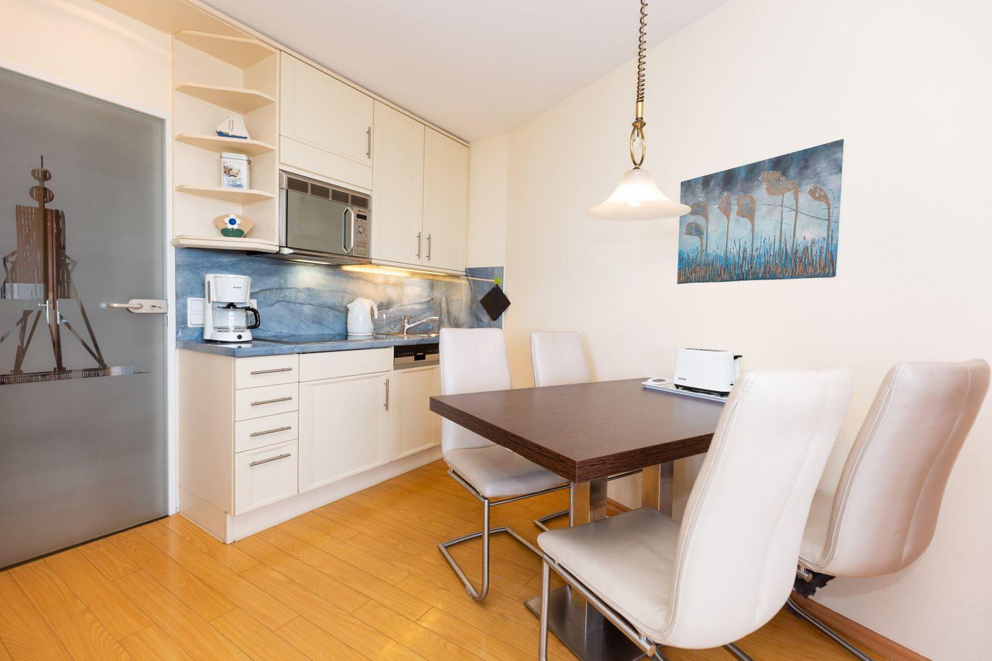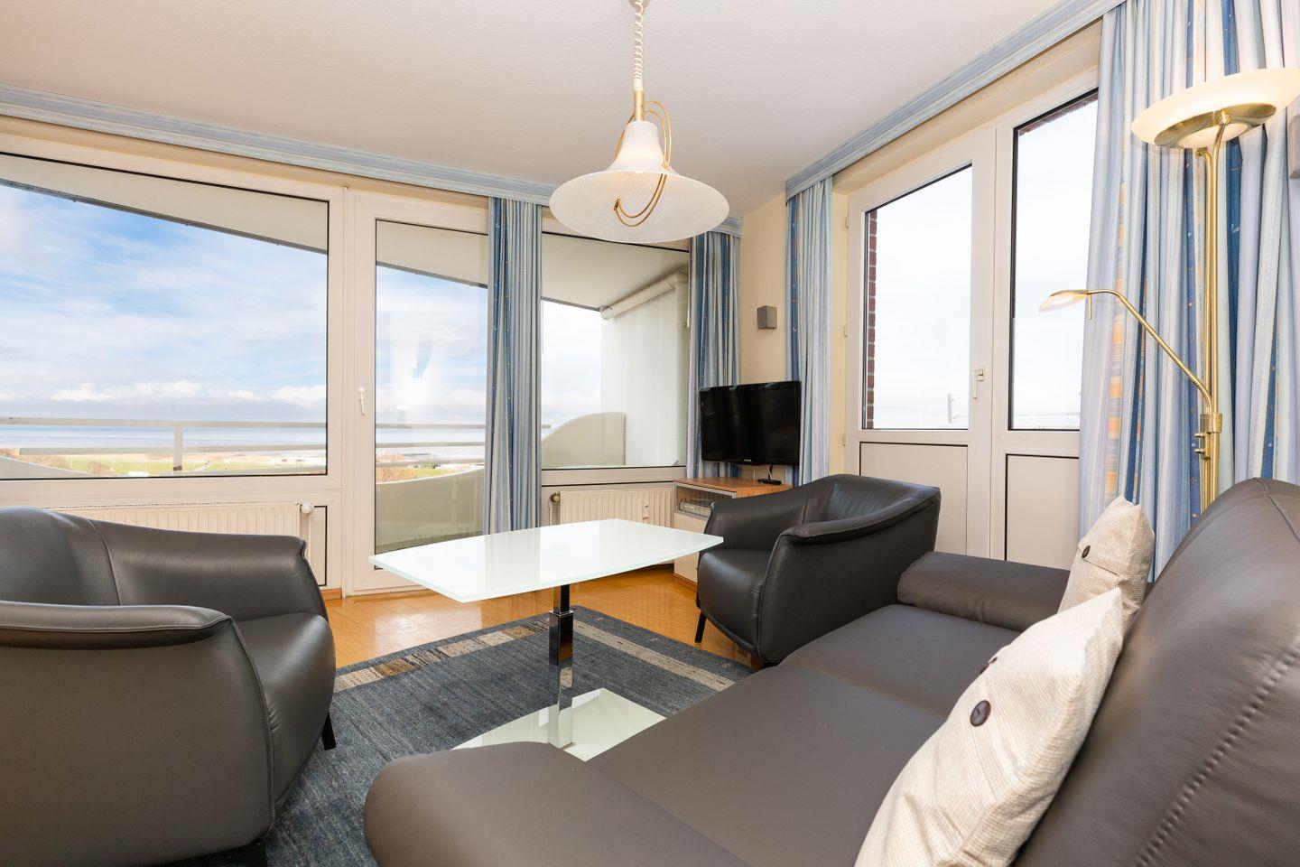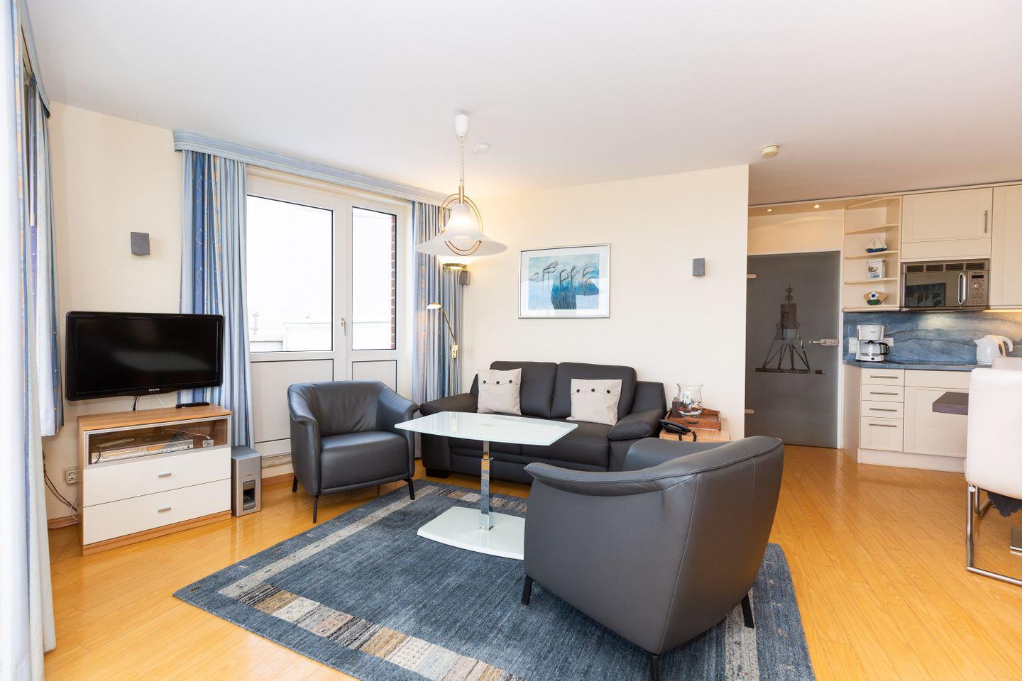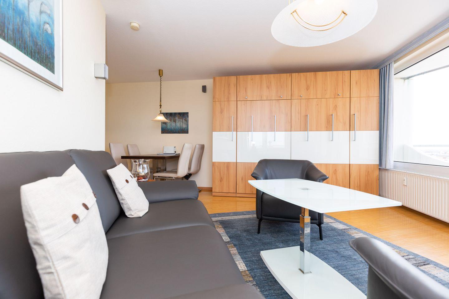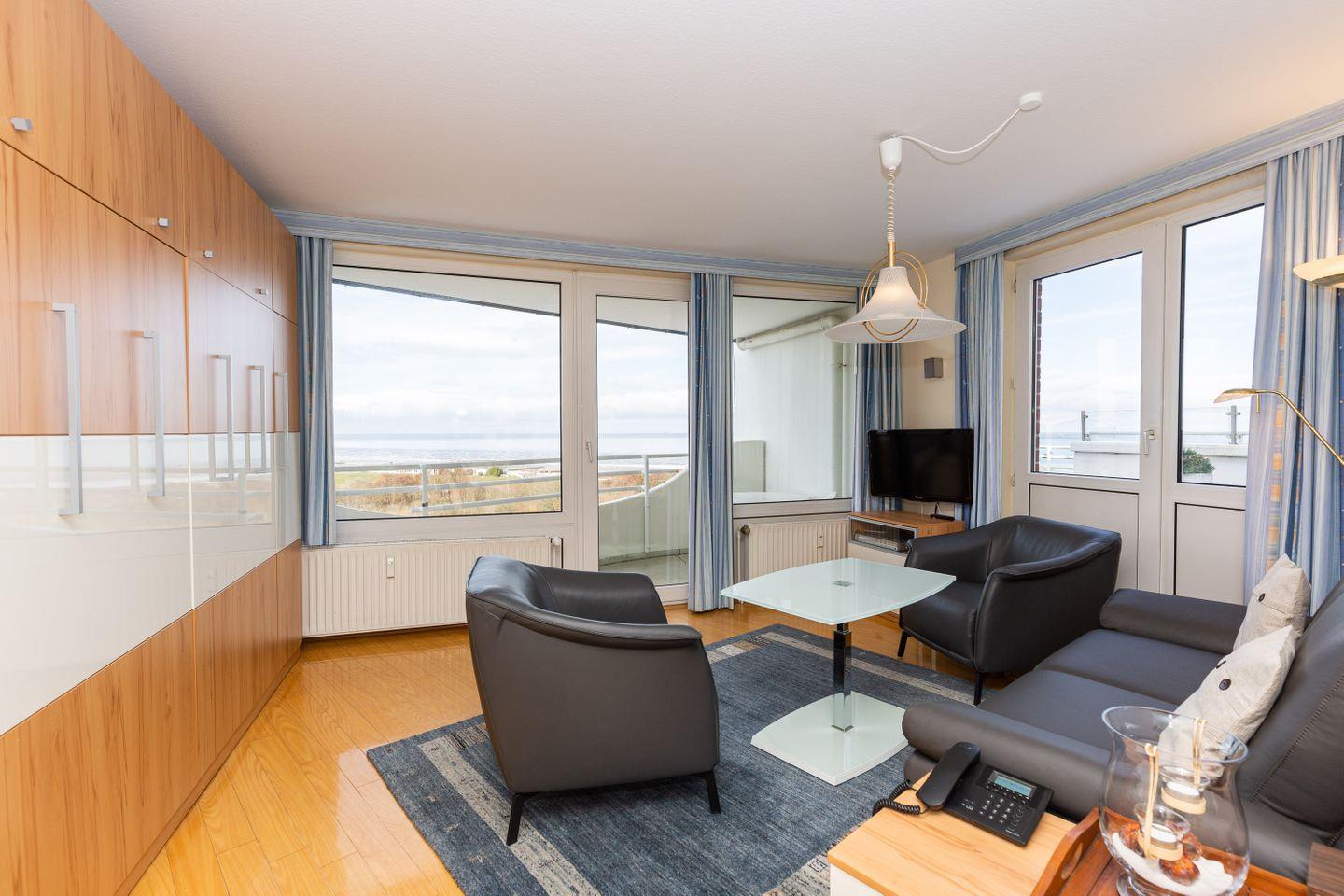Haus "Lord Nelson", Typ 1, App.-Nr. "802", bis 4 Personen, 8.te Etage, ca. 43 qm Größe, Meerblick Richtung Neuwerk und Weltschifffahrtsweg, Wohnbereich mit Schrankbett, sep. Schlafzimmer mit französischem Bett (1,40 x 2,00), und Schiffskojen-Klappbett, Dusche/WC, Küchenzeile mit Geschirrspüler, Mikrowelle, Telefon, Kabel-TV, kostenl. WLAN-Zugang im App., Nichtraucherwohnung, Balkon, große Dachterrasse mit Strandkorb (ca. 40 qm), Tiefgaragenstellplatz, Strandkorb im Sommer 2025.