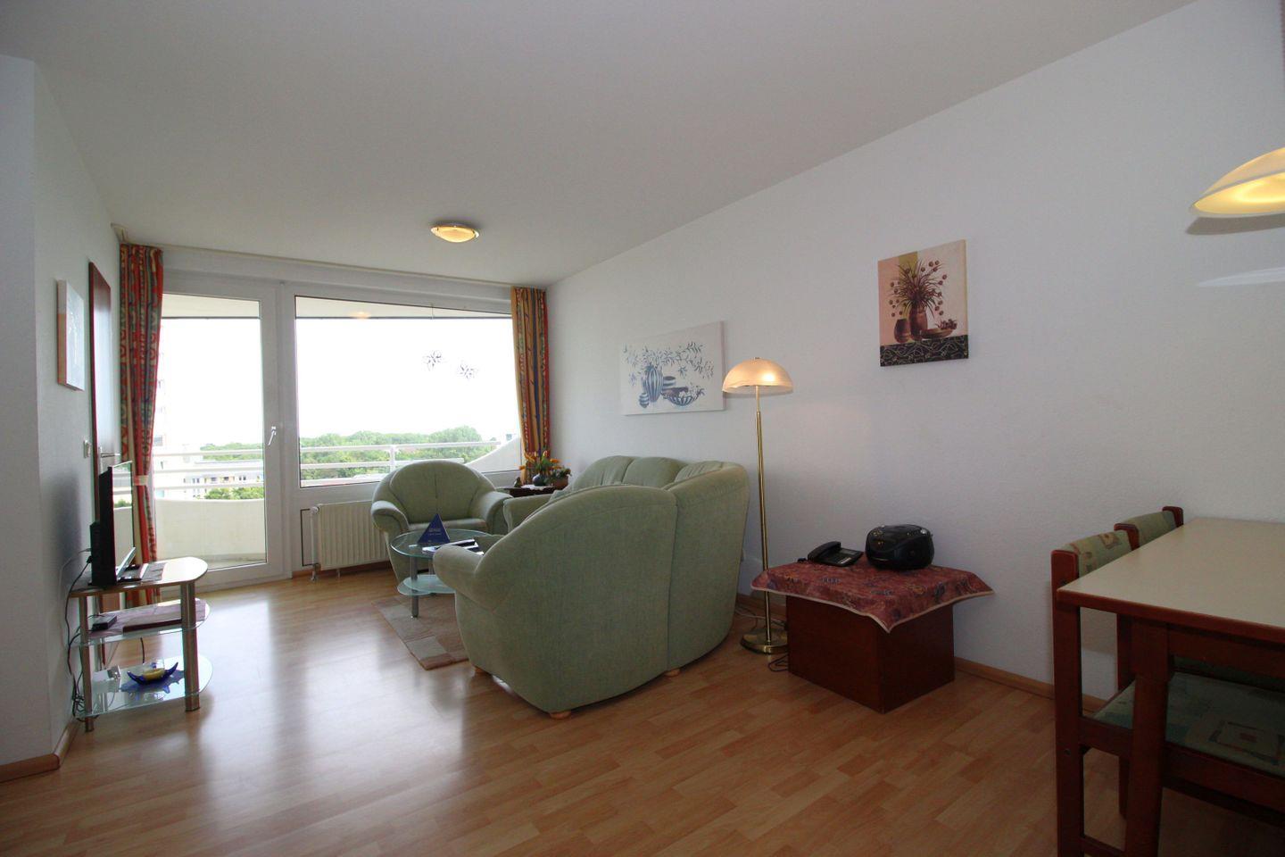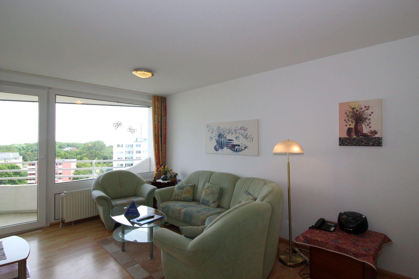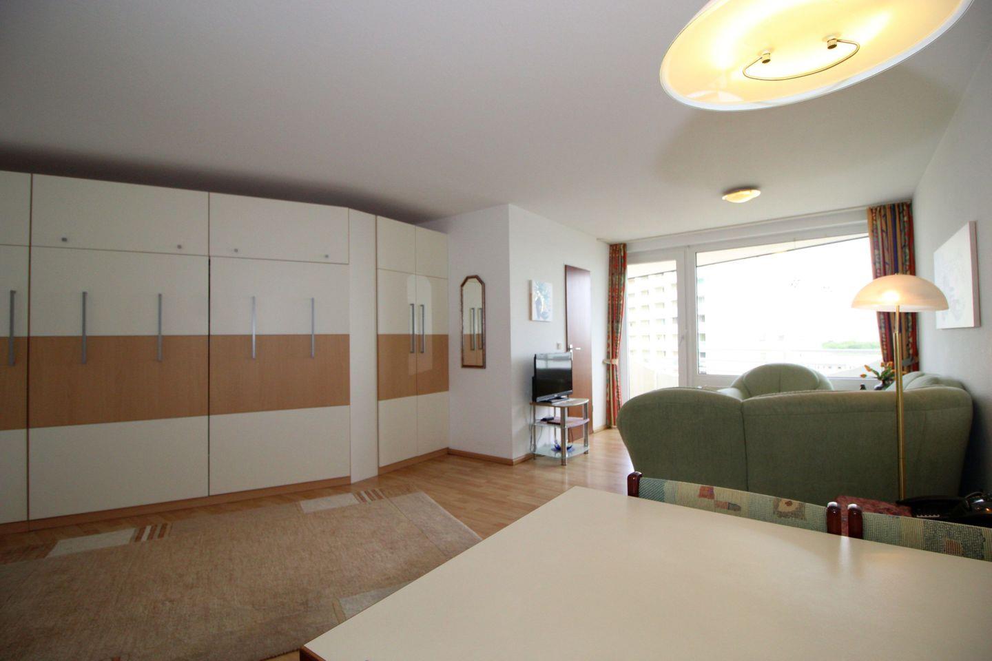 Haus "Lord Nelson", Typ 2, Appartement-Nr. "817", bis 4 Personen, 8. Etage, ca. 40 qm Wohnungsgröße, Weltschifffahrtsweg (seitlicher Meerblick Richtung Elbe), Wohnbereich mit Schrankbett, separates kleines Kinderzimmer mit Etagenbett, Dusche/WC, Küchenzeile mit Geschirrspüler und Mikrowelle/4 Platten-Ceranfeld, Telefon, Kabel-TV, Nichtraucher App., Balkon, Tiefgaragenstellplatz, Strandkorb im Sommer 2026, kostenloser WLAN-Zugang.