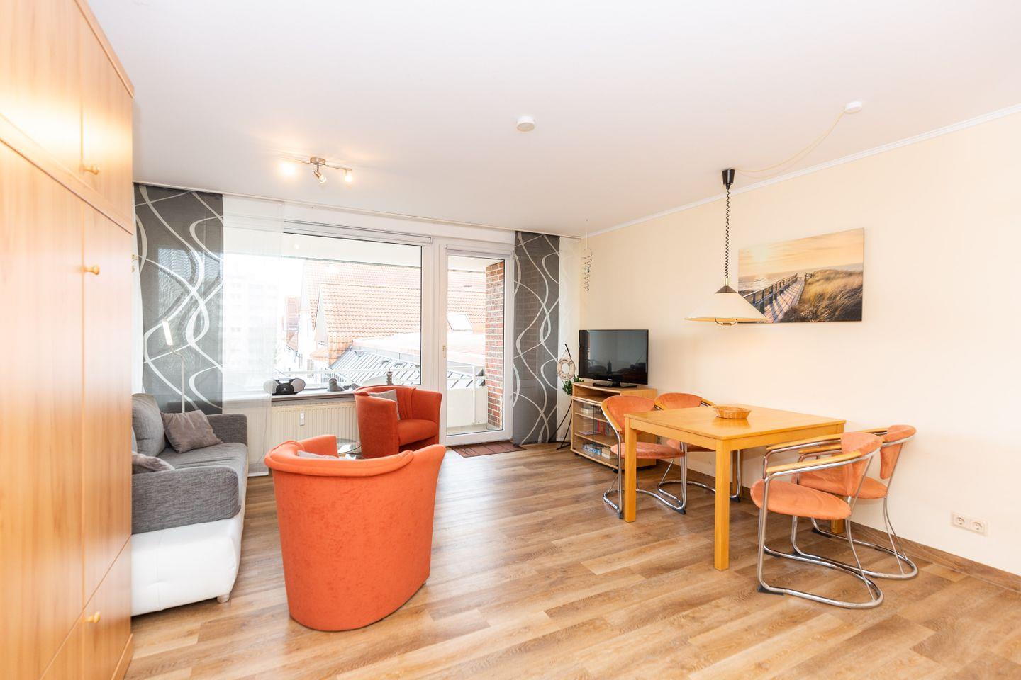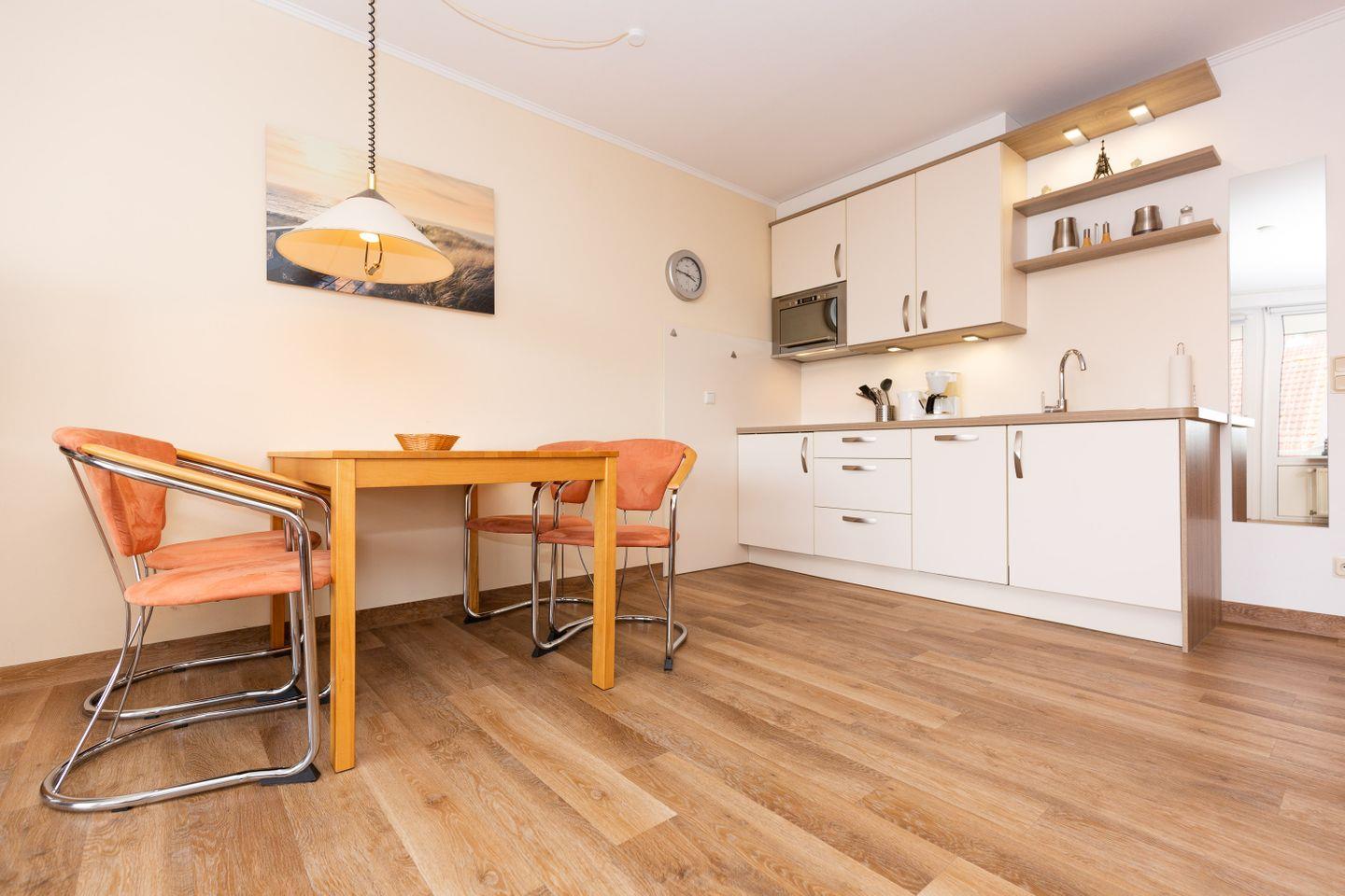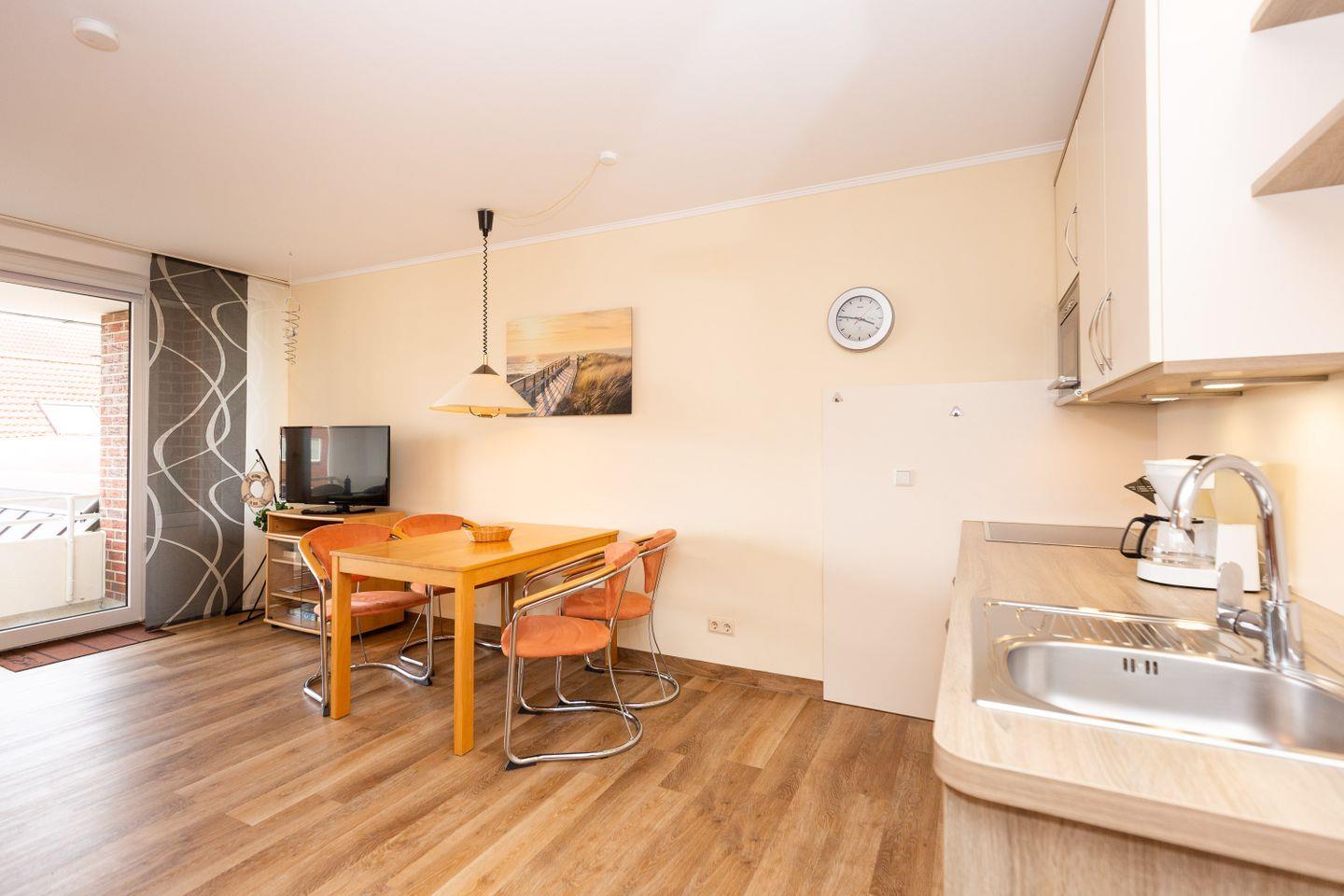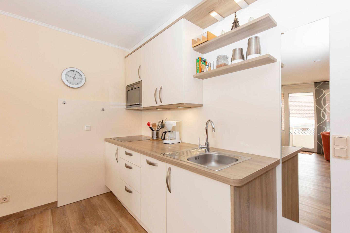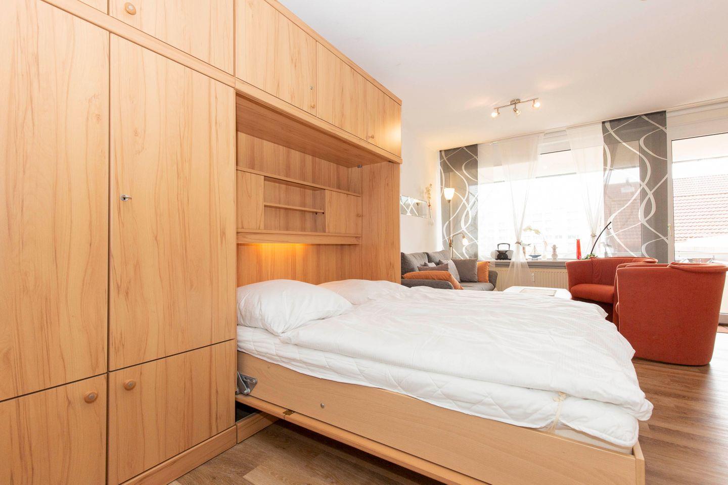 Haus "Trafalgar", Typ A, Appartement-Nr. 330, bis 2 Pers., 3. Etage, ca.34 qm, Ostseite (ohne Meerblick), Wohn/Schlafbereich mit Schrankbett (140m breit), Küchenzeile mit Mikrowelle, Geschirrspüler, 4 Platten Ceranfeld , Dusche/WC, Balkon, Kabel-TV (Flachbildschirm), W-Lan Zugang im App, Tiefgaragenstellplatz, Haustiere sind nicht gestattet, Nichtraucherwohnung, Strandkorb im Sommer 2026, ab 5 Übernachtungen ein Wäschepaket pro Person inkl.