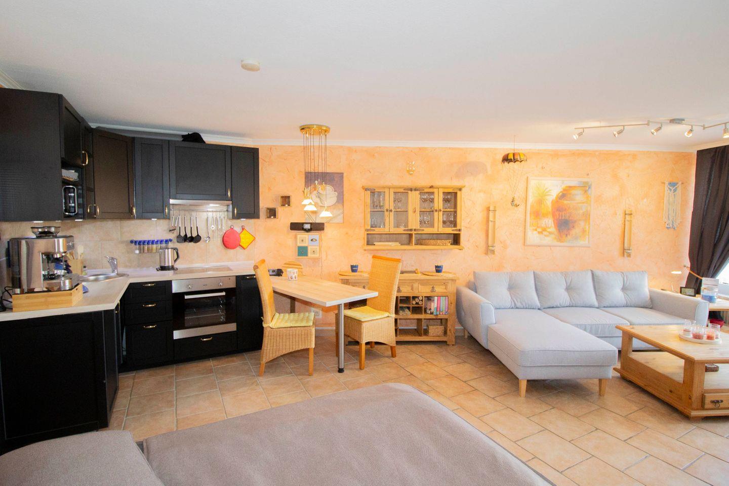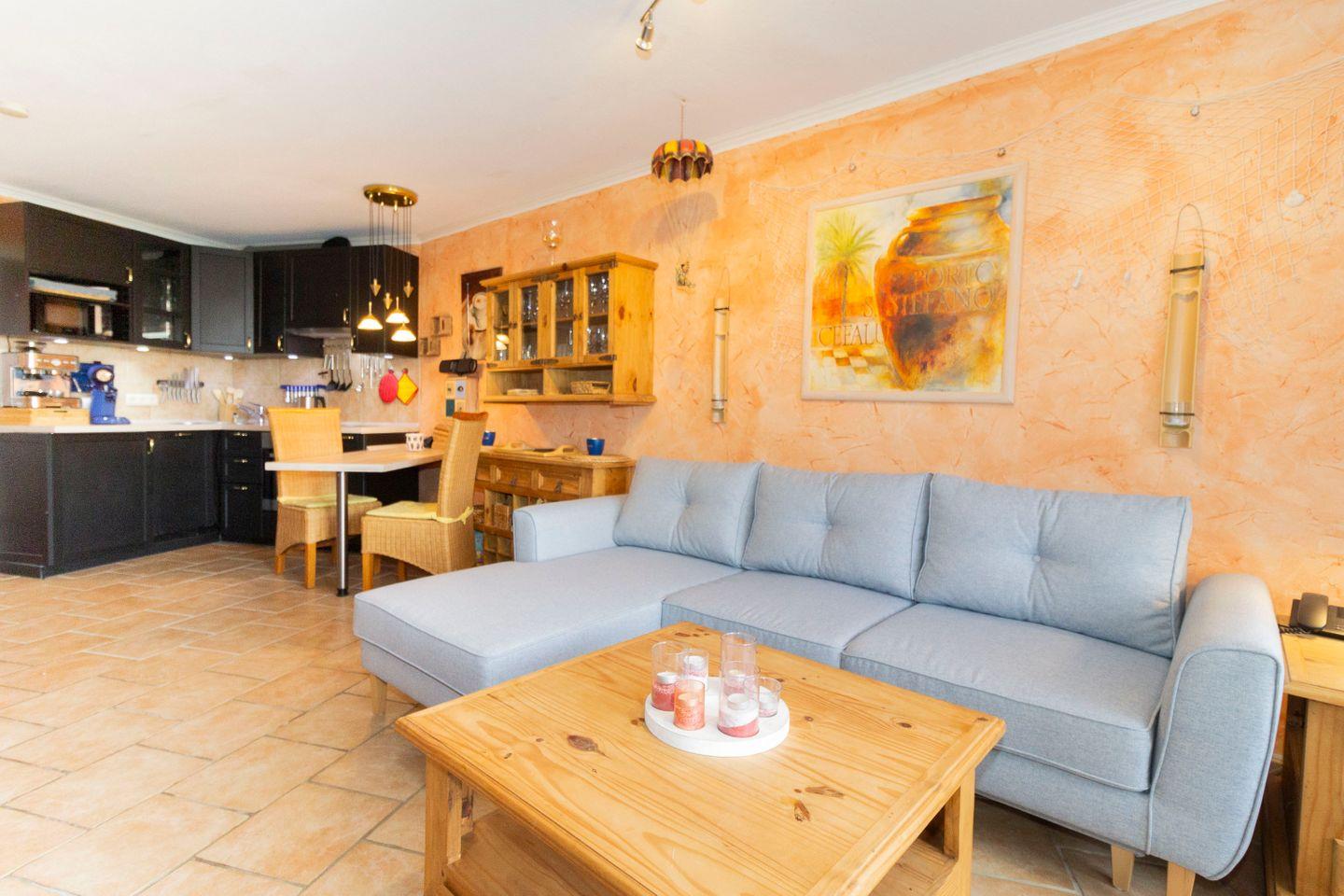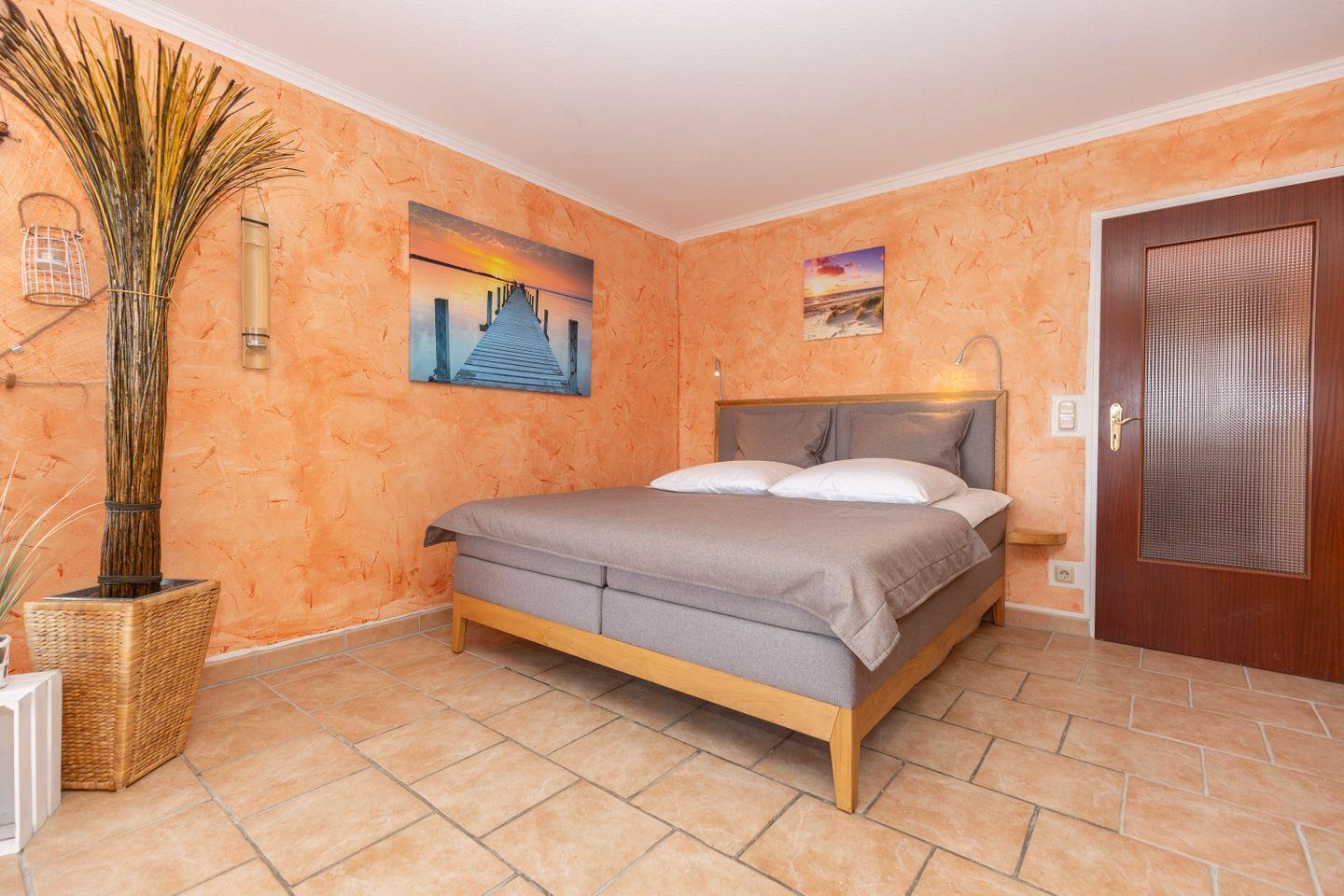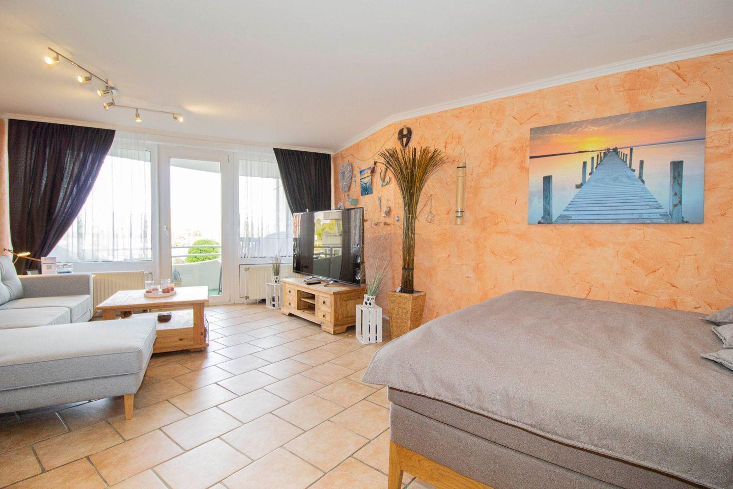 Die Ferienwohnung für 2 Personen (hundefreundlich) bietet helle warme Farben: Hier herrscht ein mediterraner Mix aus terrakottafarbenden Bodenfließen, einer lachsfarbenden Wandgestaltung und einer hellgrauen gemütlichen Couch. Hier fühlen Sie sich ein wenig wie am Mittelmeer, obwohl Sie sich in Cuxhaven befinden.
